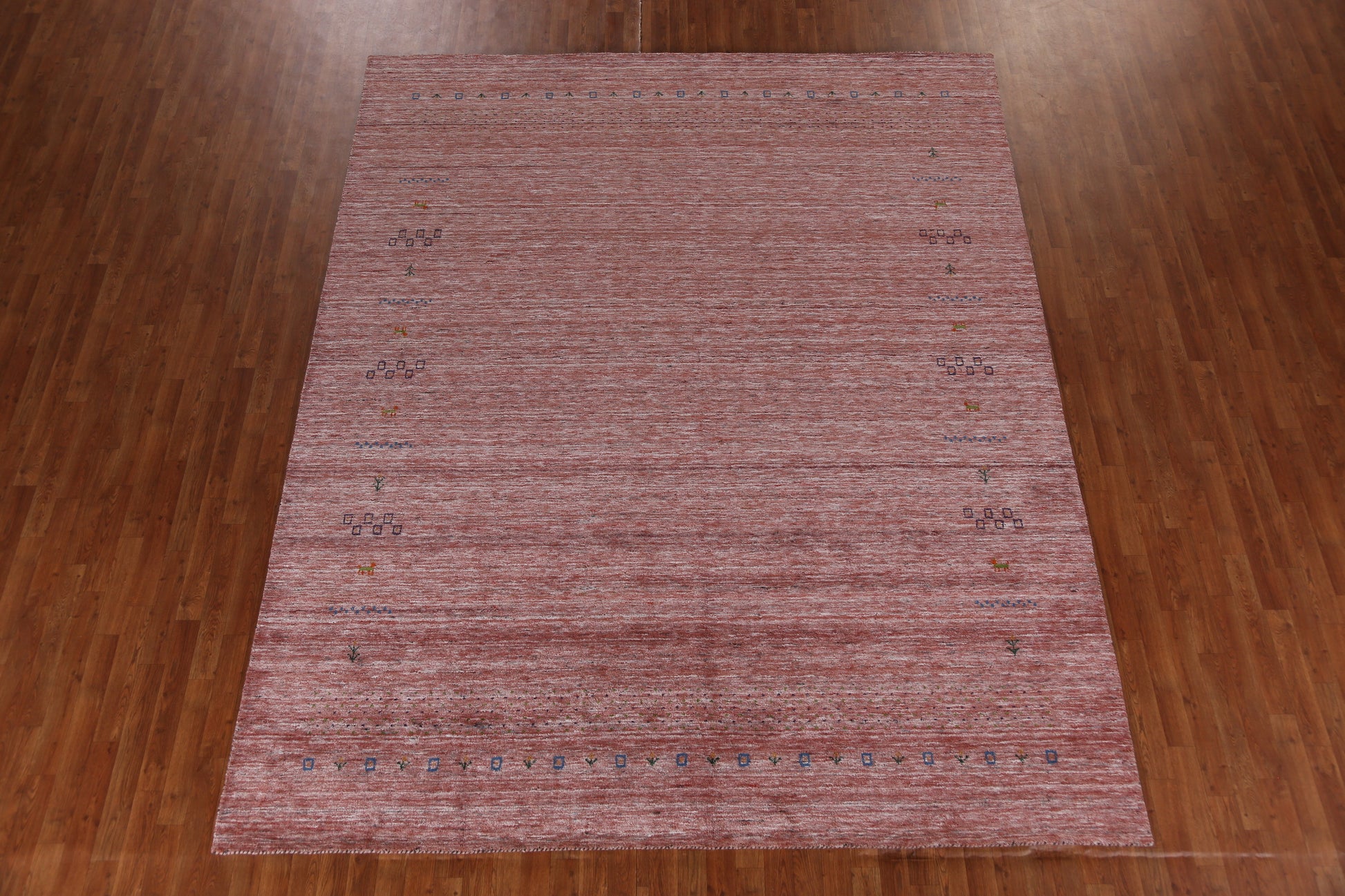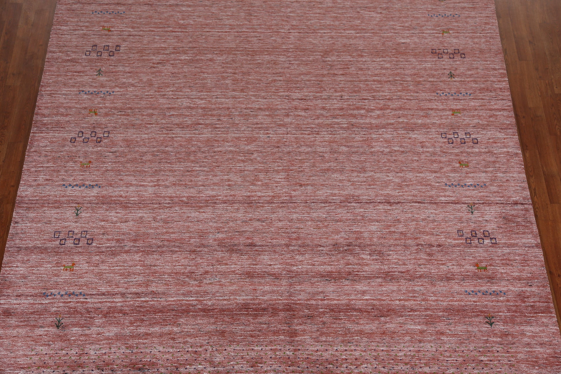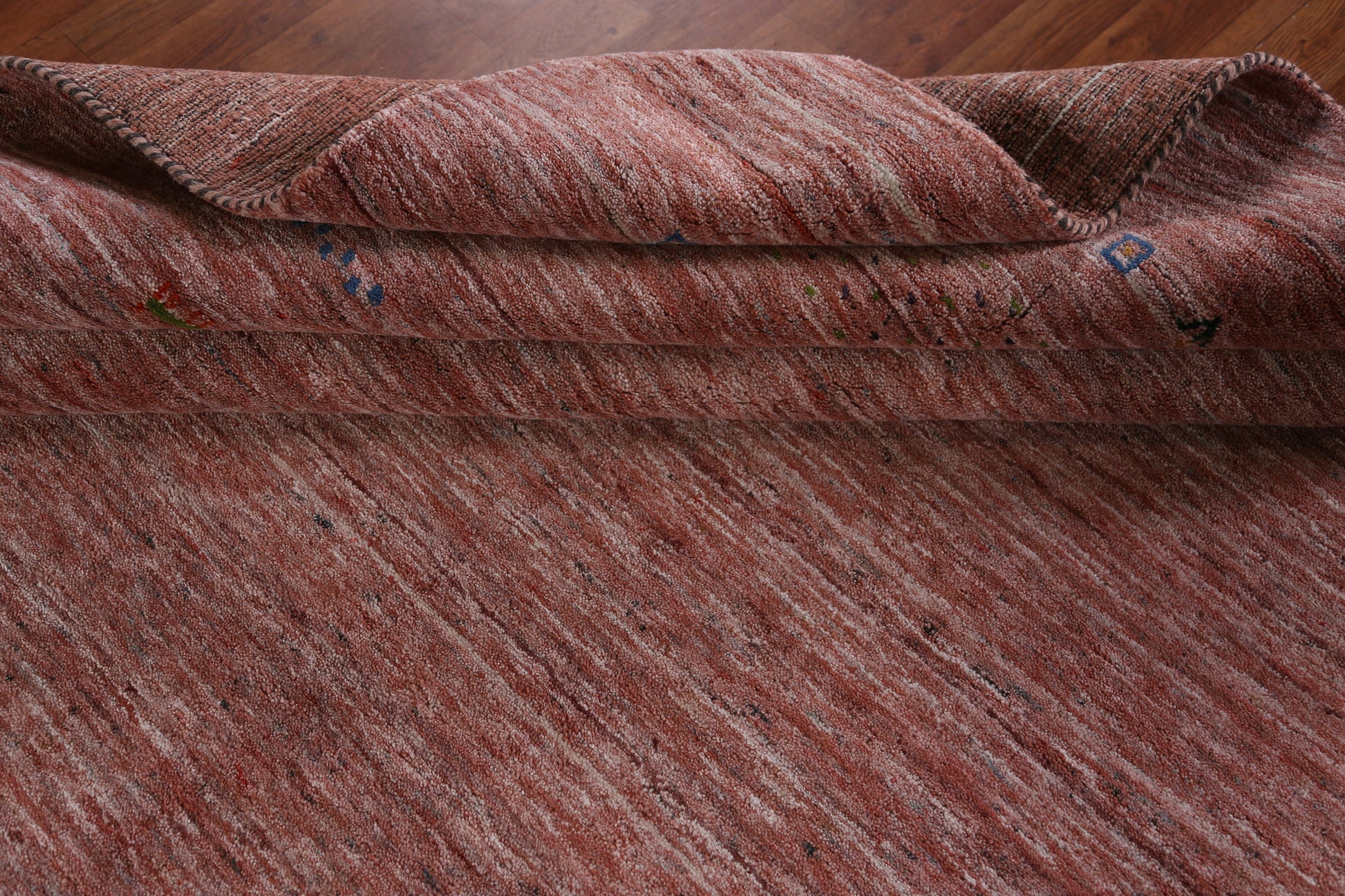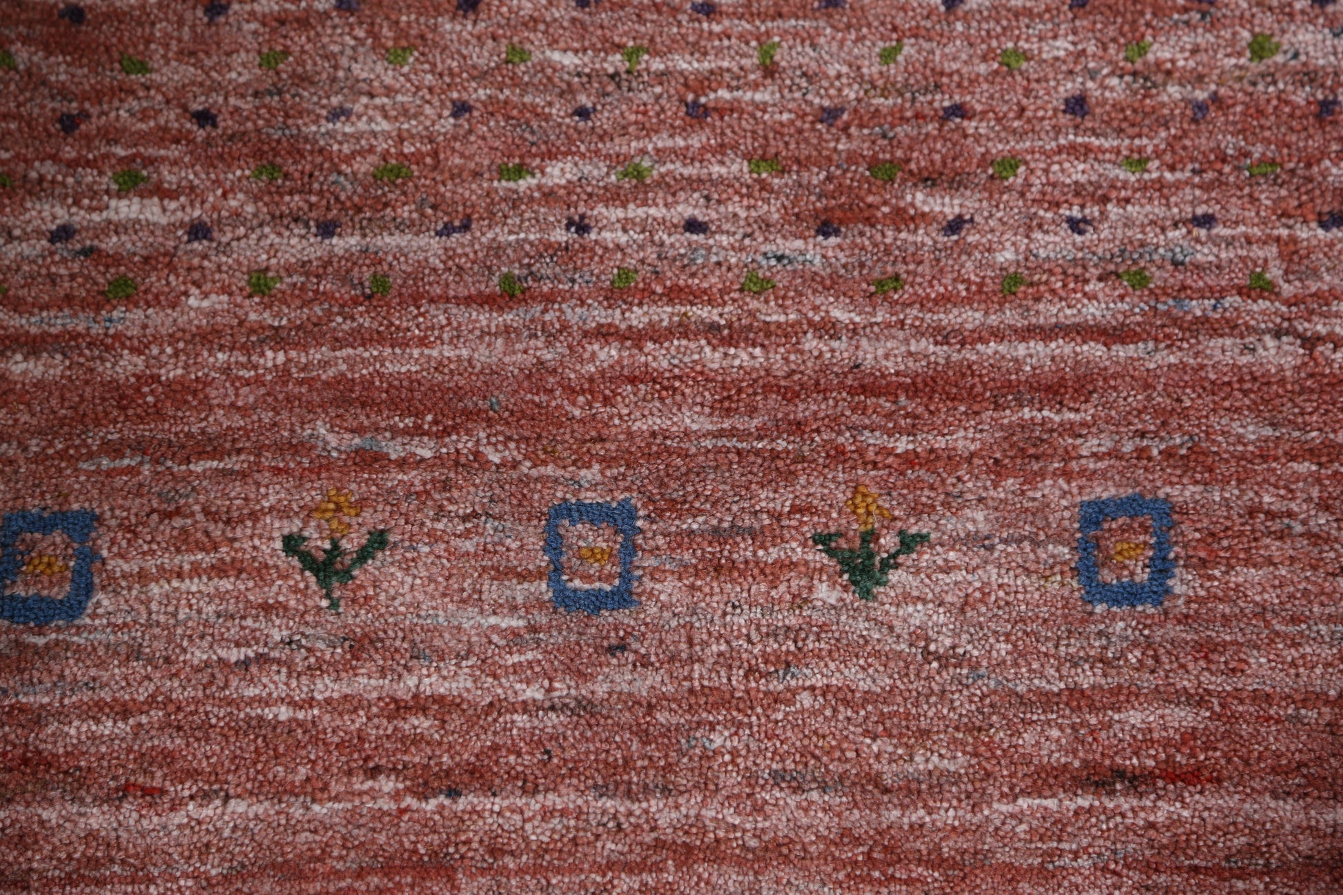 A Beautiful Genuine India Gabbeh rug is Hand Knotted by skillful weavers in India with 100% Wool Material. This rug is in New, First Quality condition. dimensions are 11' 3'' X 9' 1'' in foot and 343 X 277 in centimeter. the primary color is Peach.