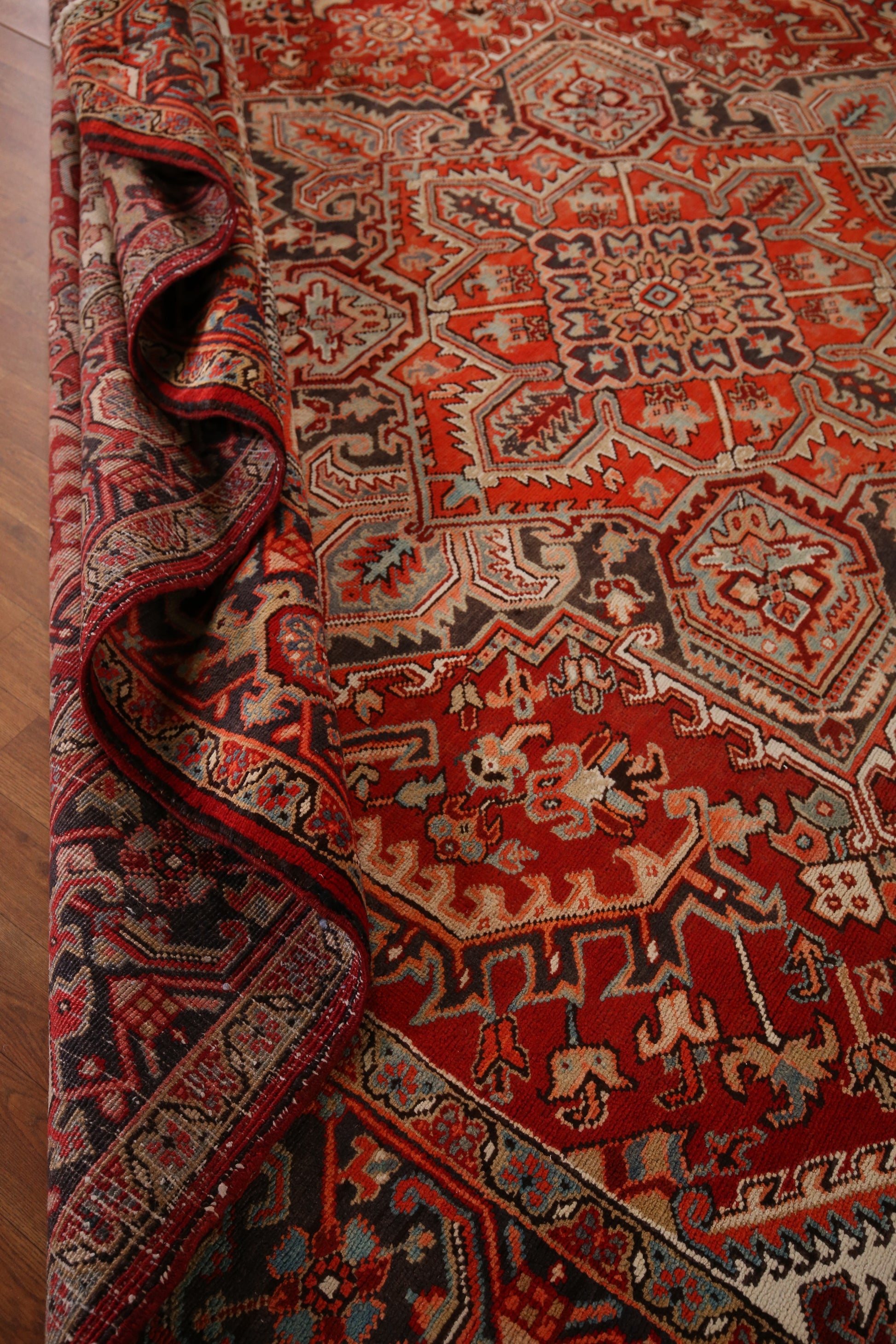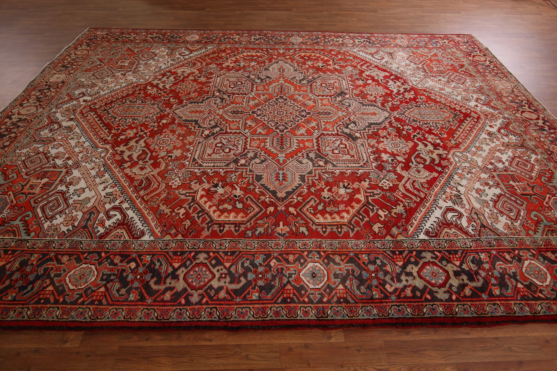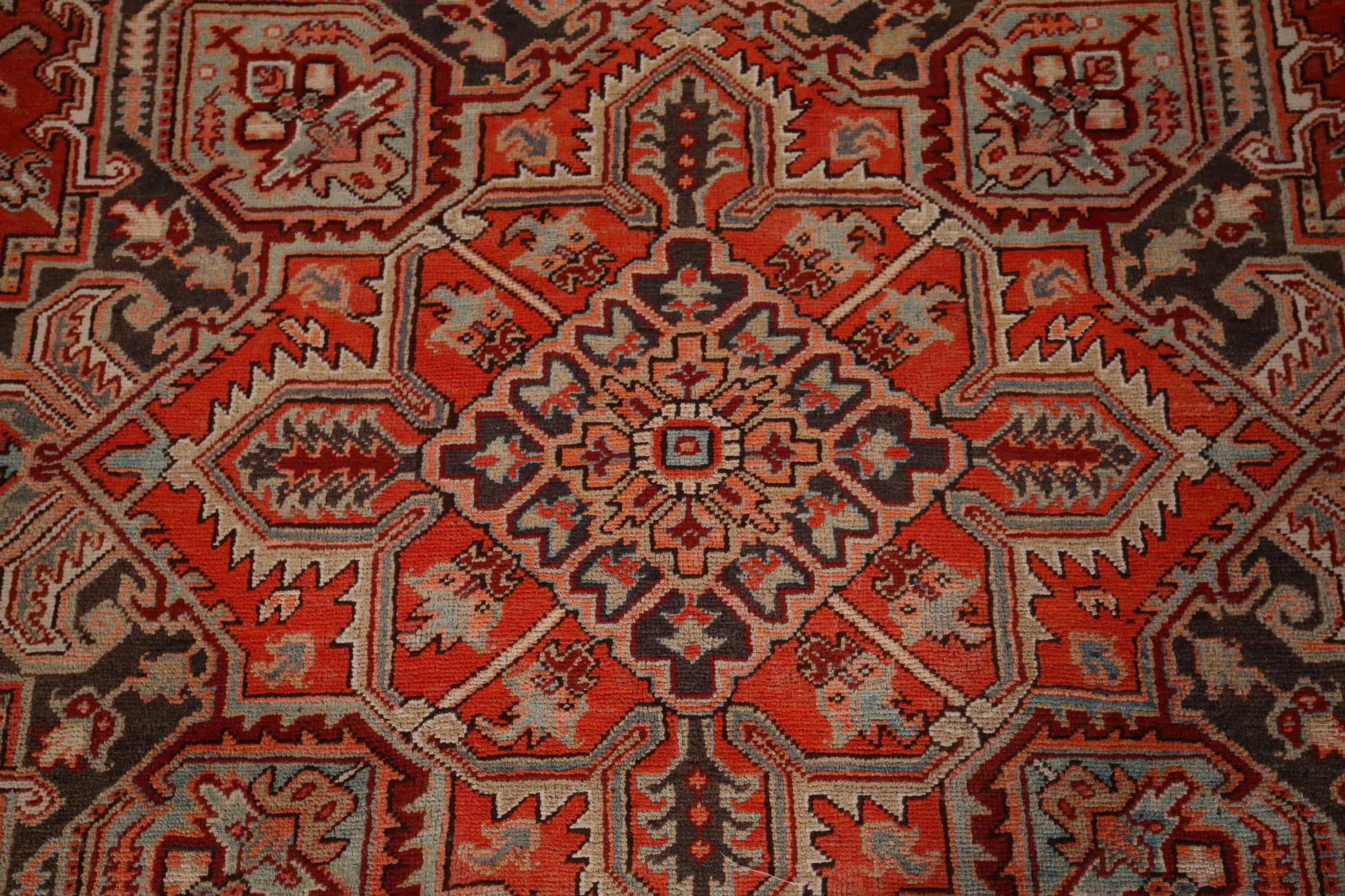 A Beautiful Genuine Persia ( Persia ) Heriz rug is Hand Knotted by skillful weavers in Persia ( Persia ) with 100% Wool Material. This rug is in Very Good condition. dimensions are 12' 10'' X 9' 6'' in foot and 391 X 290 in centimeter. the primary color is Oranges & Rust.