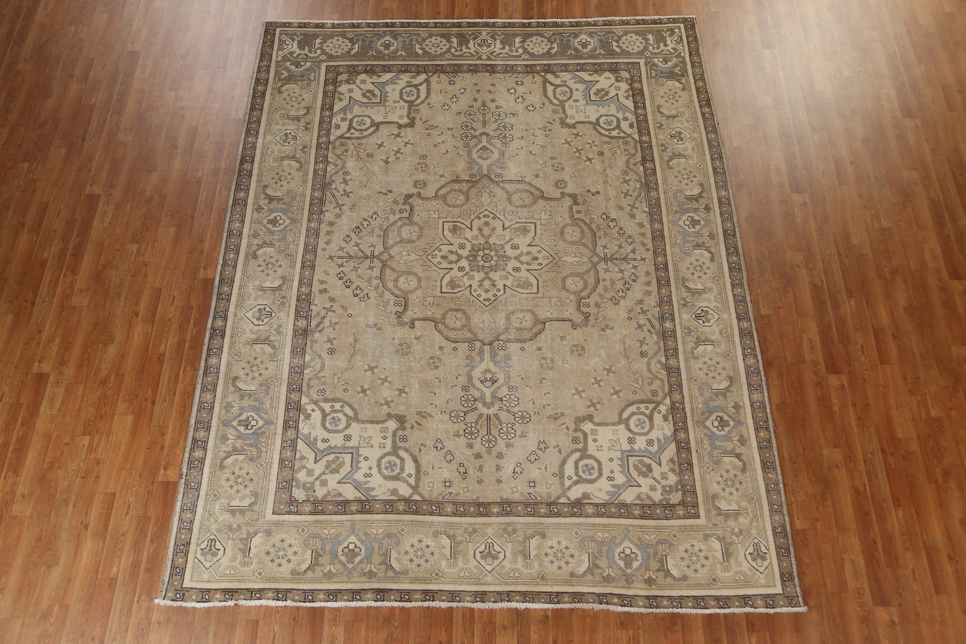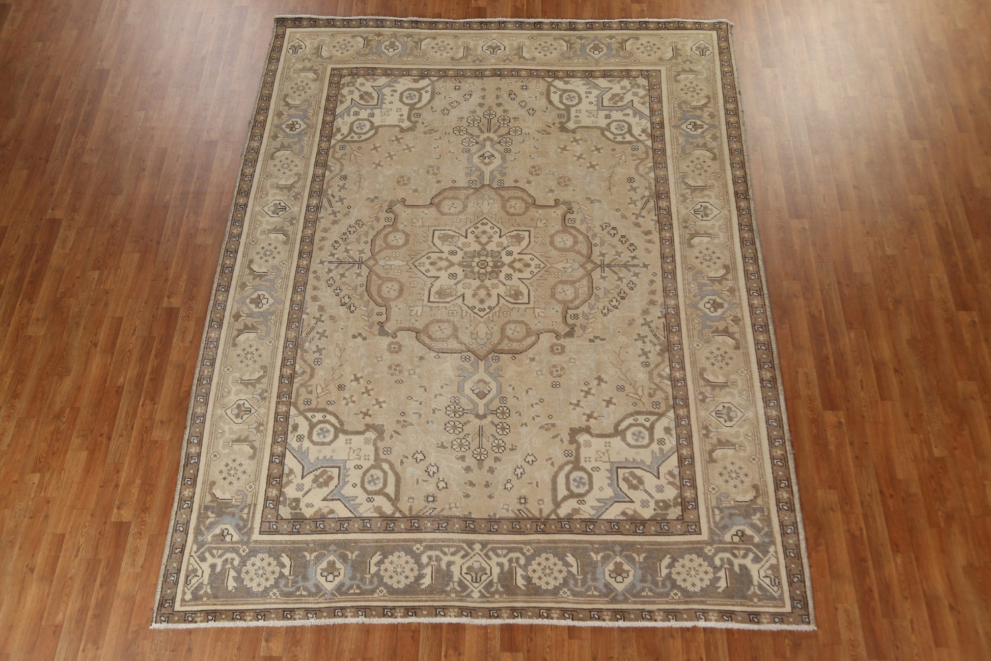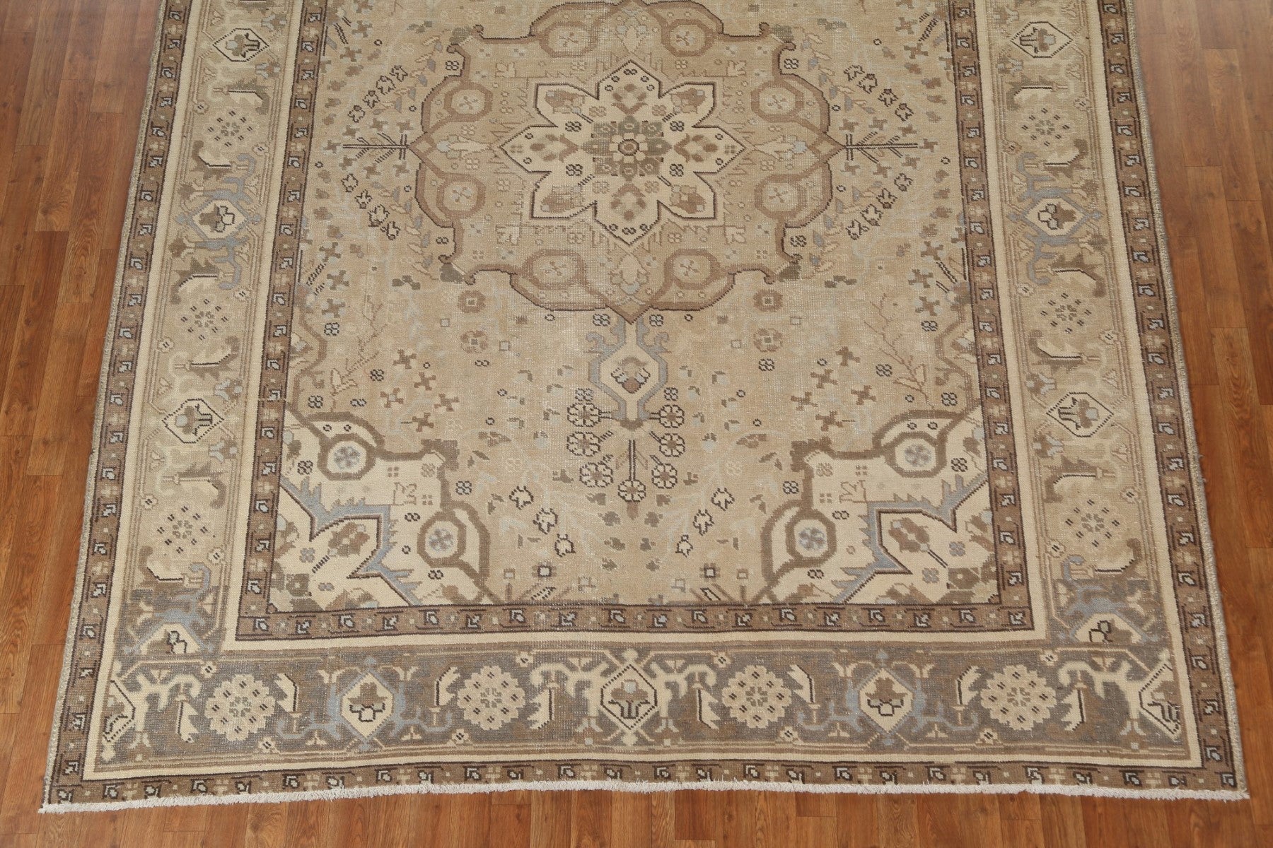 A Beautiful Genuine Persia ( Persia ) Heriz rug is Hand Knotted by skillful weavers in Persia ( Persia ) with 100% Wool Material. This rug is in Very Good (Evenly Low Pile) condition. dimensions are 10' 7'' X 8' 3'' in foot and 323 X 251 in centimeter. the primary color is Beige & Ivories.