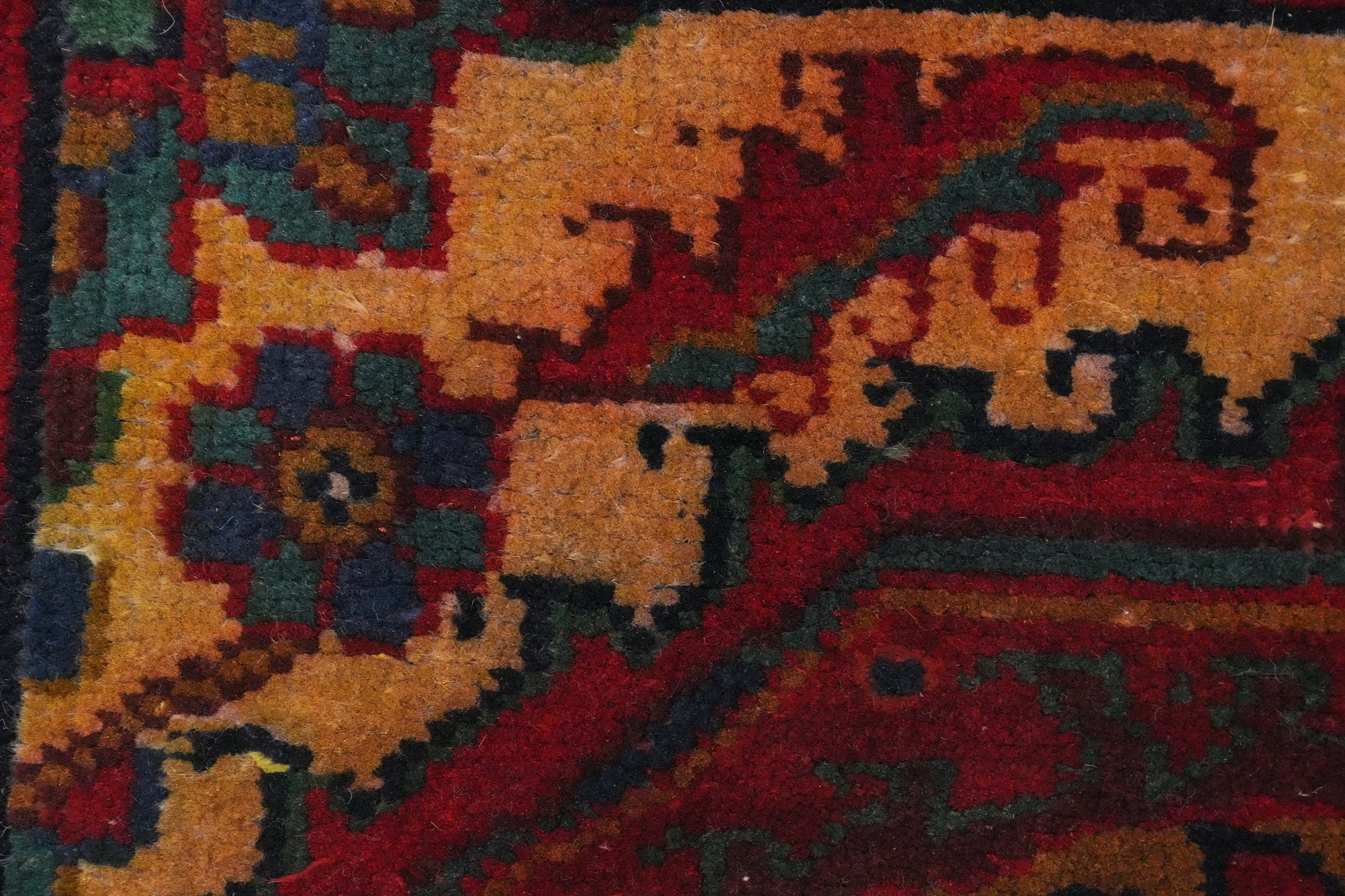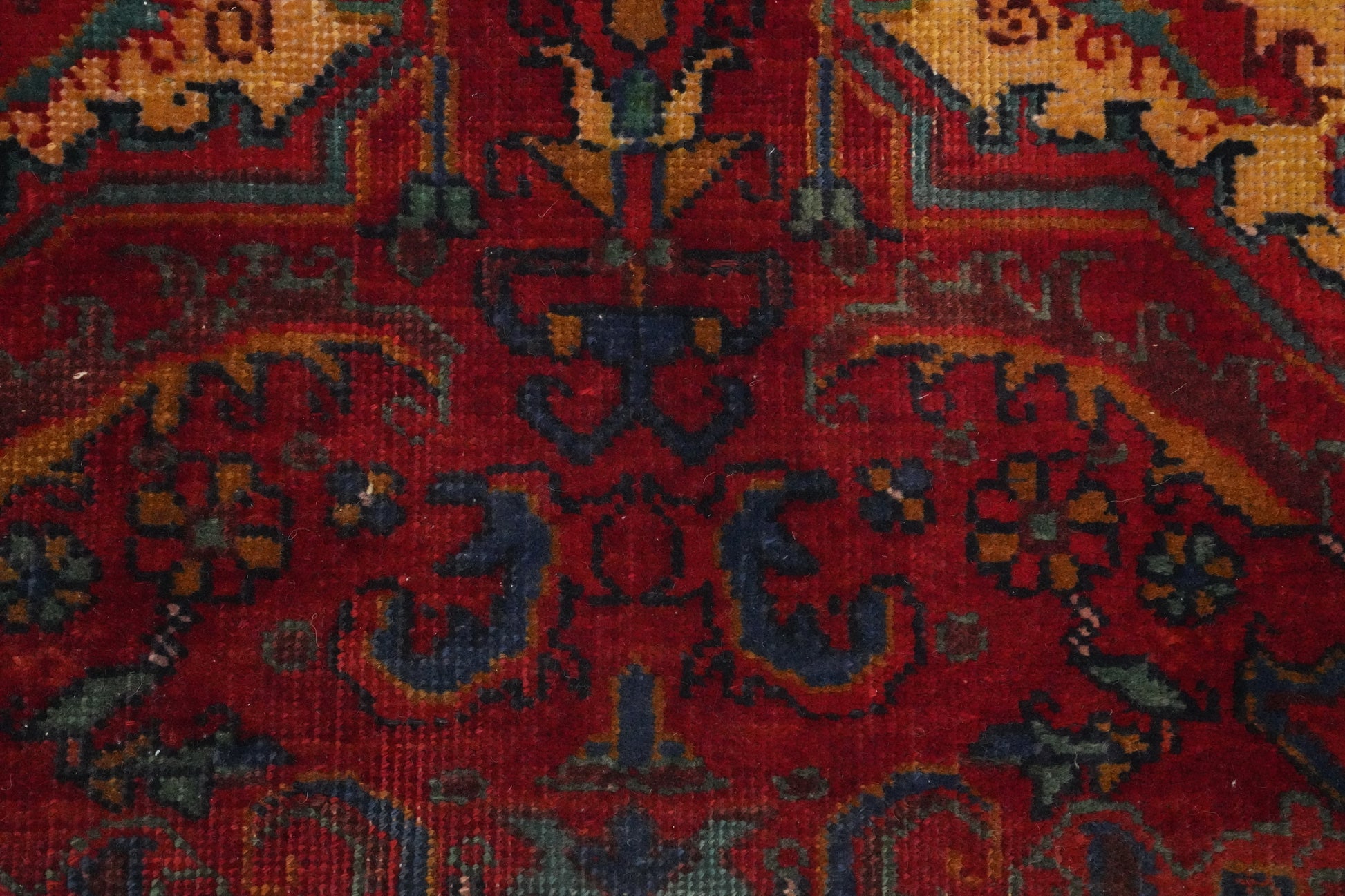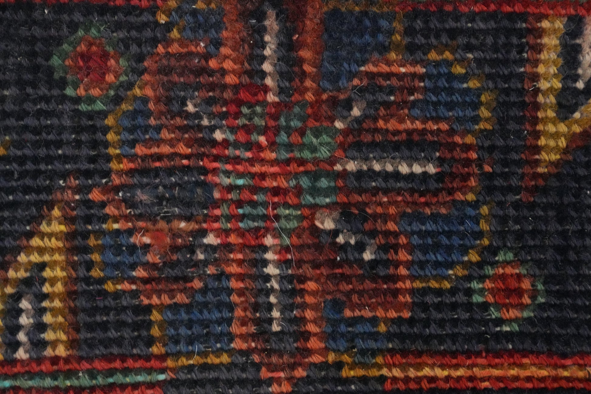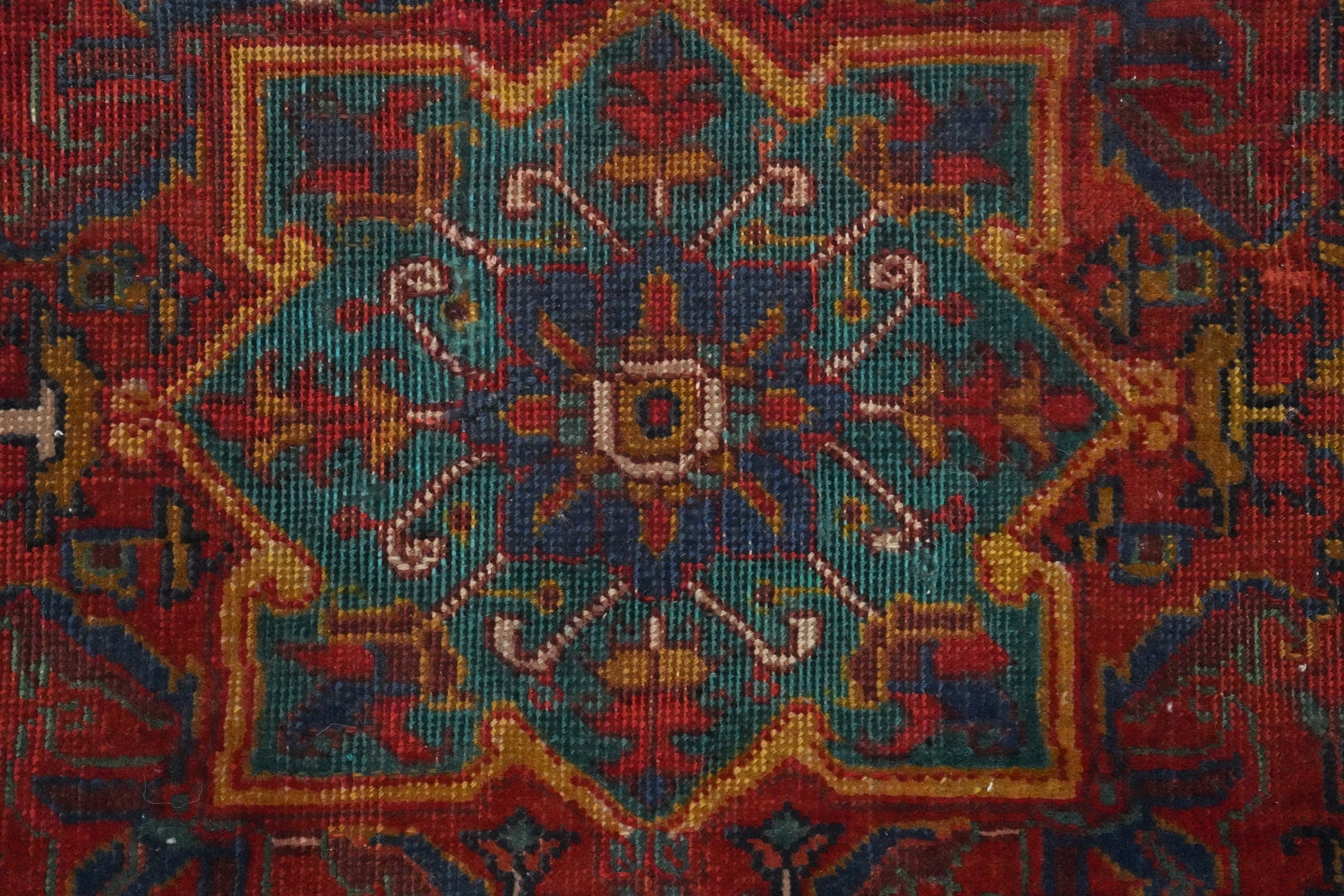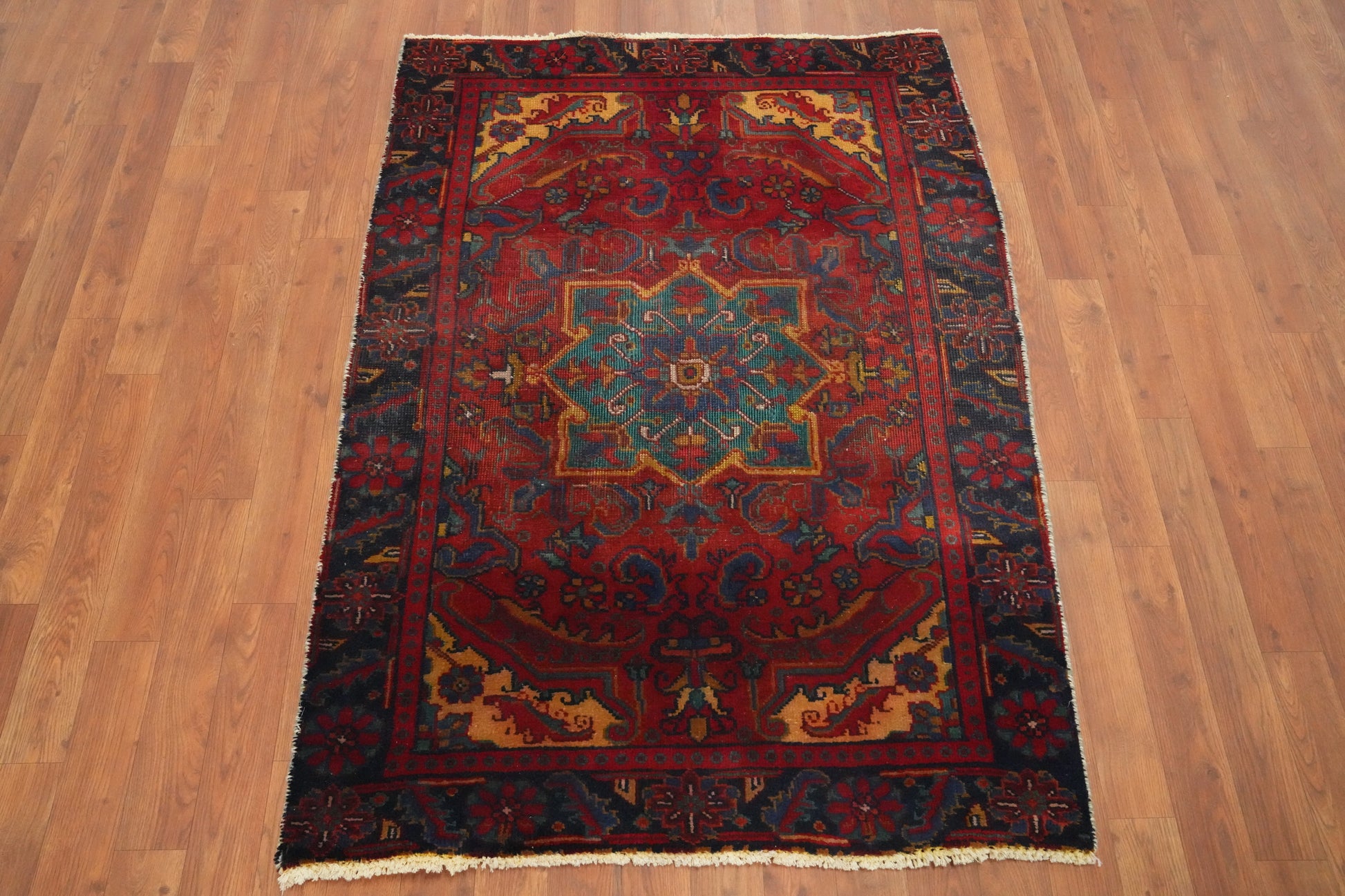 A Beautiful Genuine Persia ( Persia ) Heriz rug is Hand Knotted by skillful weavers in Persia ( Persia ) with 100% Wool Material. This rug is in Very Good (Evenly Low Pile) condition. dimensions are 4' 5'' X 3' 3'' in foot and 135 X 99 in centimeter. the primary color is Red.