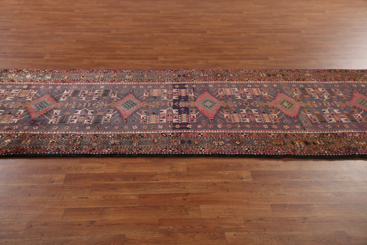 A Beautiful Genuine Persia ( Persia ) Heriz rug is Hand Knotted by skillful weavers in Persia ( Persia ) with 100% Wool Material. This rug is in Very Good (Abrash) condition. dimensions are 13' 11'' X 3' 10'' in foot and 424 X 117 in centimeter. the primary color is Navy Blue & Blues.