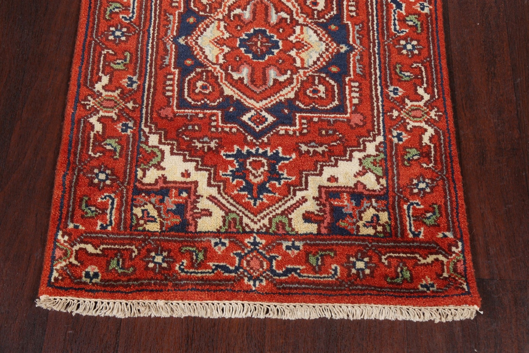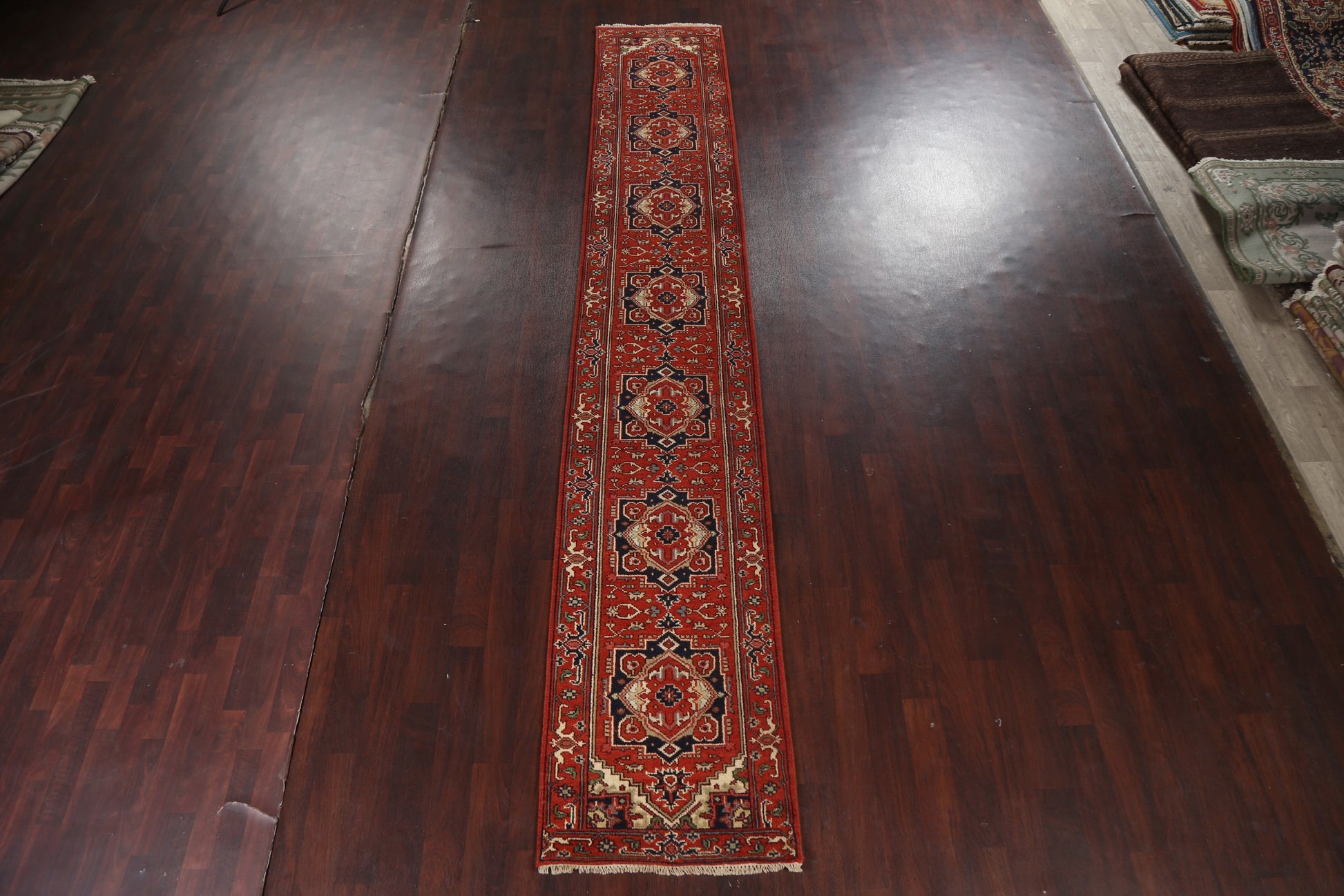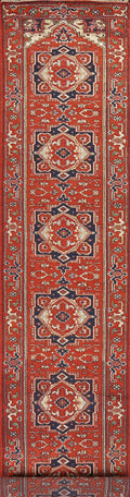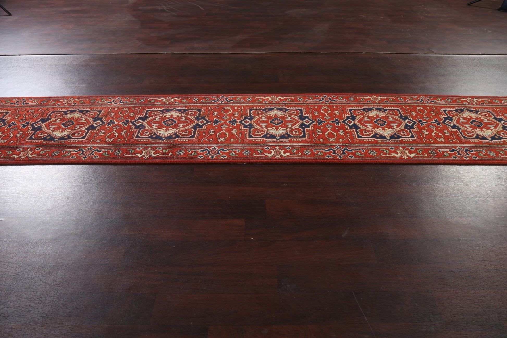 A Beautiful Genuine India Heriz (serapi) rug is Hand Knotted by skillful weavers in India with 100% Wool Material. This rug is in New, First Quality condition. dimensions are 15' 9'' X 2' 7'' in foot and 480 X 79 in centimeter. the primary color is Red.