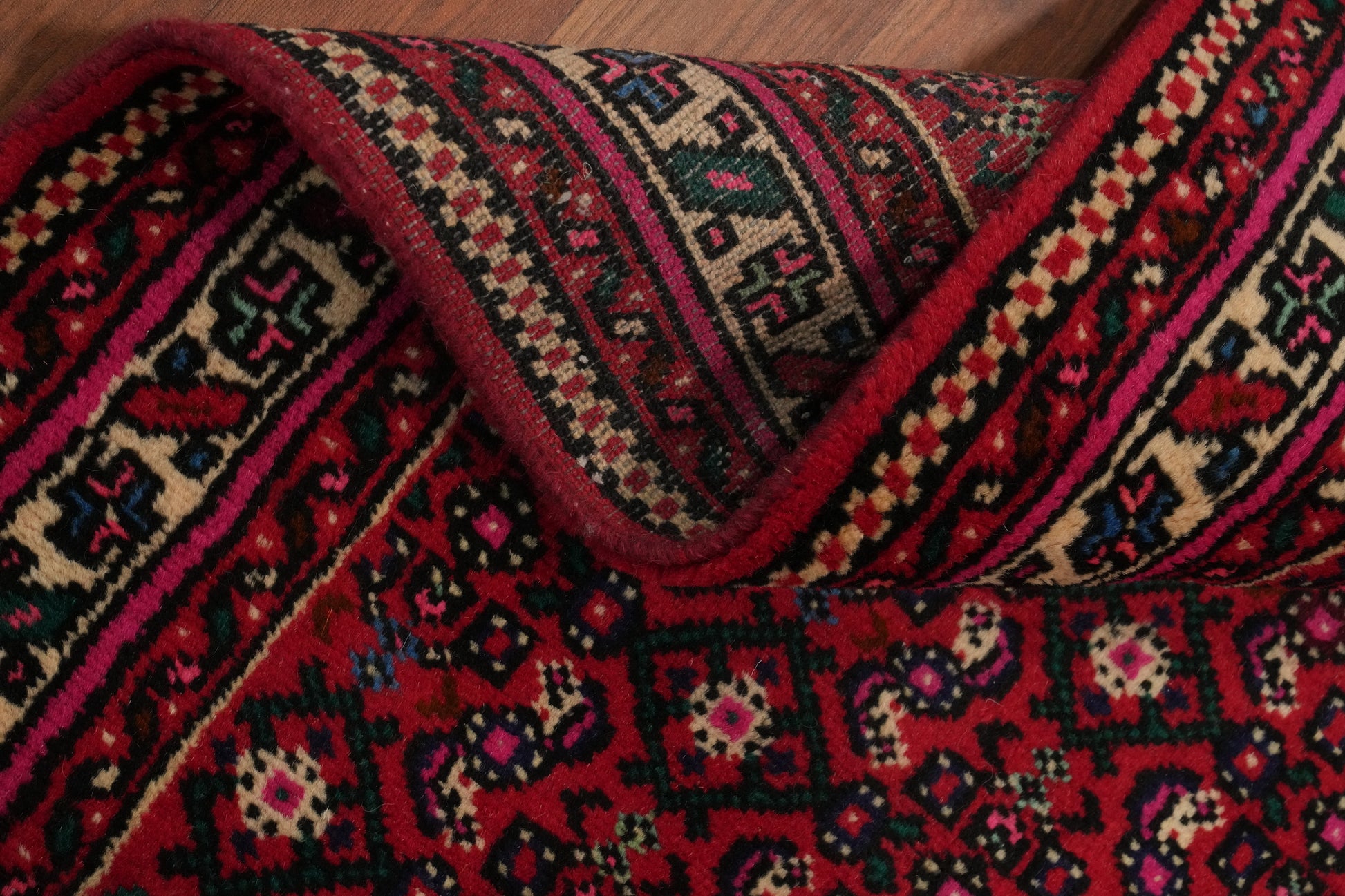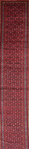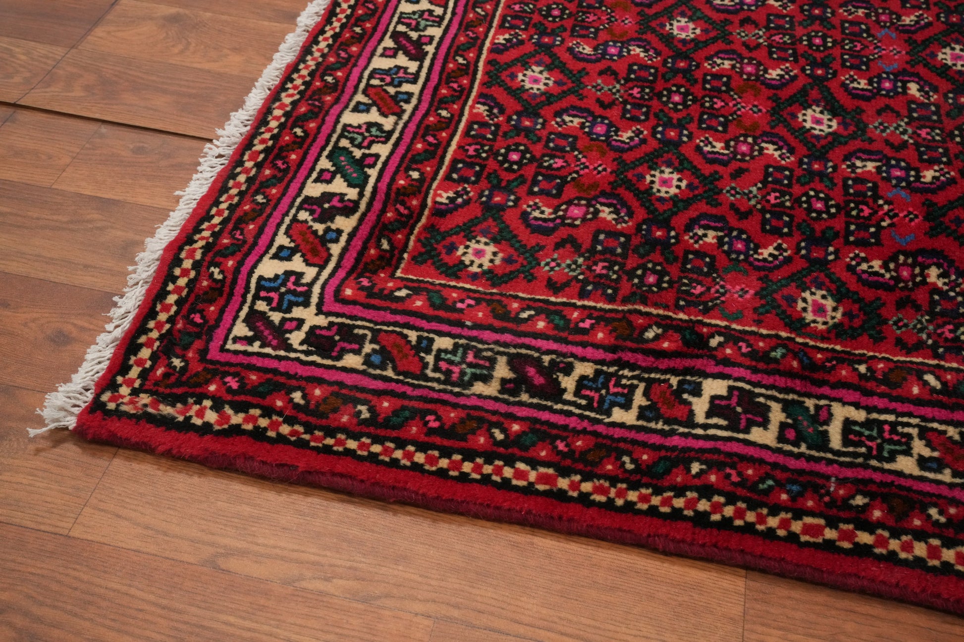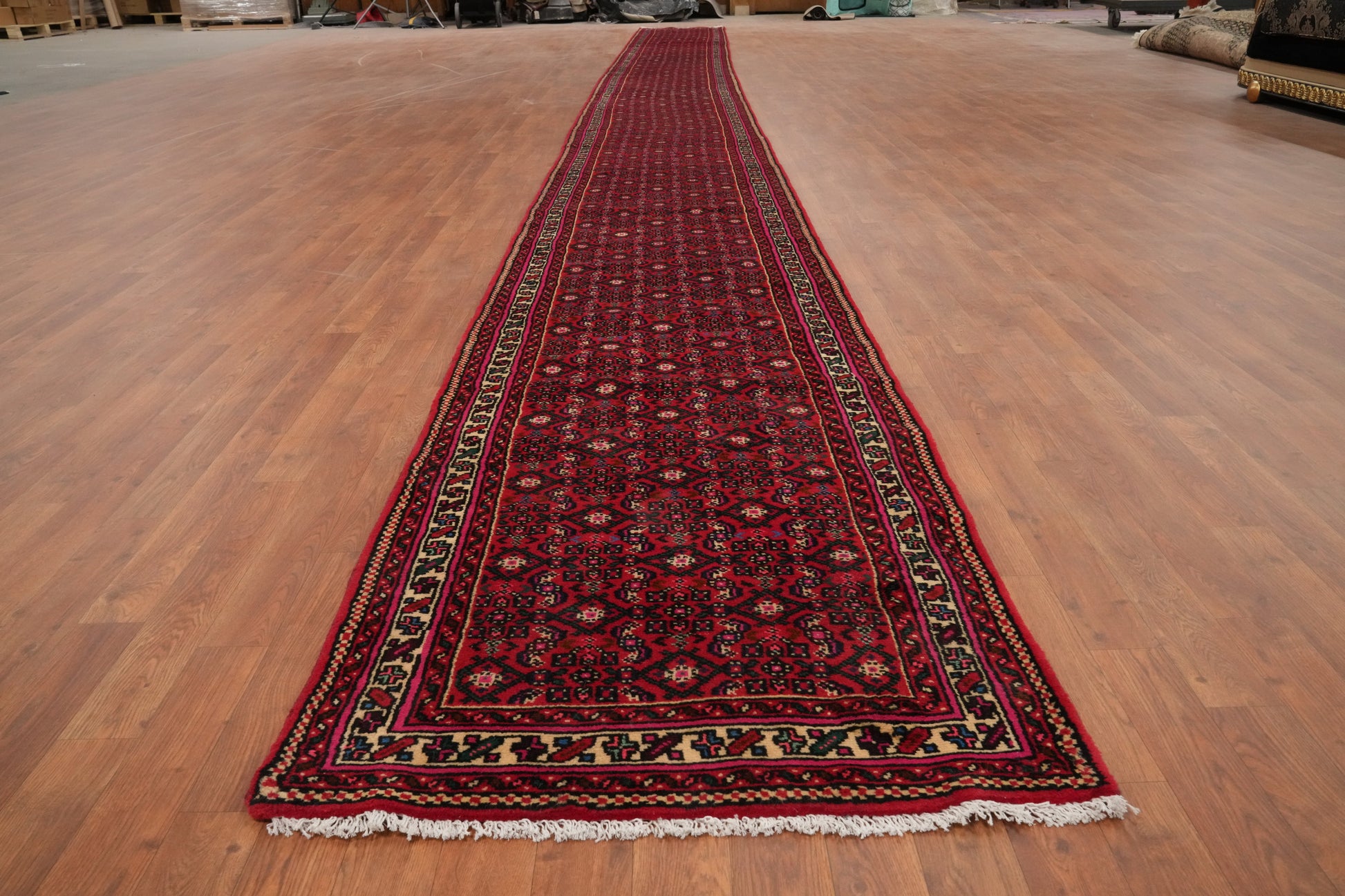 A Beautiful Genuine Persia ( Persia ) Hossainabad rug is Hand Knotted by skillful weavers in Persia ( Persia ) with 100% Wool Material. This rug is in Excellent condition. dimensions are 31' 6'' X 2' 8'' in foot and 960 X 81 in centimeter. the primary color is Red.