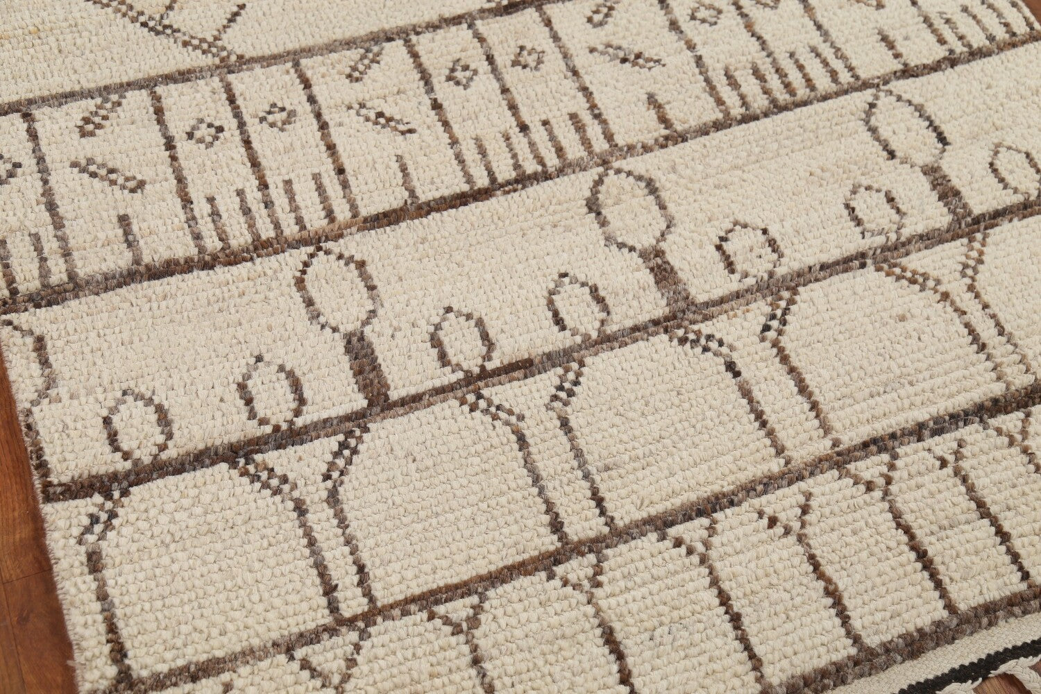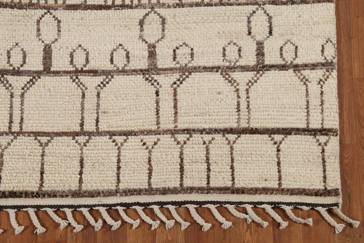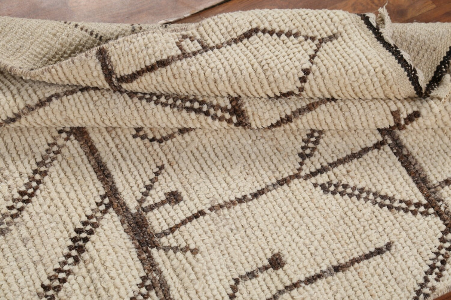 A Beautiful Genuine Pakistan Moroccan rug is Hand Knotted by skillful weavers in Pakistan with 100% Wool Material. This rug is in New, First Quality condition. dimensions are 12' 7'' X 3' 10'' in foot and 384 X 117 in centimeter. the primary color is Beige & Ivories.