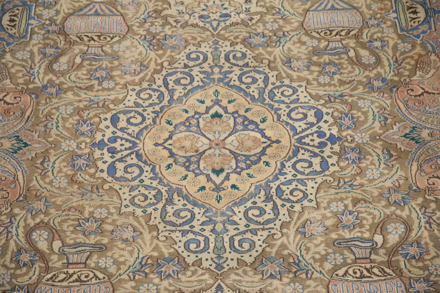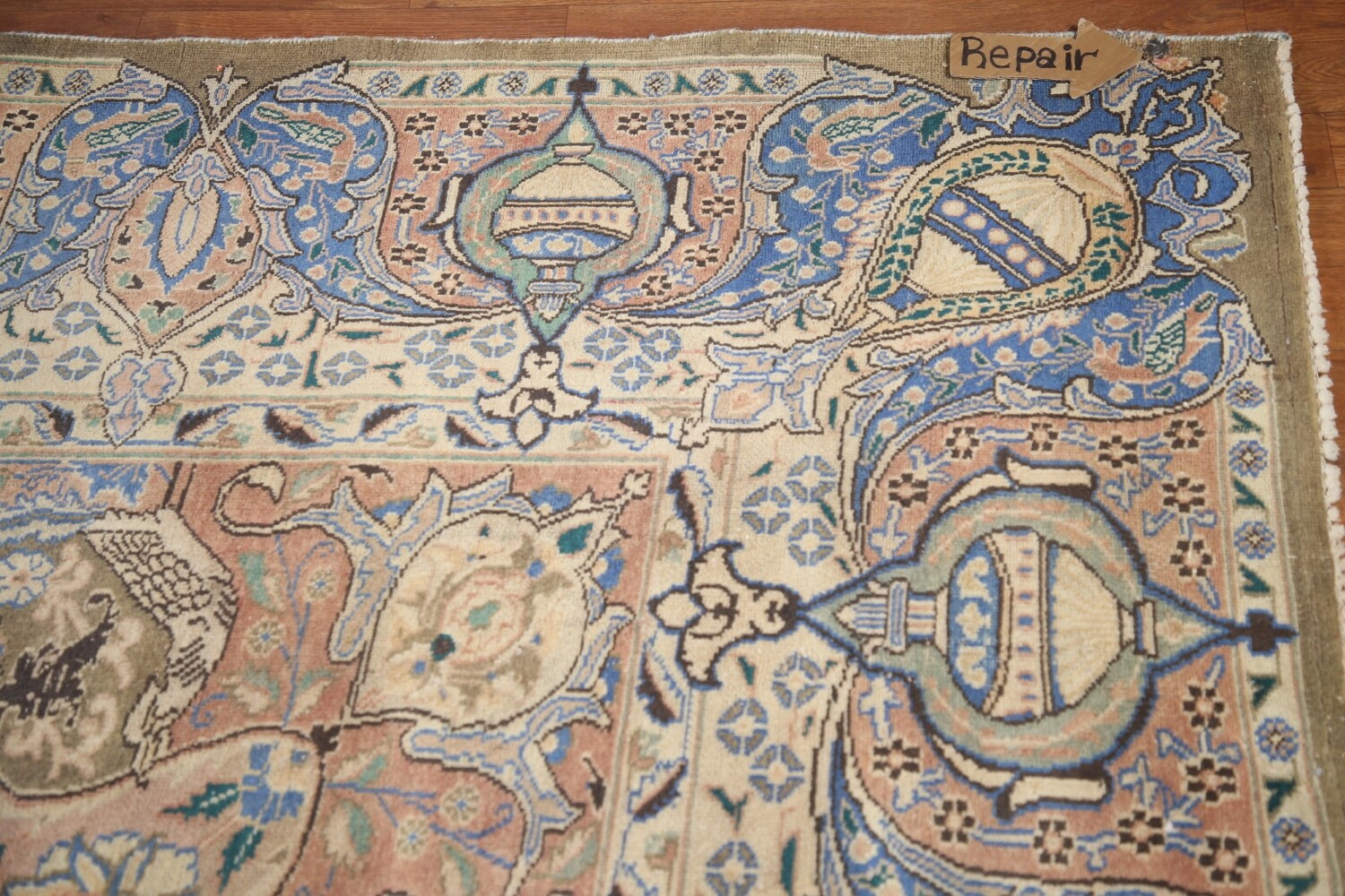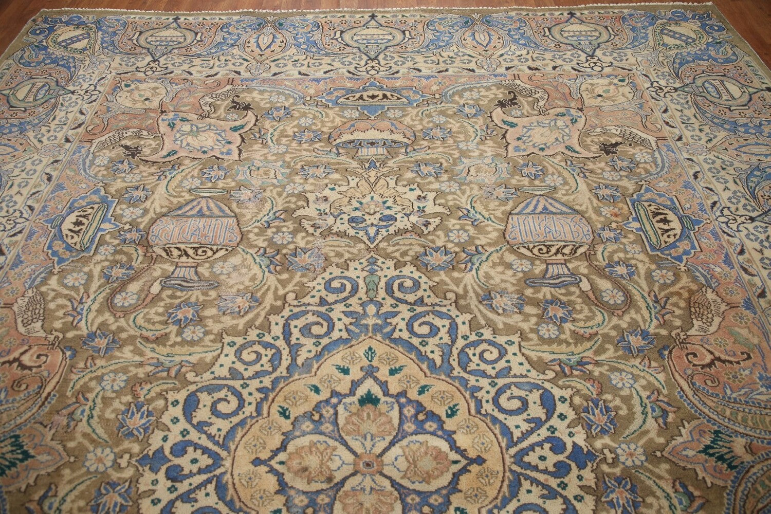 A Beautiful Genuine Persia ( Persia ) Kashmar rug is Hand Knotted by skillful weavers in Persia ( Persia ) with 100% Wool Material. This rug is in Very Good (Evenly Low Pile-Repair) condition. dimensions are 12' 7'' X 9' 6'' in foot and 384 X 290 in centimeter. the primary color is Green.