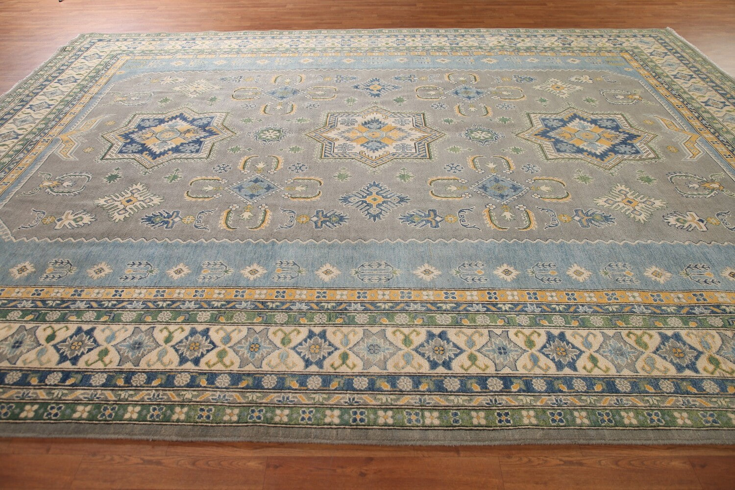 A Beautiful Genuine Pakistan Kazak rug is Hand Knotted by skillful weavers in Pakistan with 100% Wool Material. This rug is in New, First Quality condition. dimensions are 13' 2'' X 10' 0'' in foot and 401 X 305 in centimeter. the primary color is Greys & Charcoal.
