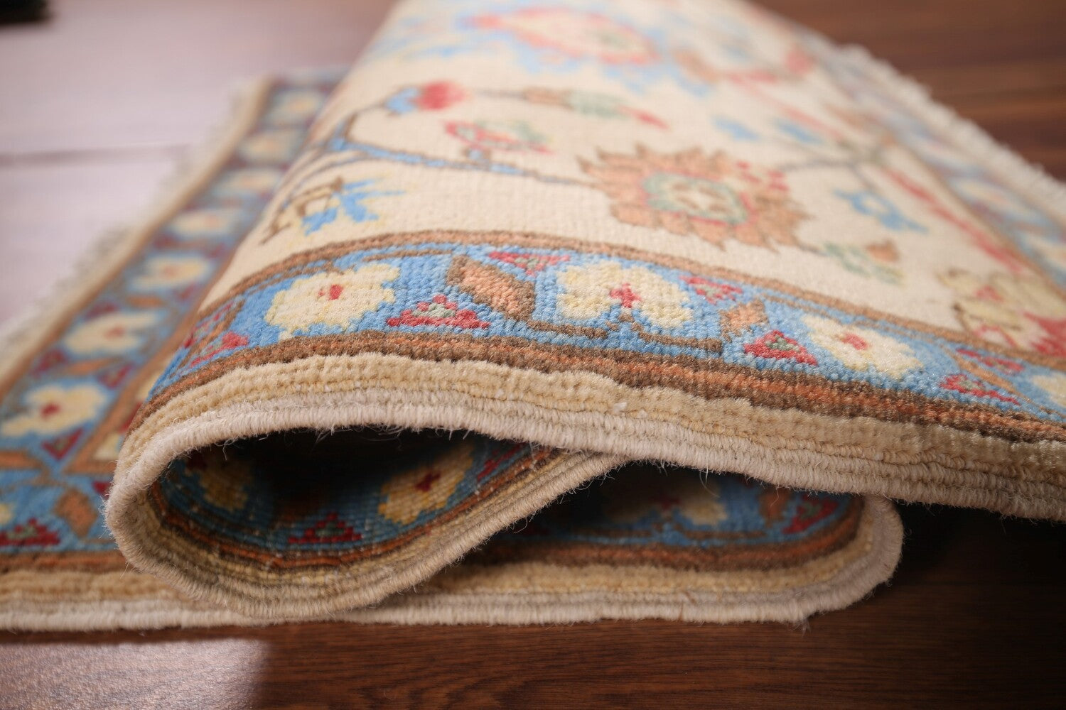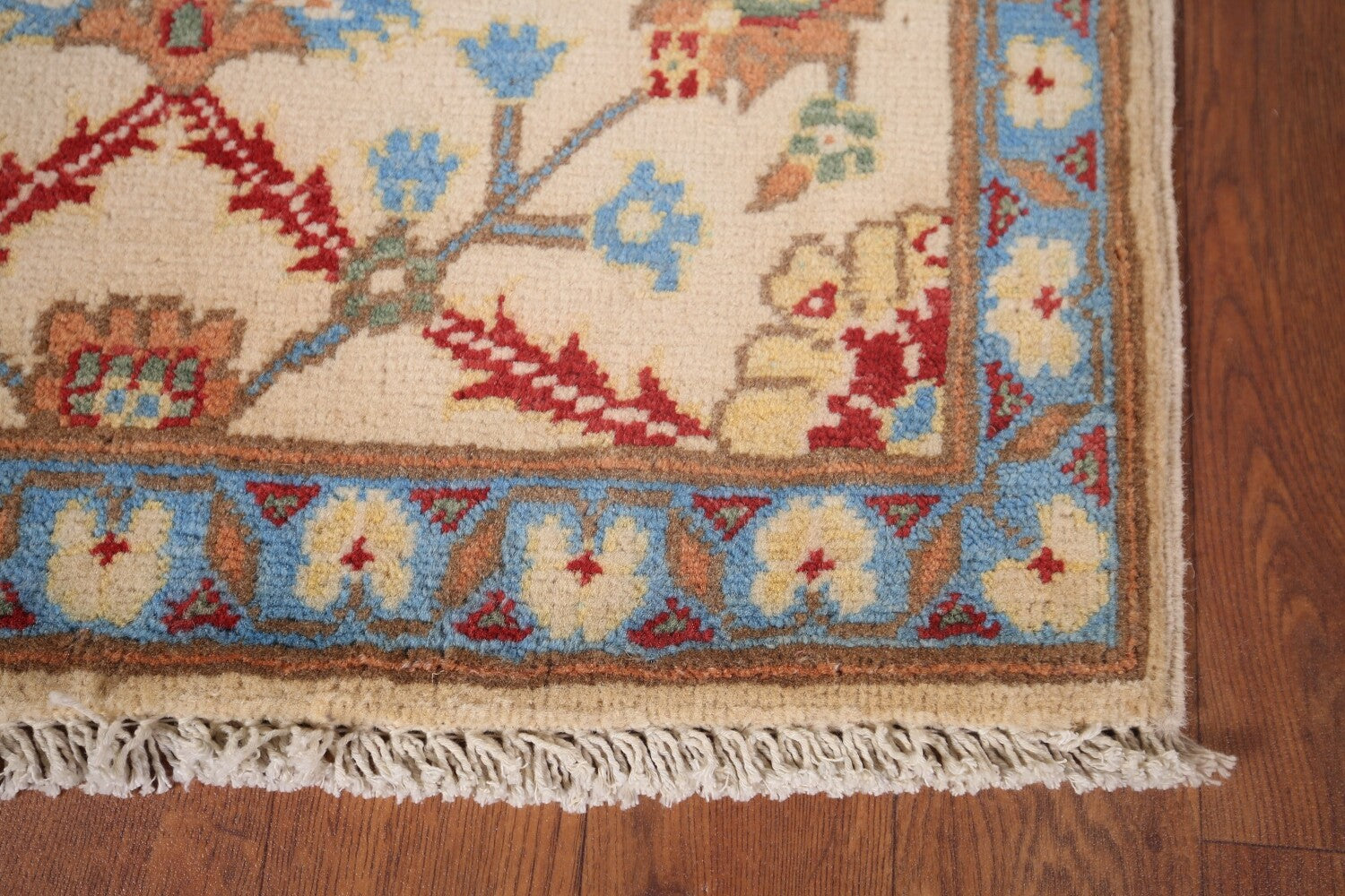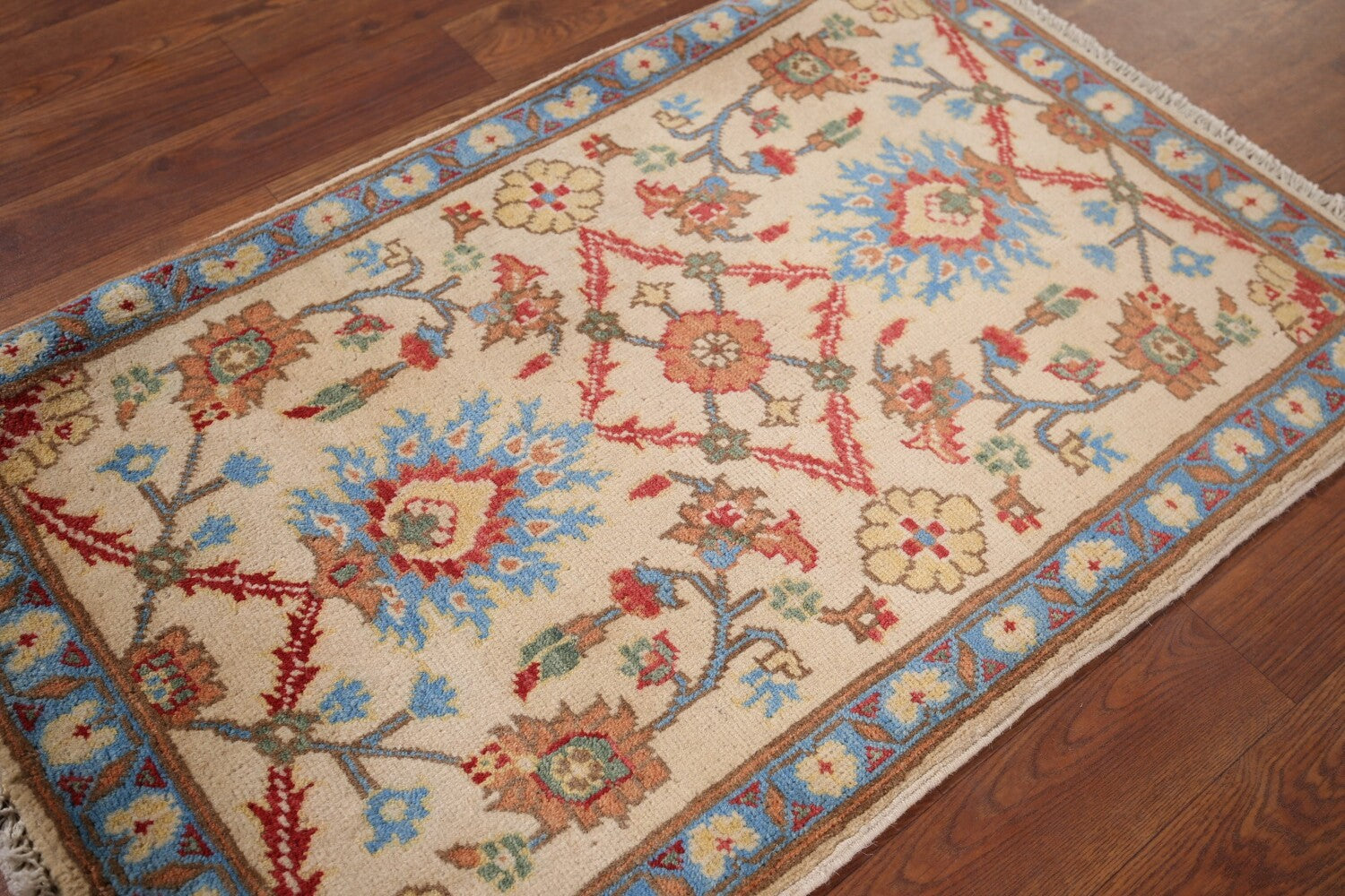 A Beautiful Genuine Pakistan Kazak rug is Hand Knotted by skillful weavers in Pakistan with 100% Wool Material. This rug is in New, First Quality condition. dimensions are 3' 1'' X 1' 11'' in foot and 94 X 58 in centimeter. the primary color is Beige & Ivories.