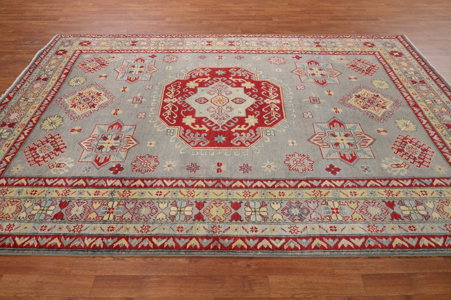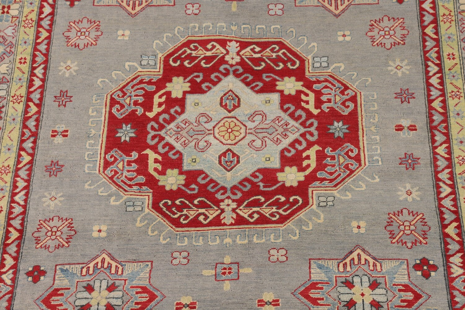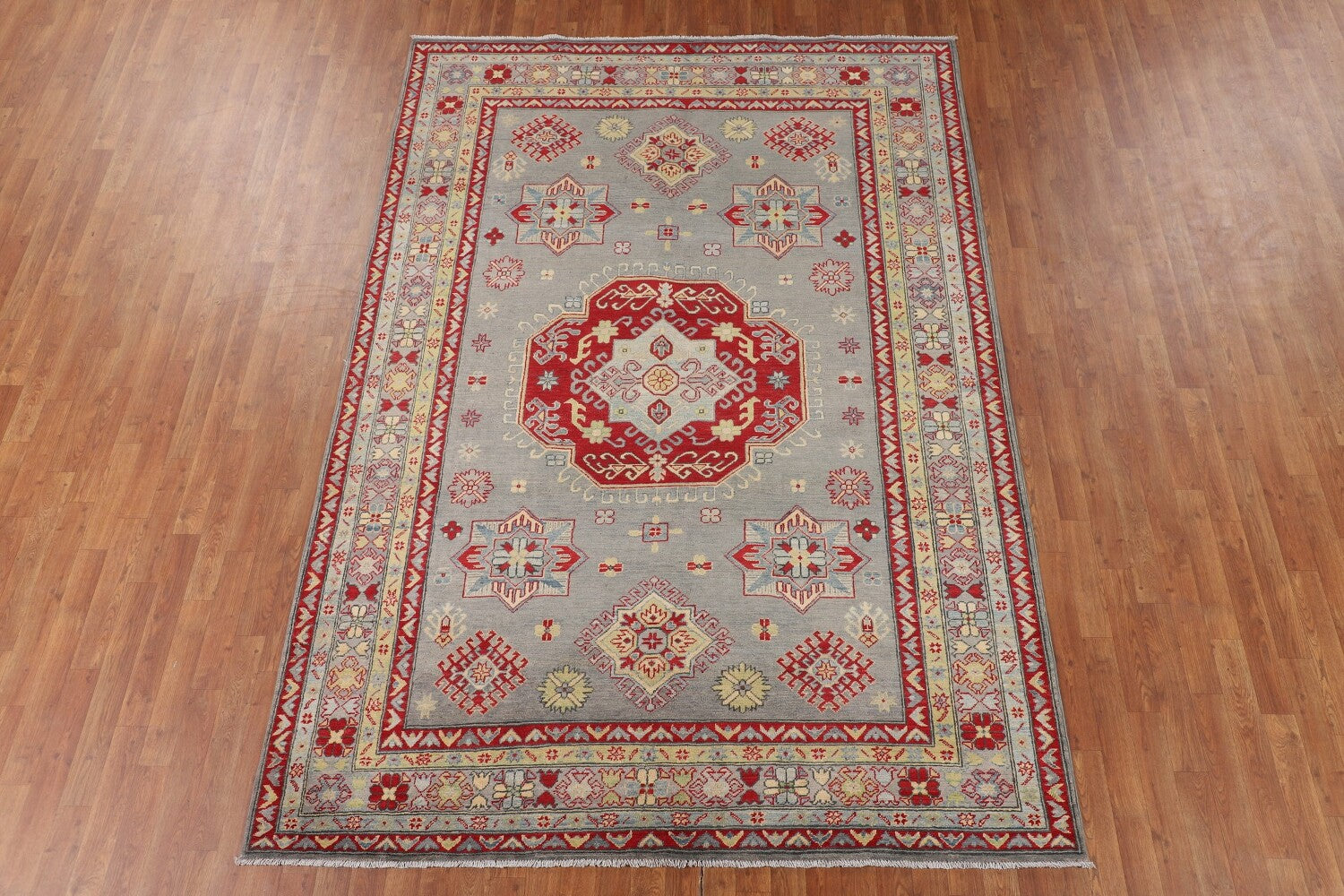 A Beautiful Genuine Pakistan Kazak rug is Hand Knotted by skillful weavers in Pakistan with 100% Wool Material. This rug is in New, First Quality condition. dimensions are 9' 9'' X 6' 9'' in foot and 297 X 206 in centimeter. the primary color is Greys & Charcoal.