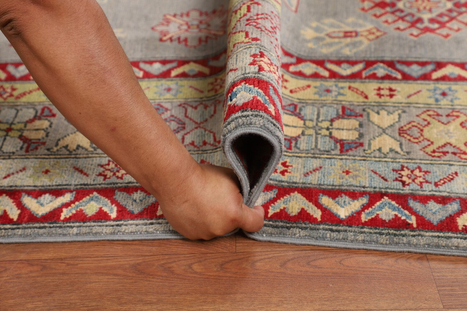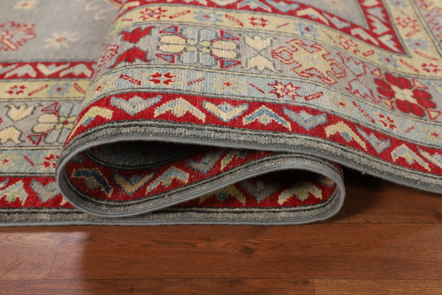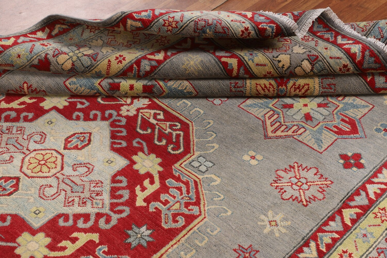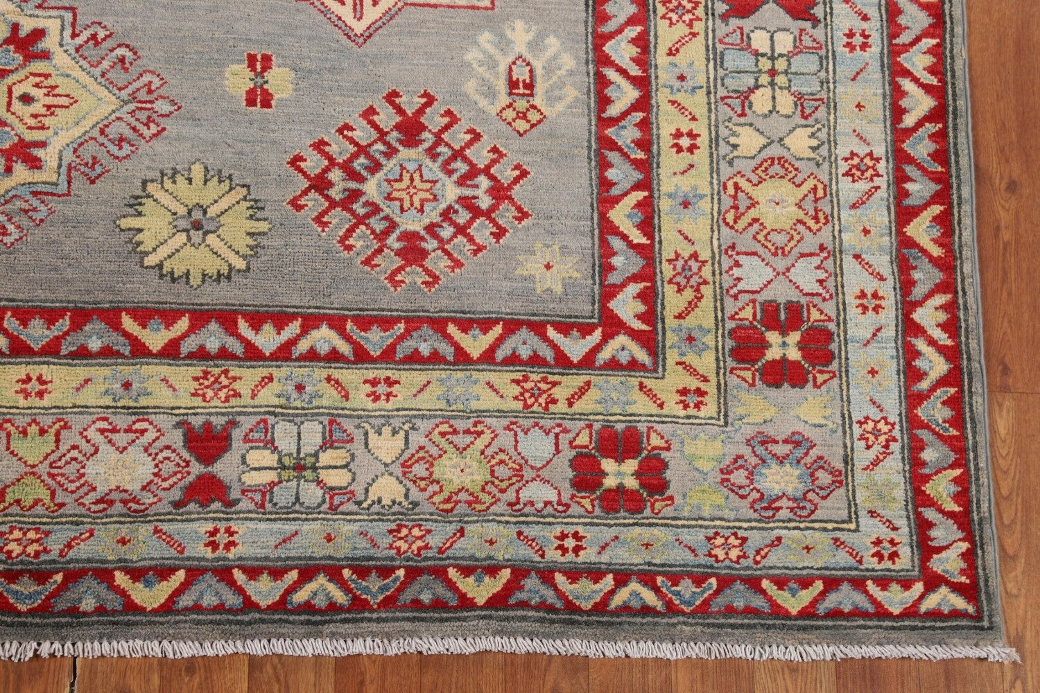 A Beautiful Genuine Pakistan Kazak rug is Hand Knotted by skillful weavers in Pakistan with 100% Wool Material. This rug is in New, First Quality condition. dimensions are 9' 9'' X 6' 9'' in foot and 297 X 206 in centimeter. the primary color is Greys & Charcoal.