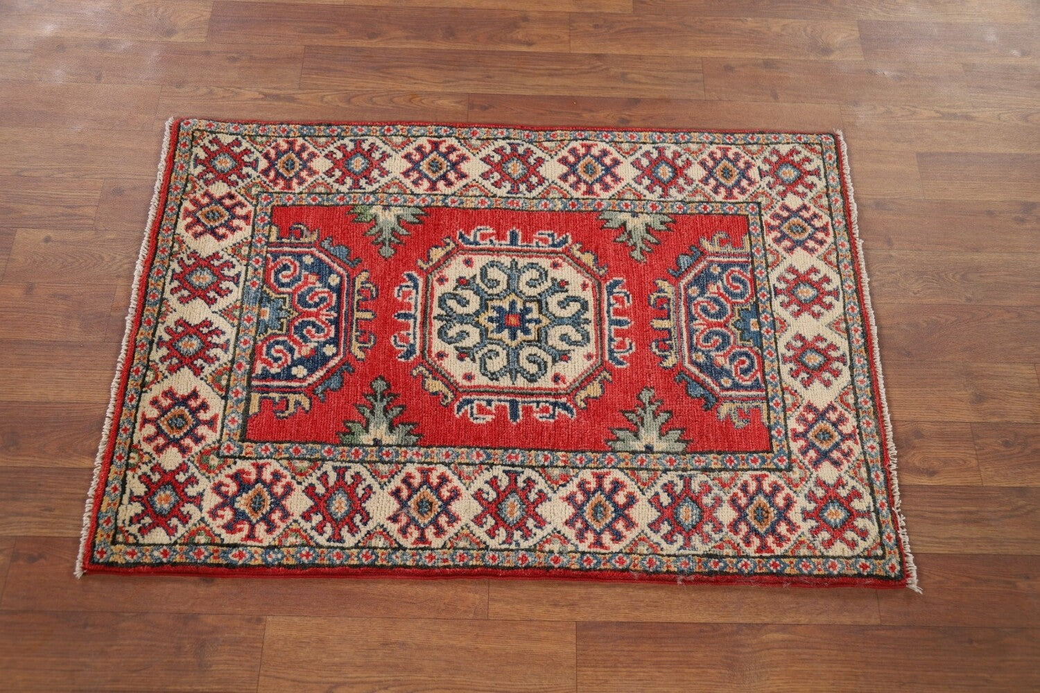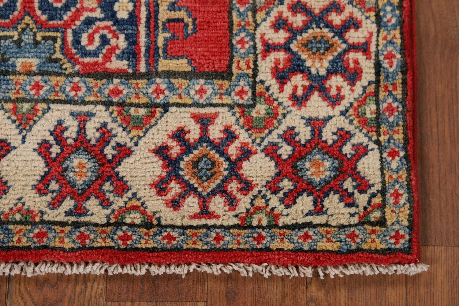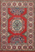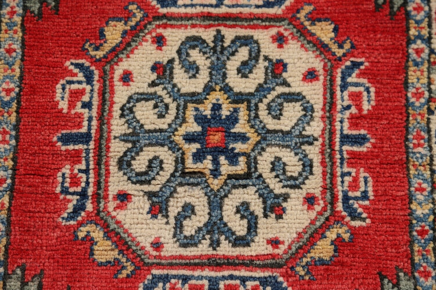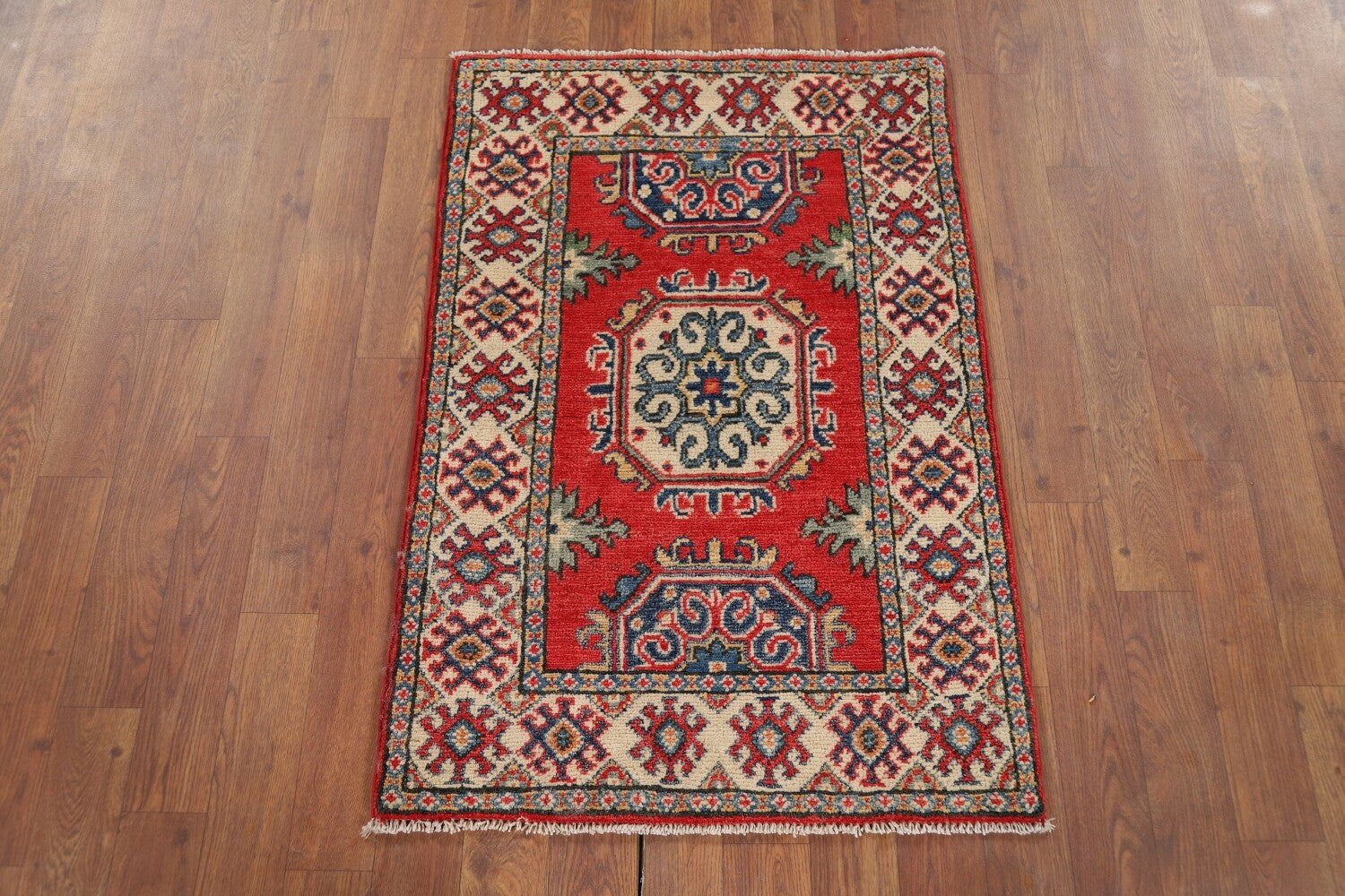 A Beautiful Genuine Pakistan Kazak rug is Hand Knotted by skillful weavers in Pakistan with 100% Wool Material. This rug is in New, First Quality condition. dimensions are 3' 1'' X 2' 1'' in foot and 94 X 64 in centimeter. the primary color is Red.