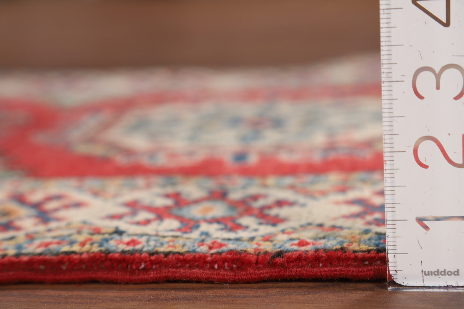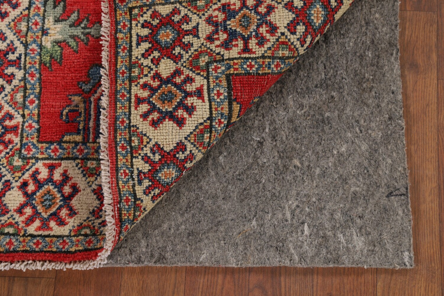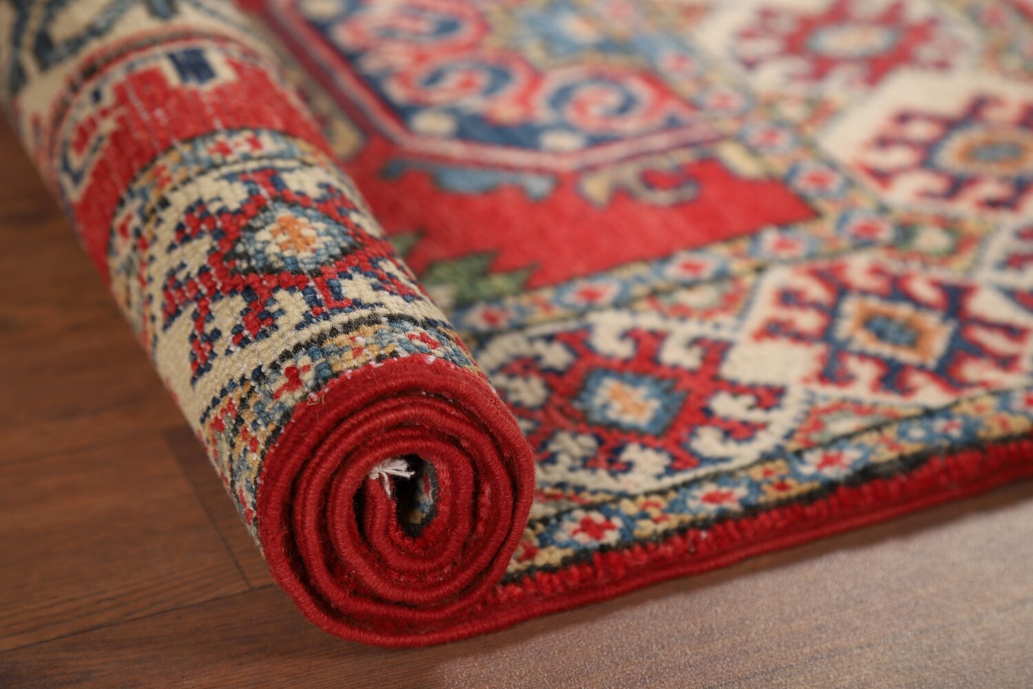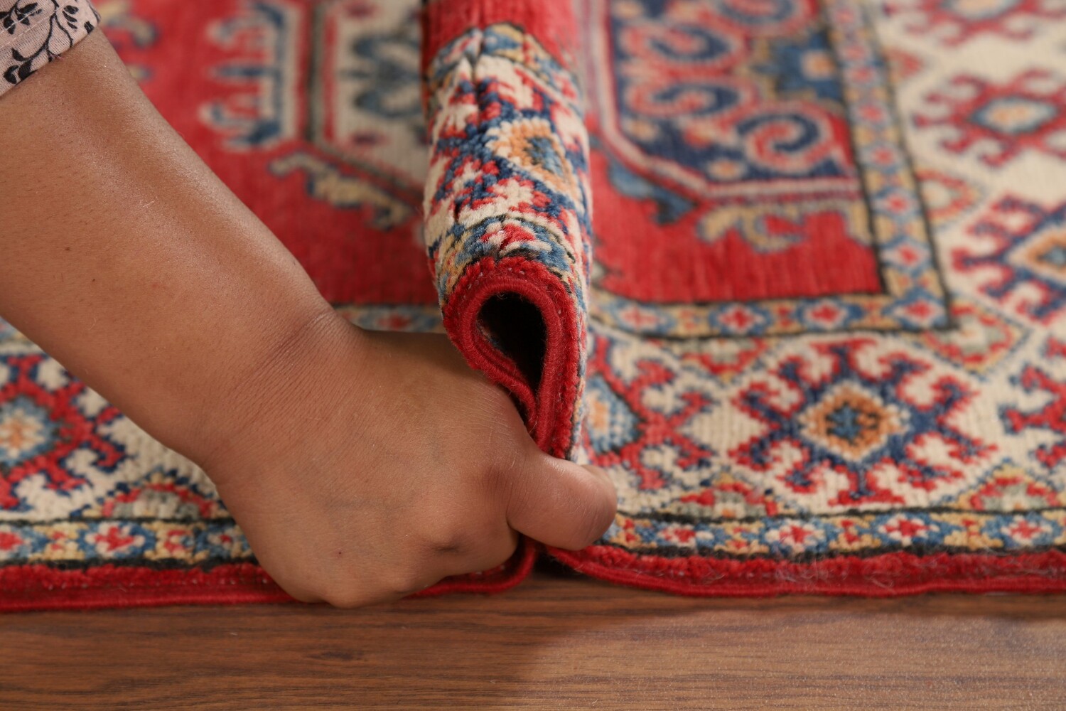 A Beautiful Genuine Pakistan Kazak rug is Hand Knotted by skillful weavers in Pakistan with 100% Wool Material. This rug is in New, First Quality condition. dimensions are 3' 1'' X 2' 1'' in foot and 94 X 64 in centimeter. the primary color is Red.