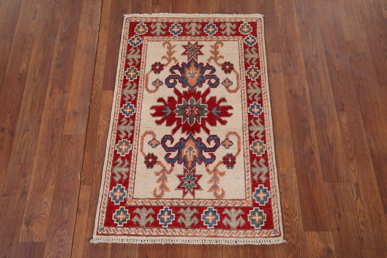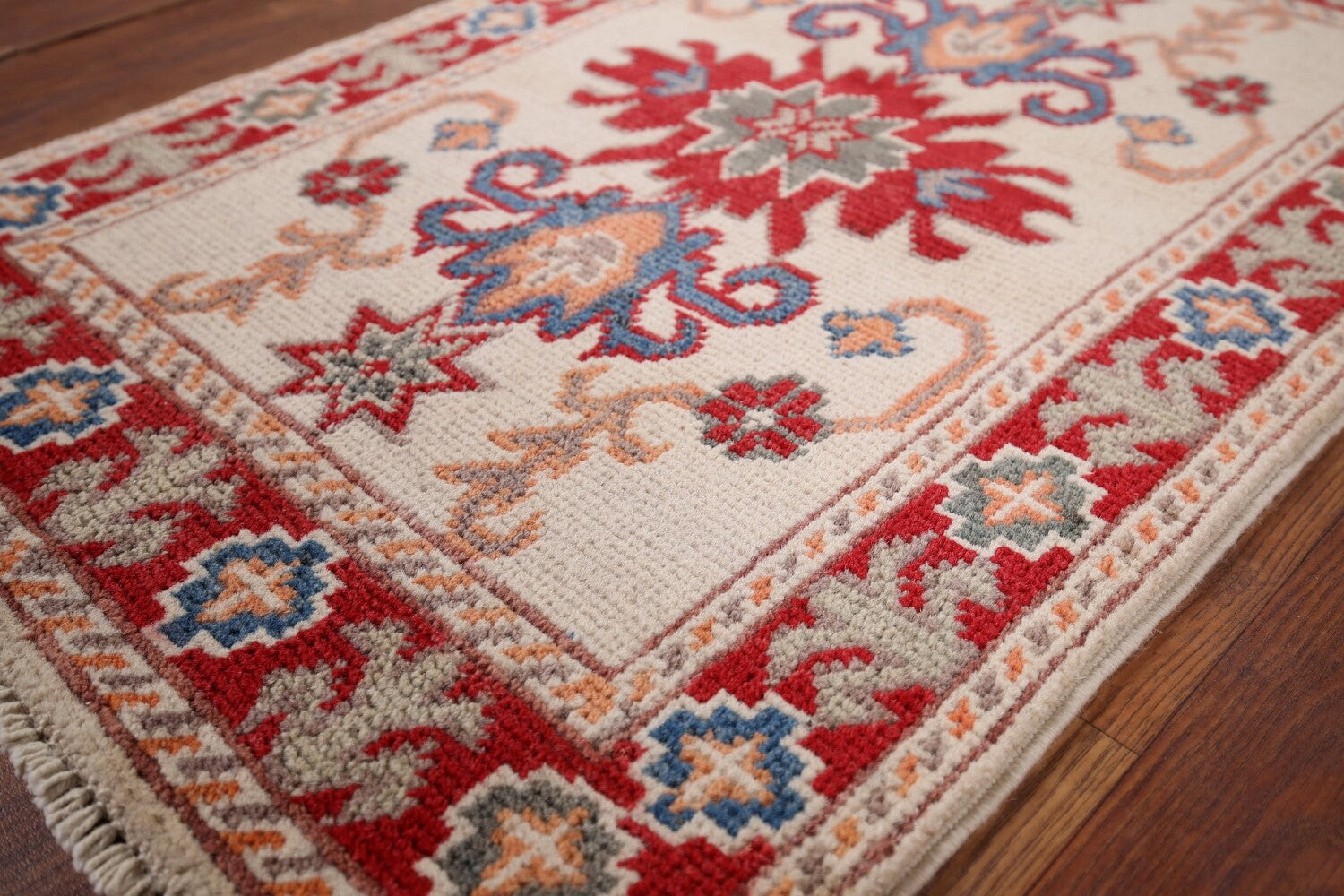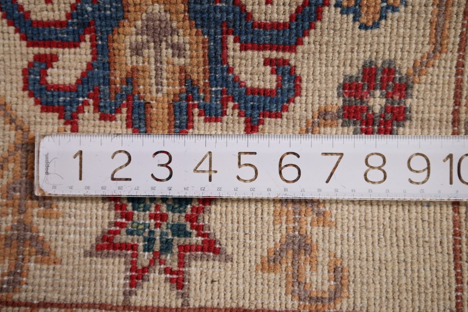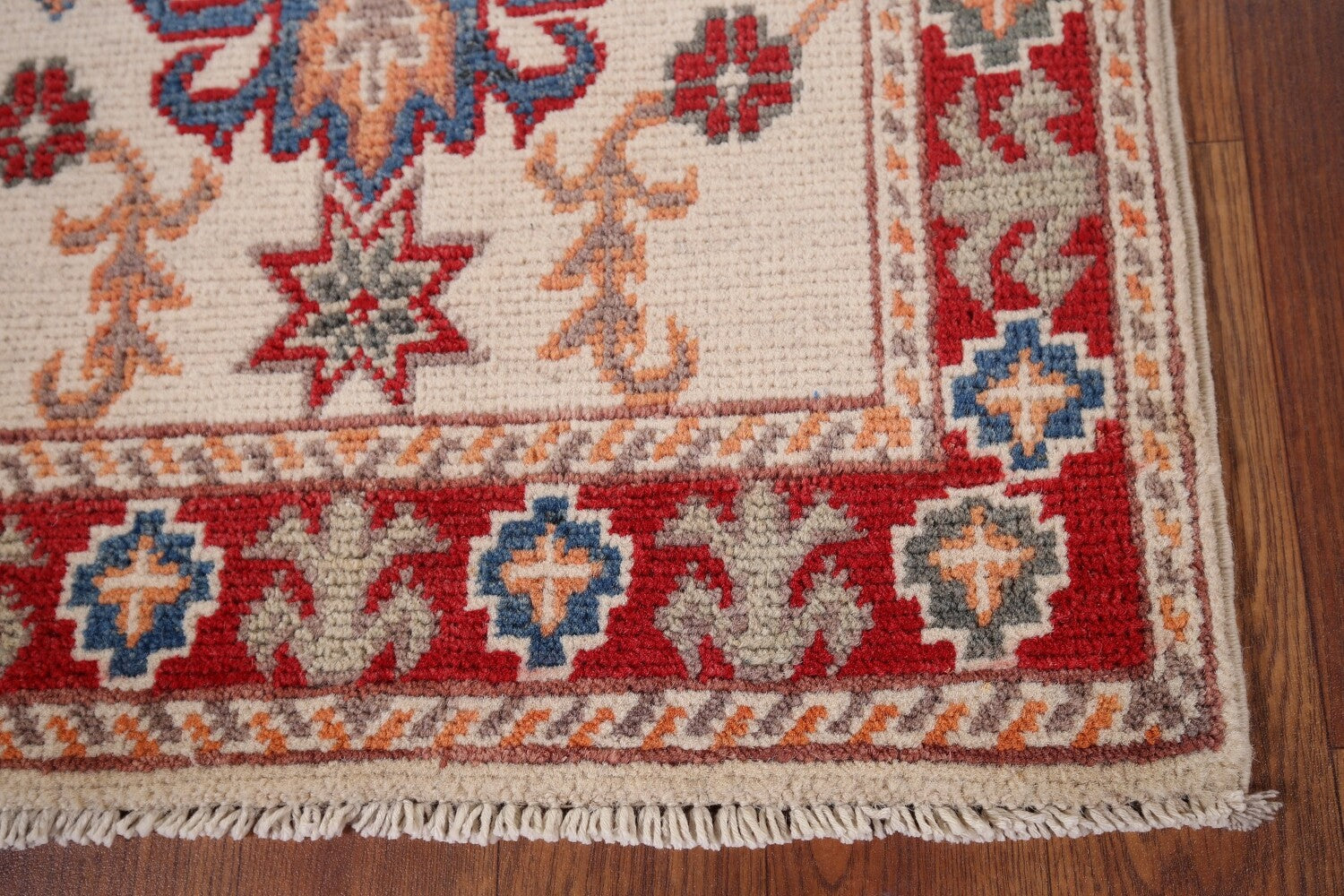 A Beautiful Genuine Pakistan Kazak rug is Hand Knotted by skillful weavers in Pakistan with 100% Wool Material. This rug is in New, First Quality condition. dimensions are 2' 10'' X 1' 10'' in foot and 86 X 56 in centimeter. the primary color is Beige & Ivories.
