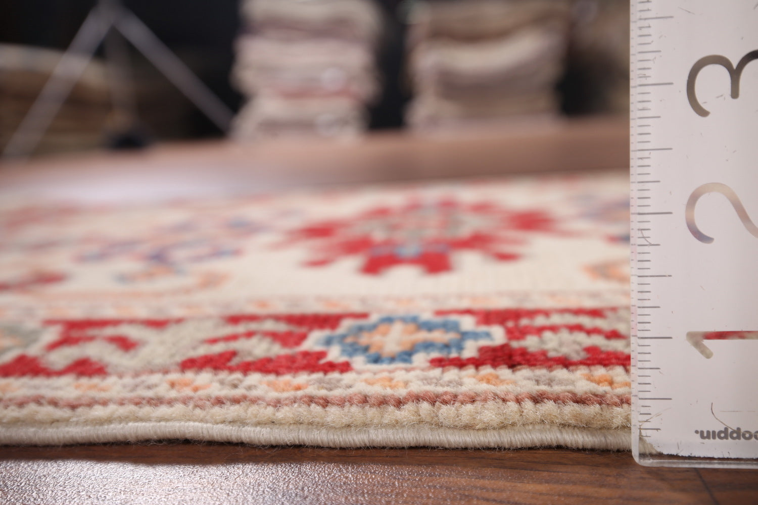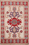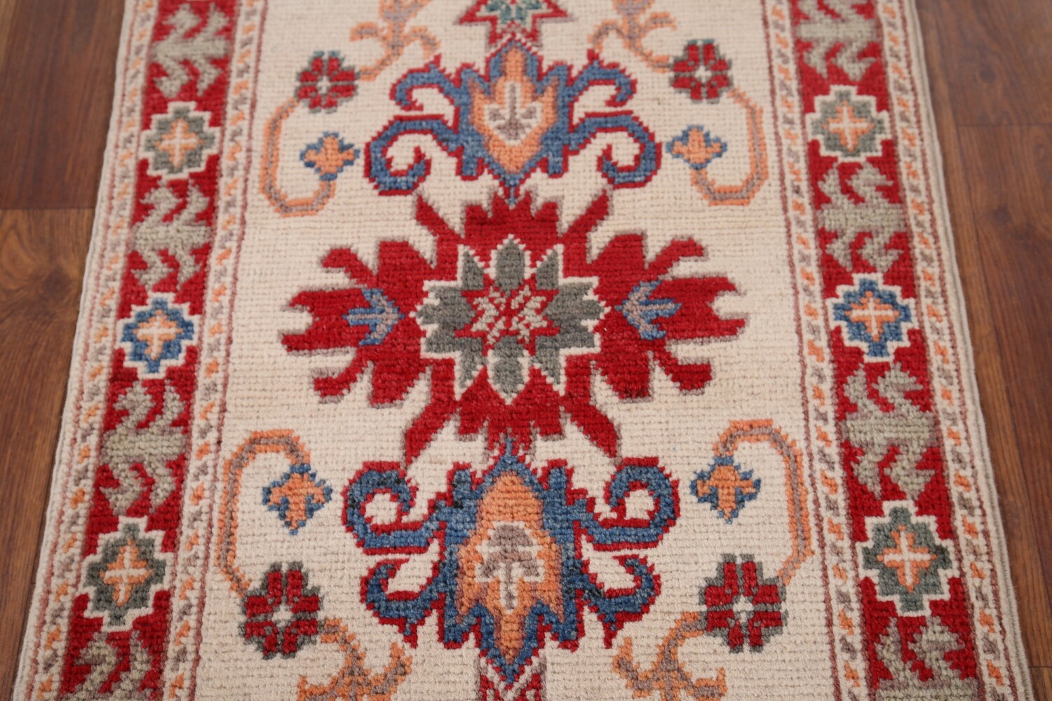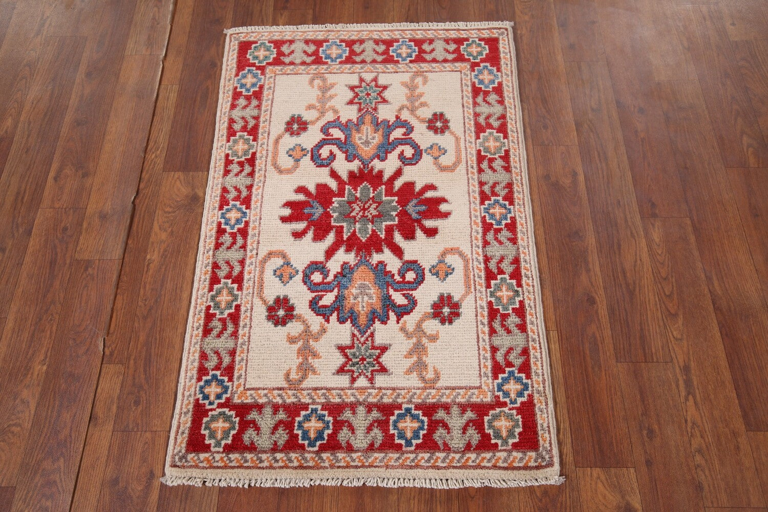 A Beautiful Genuine Pakistan Kazak rug is Hand Knotted by skillful weavers in Pakistan with 100% Wool Material. This rug is in New, First Quality condition. dimensions are 2' 10'' X 1' 10'' in foot and 86 X 56 in centimeter. the primary color is Beige & Ivories.