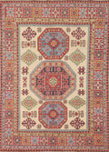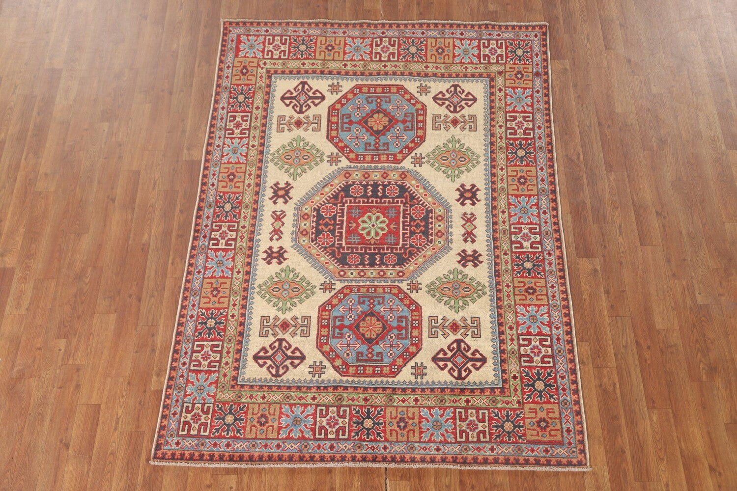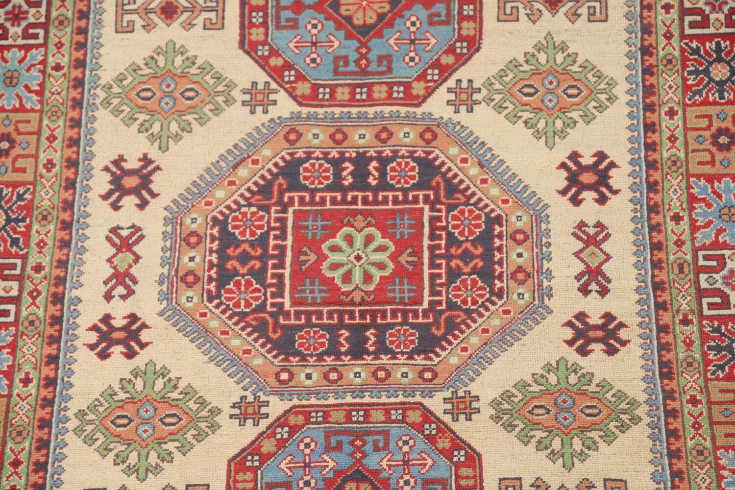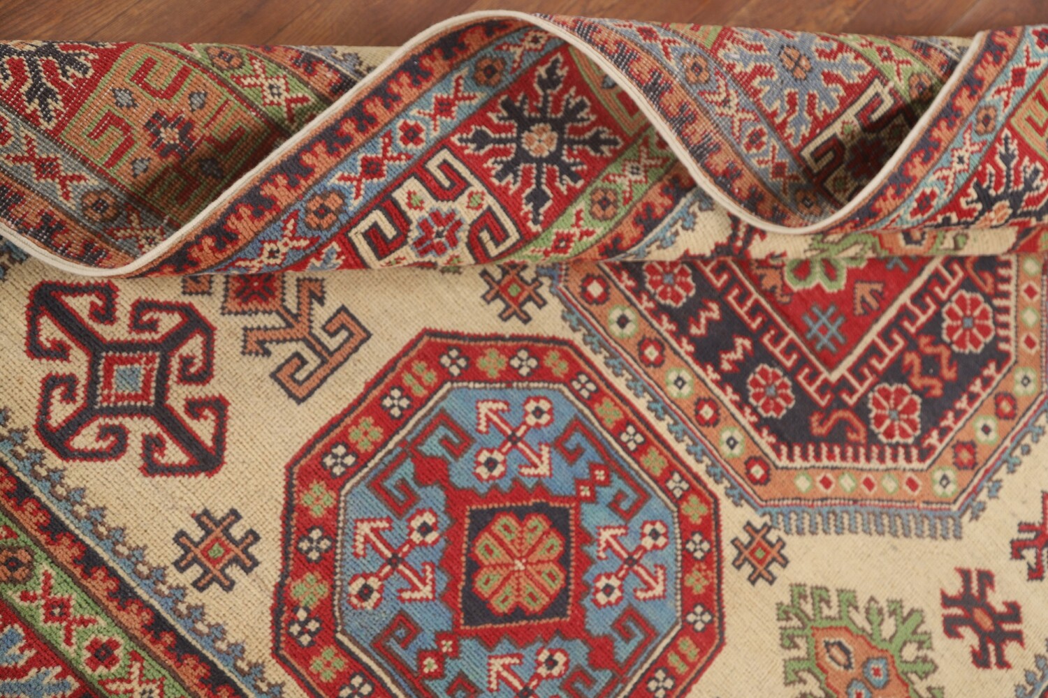 A Beautiful Genuine Pakistan Kazak rug is Hand Knotted by skillful weavers in Pakistan with 100% Wool Material. This rug is in New, First Quality condition. dimensions are 6' 8'' X 4' 10'' in foot and 203 X 147 in centimeter. the primary color is Beige & Ivories.