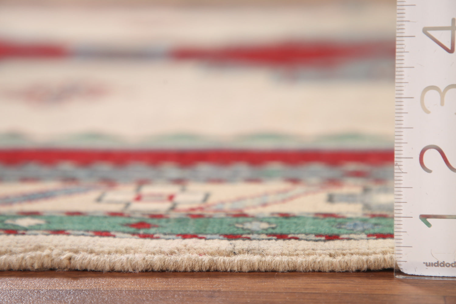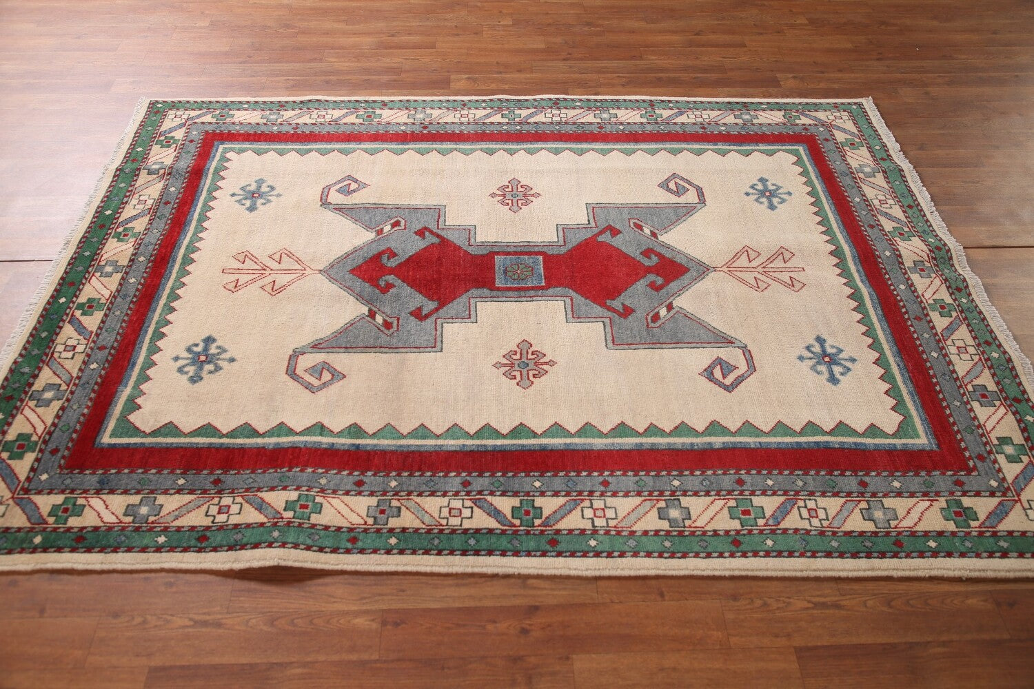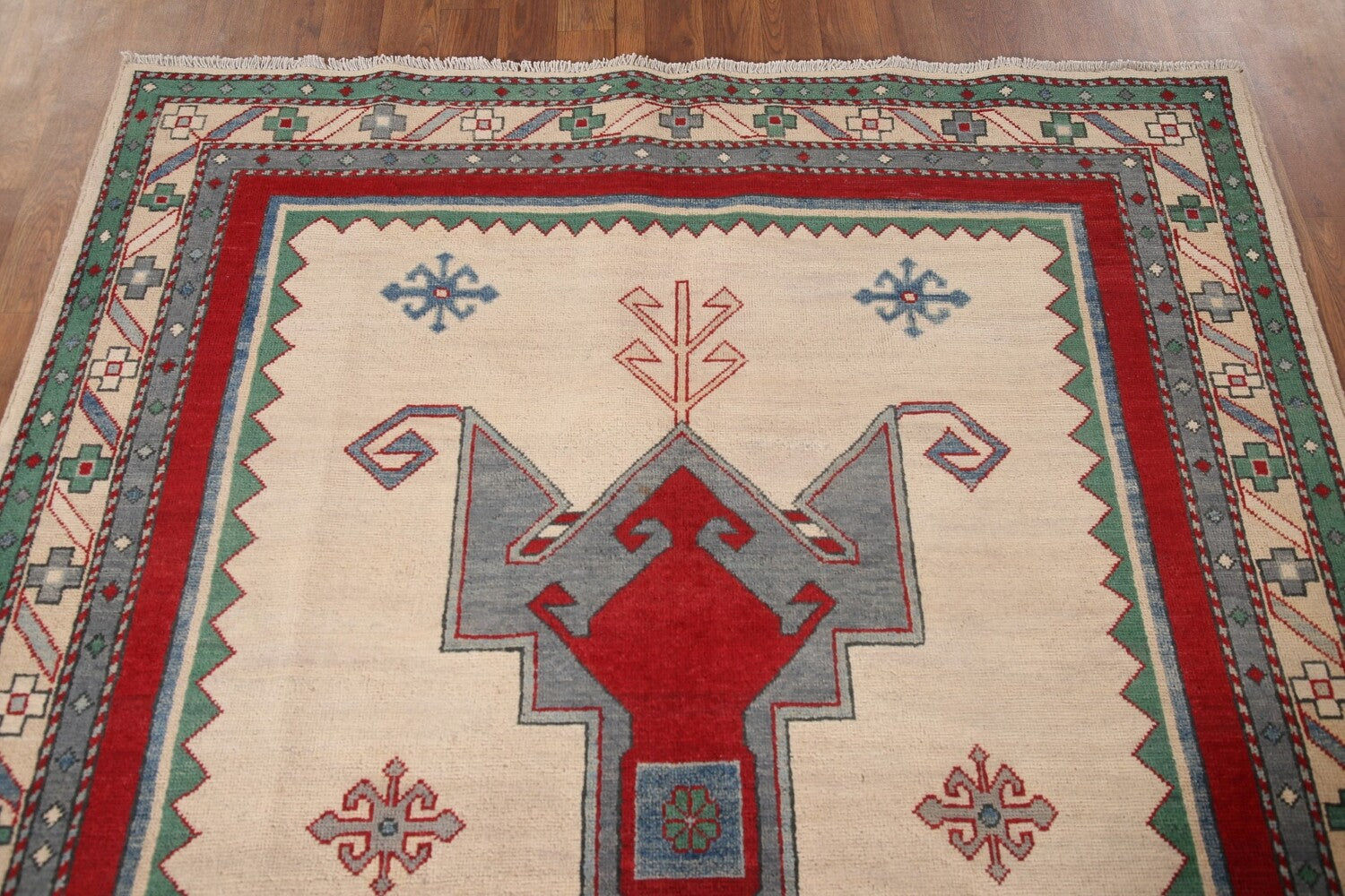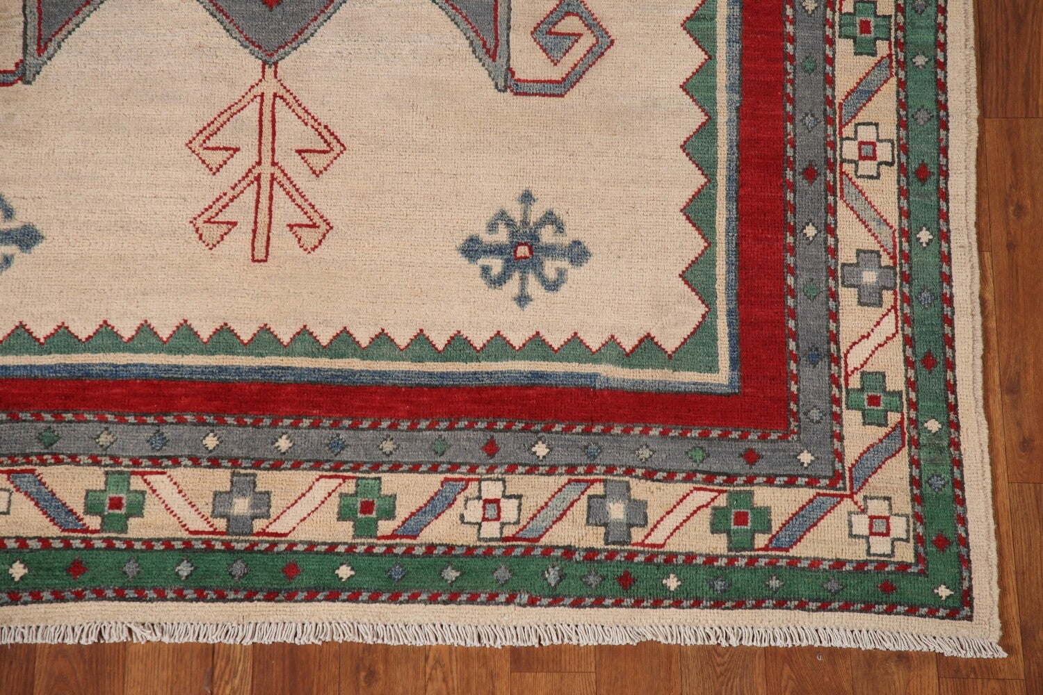 A Beautiful Genuine Pakistan Kazak rug is Hand Knotted by skillful weavers in Pakistan with 100% Wool Material. This rug is in New, First Quality condition. dimensions are 6' 10'' X 5' 0'' in foot and 208 X 152 in centimeter. the primary color is Beige & Ivories.