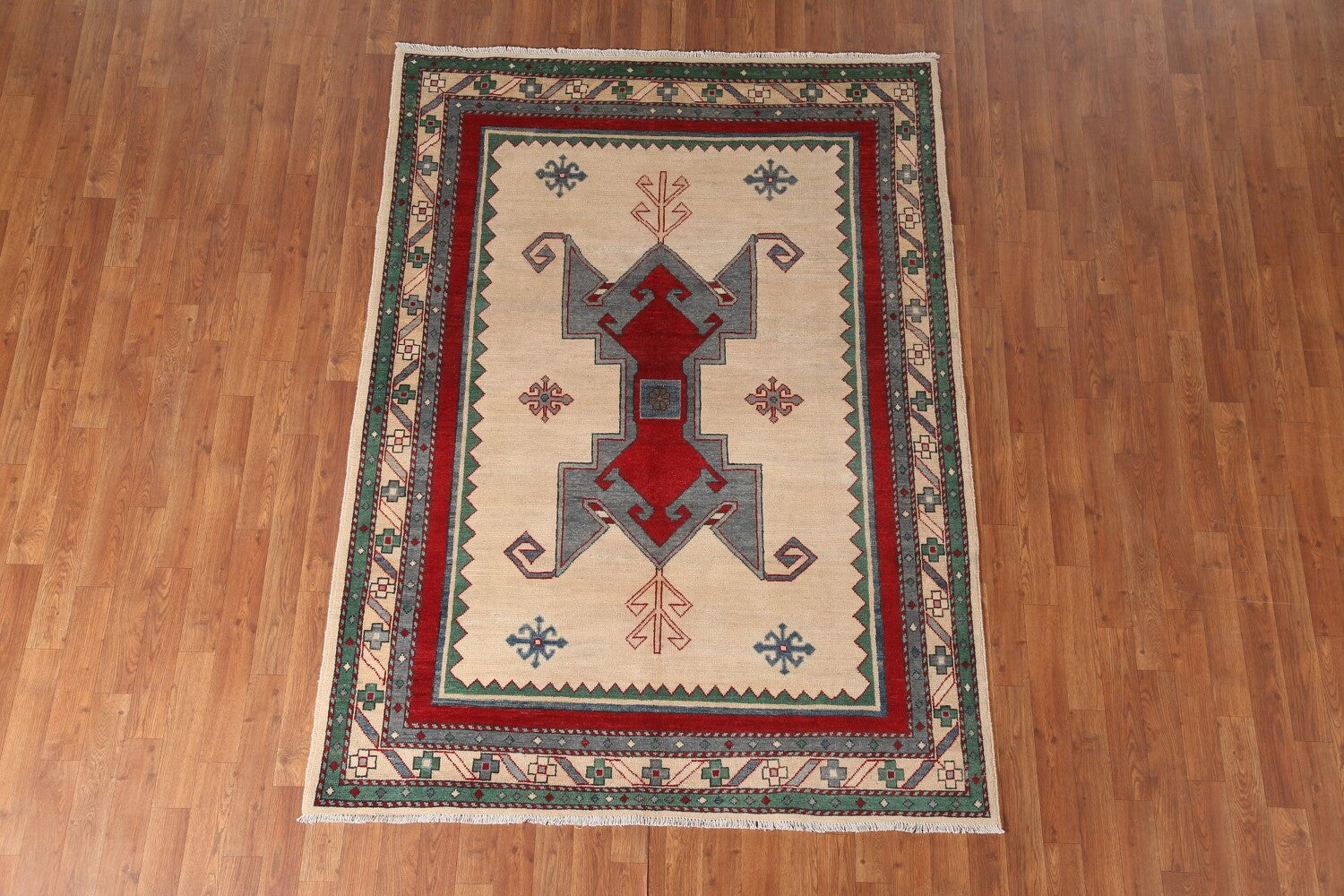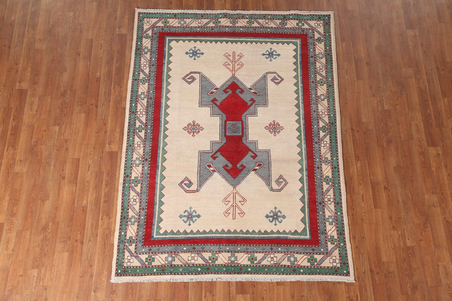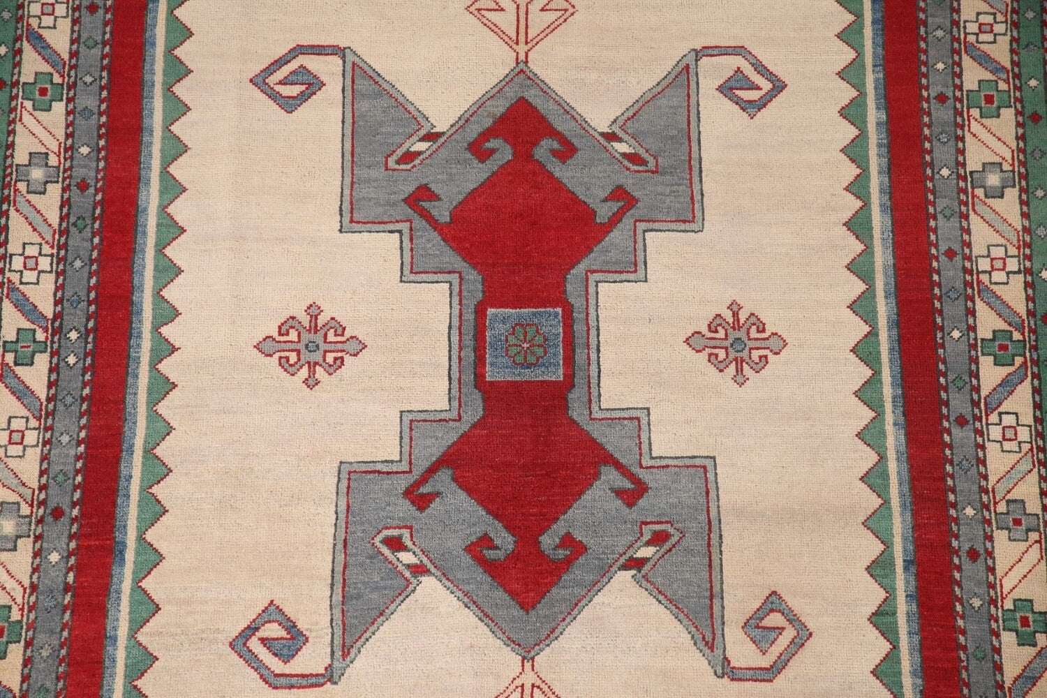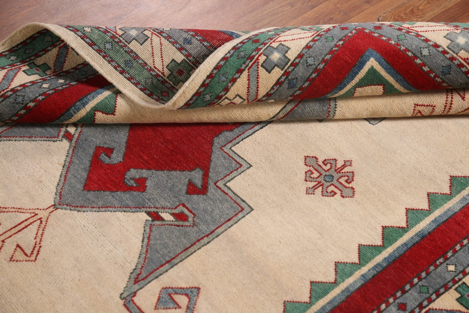 A Beautiful Genuine Pakistan Kazak rug is Hand Knotted by skillful weavers in Pakistan with 100% Wool Material. This rug is in New, First Quality condition. dimensions are 6' 10'' X 5' 0'' in foot and 208 X 152 in centimeter. the primary color is Beige & Ivories.