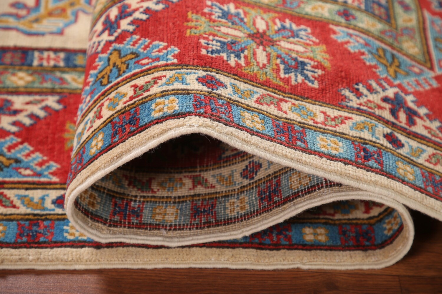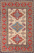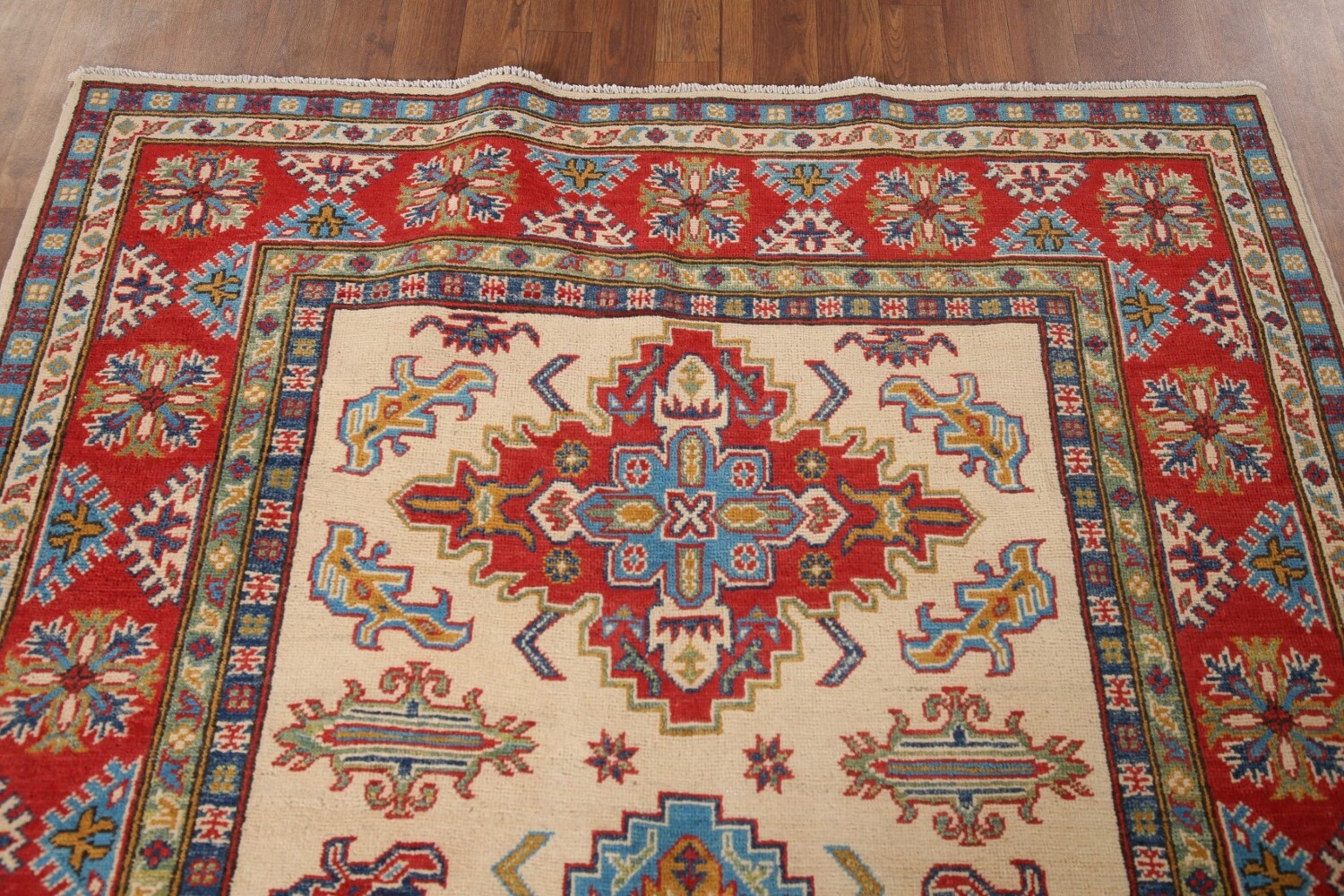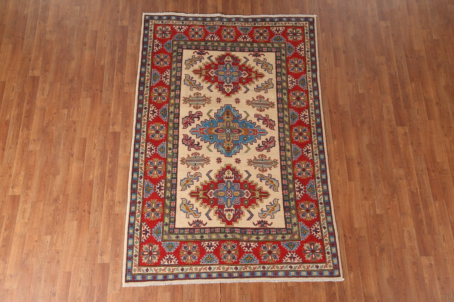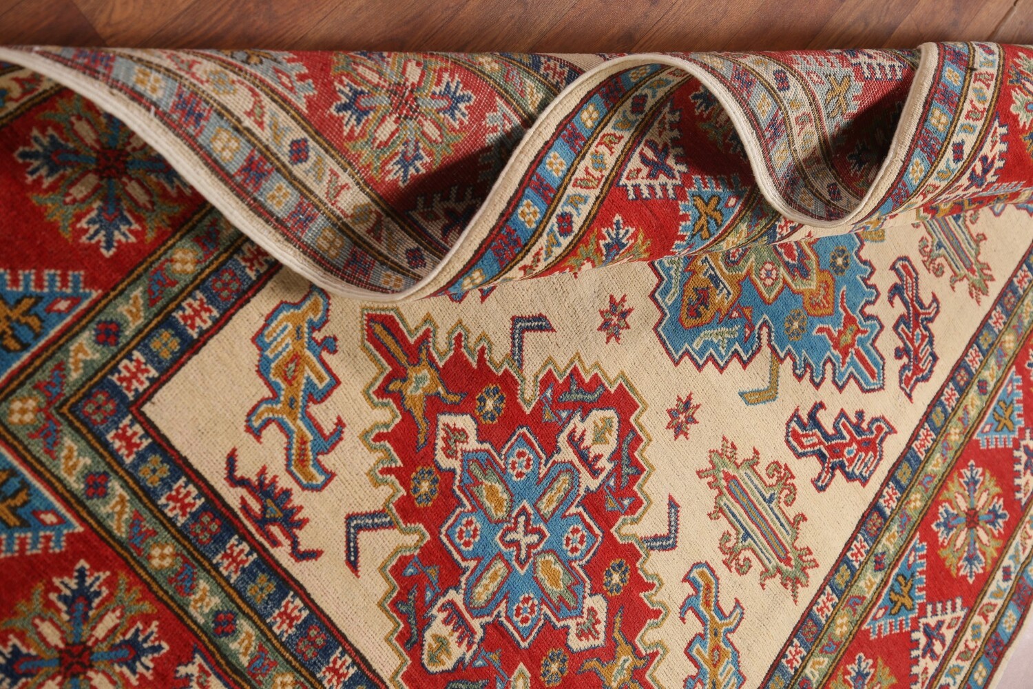 A Beautiful Genuine Pakistan Kazak rug is Hand Knotted by skillful weavers in Pakistan with 100% Wool Material. This rug is in New, First Quality condition. dimensions are 7' 3'' X 4' 10'' in foot and 221 X 147 in centimeter. the primary color is Beige & Ivories.