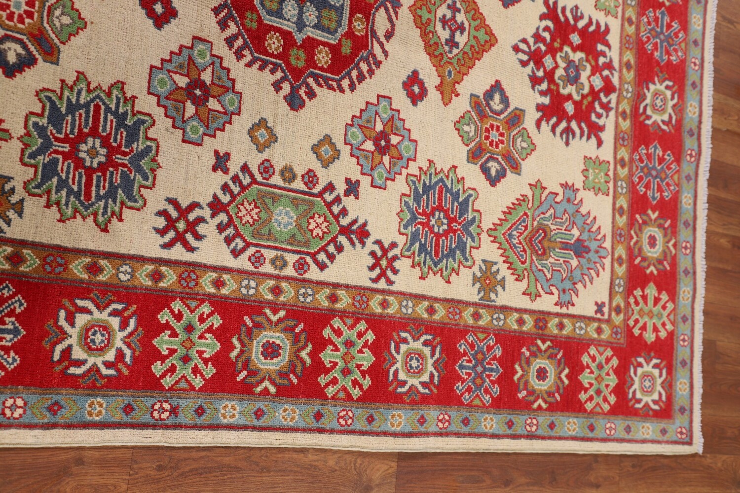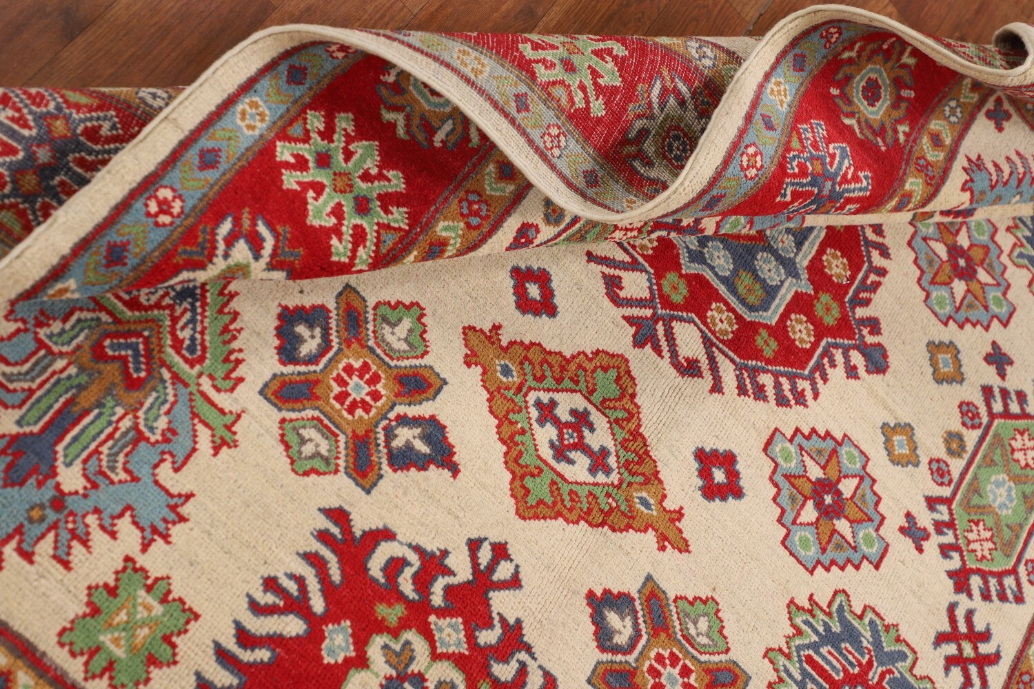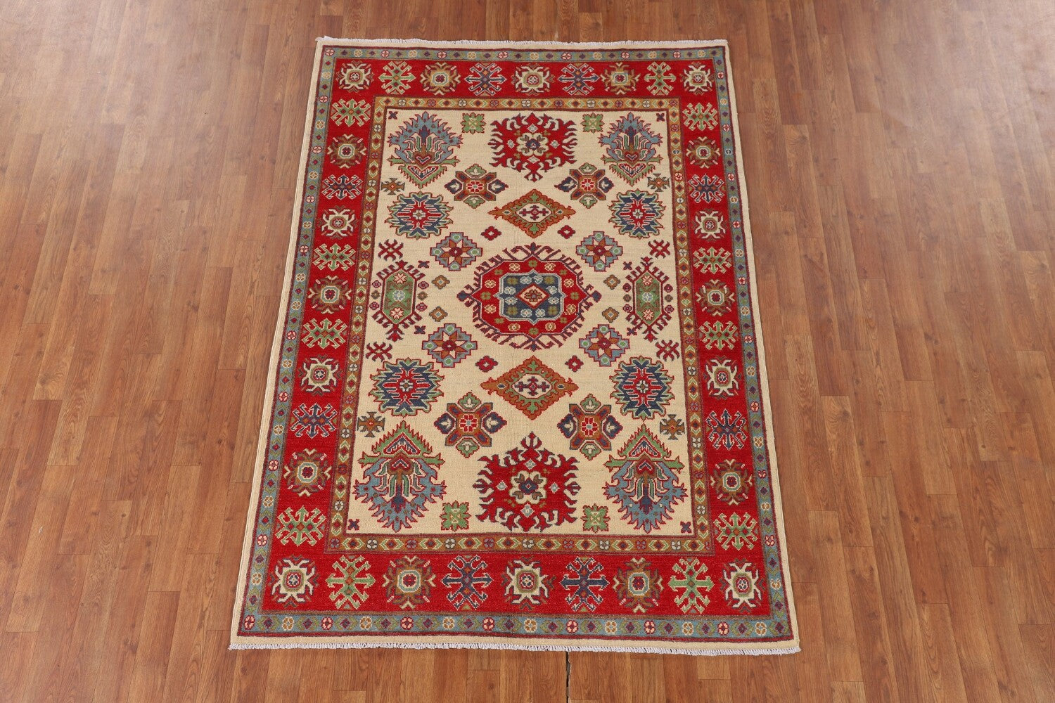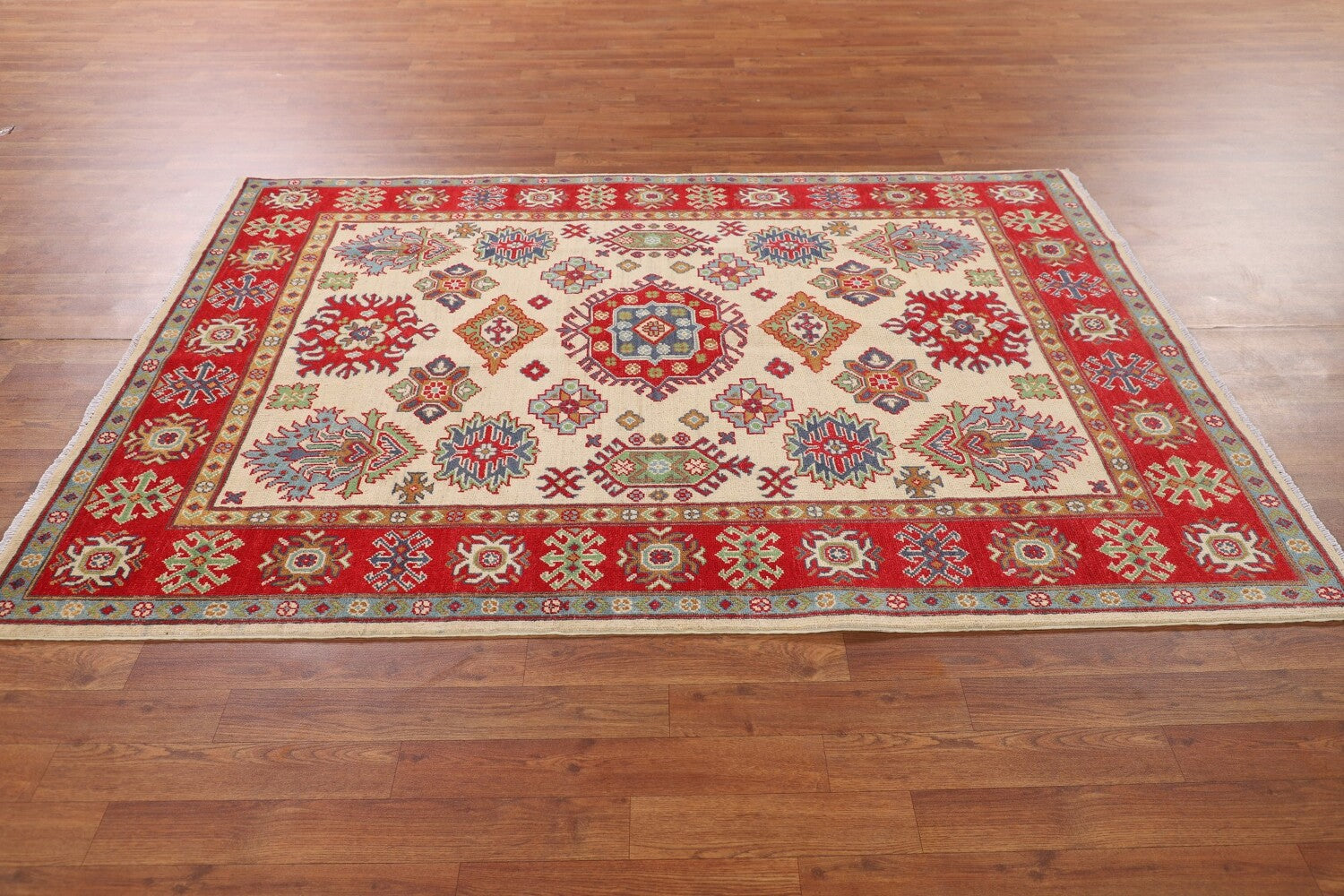 A Beautiful Genuine Pakistan Kazak rug is Hand Knotted by skillful weavers in Pakistan with 100% Wool Material. This rug is in New, First Quality condition. dimensions are 6' 10'' X 4' 9'' in foot and 208 X 145 in centimeter. the primary color is Beige & Ivories.