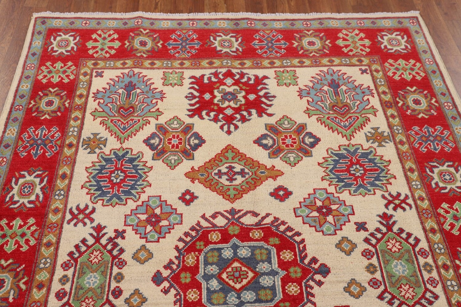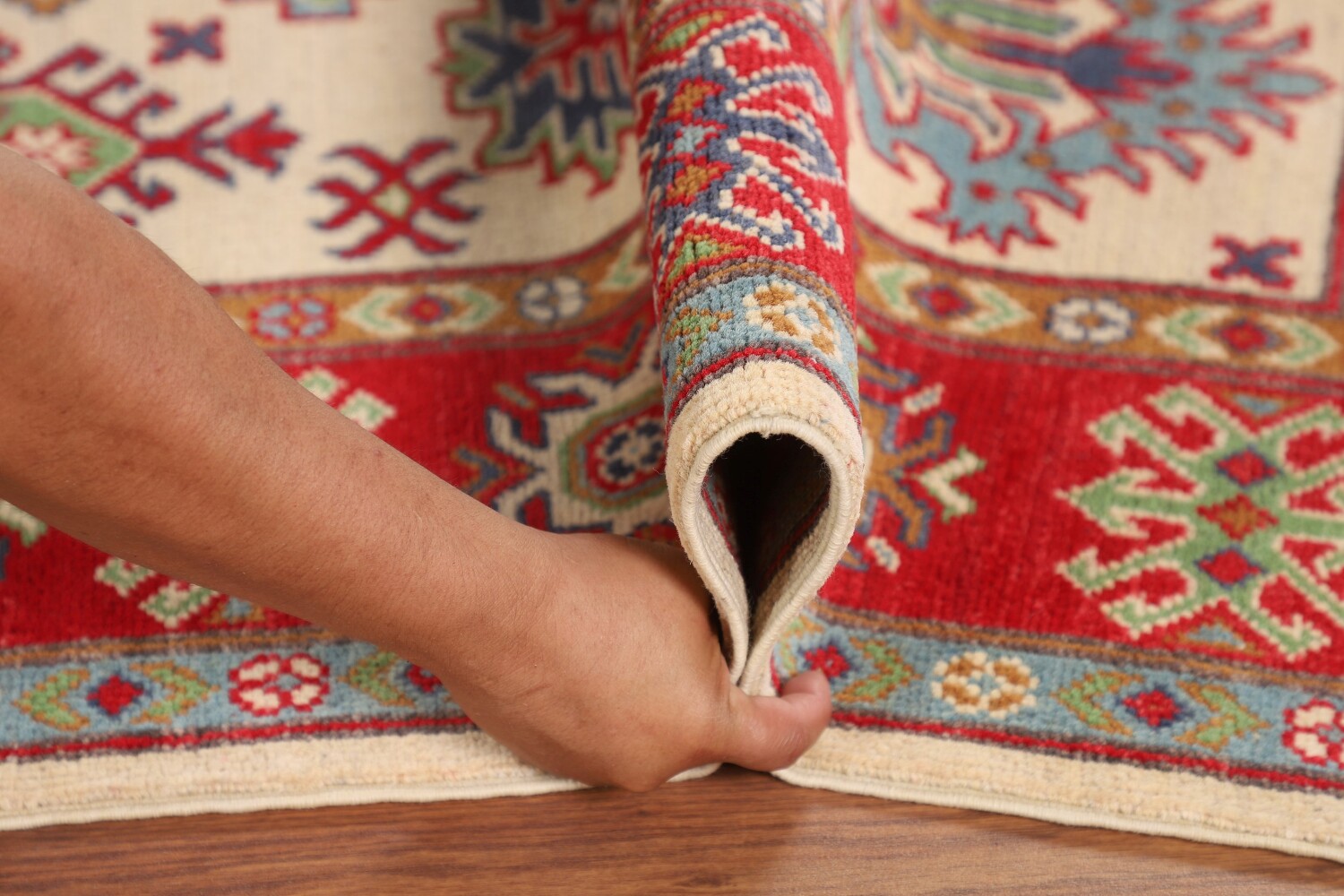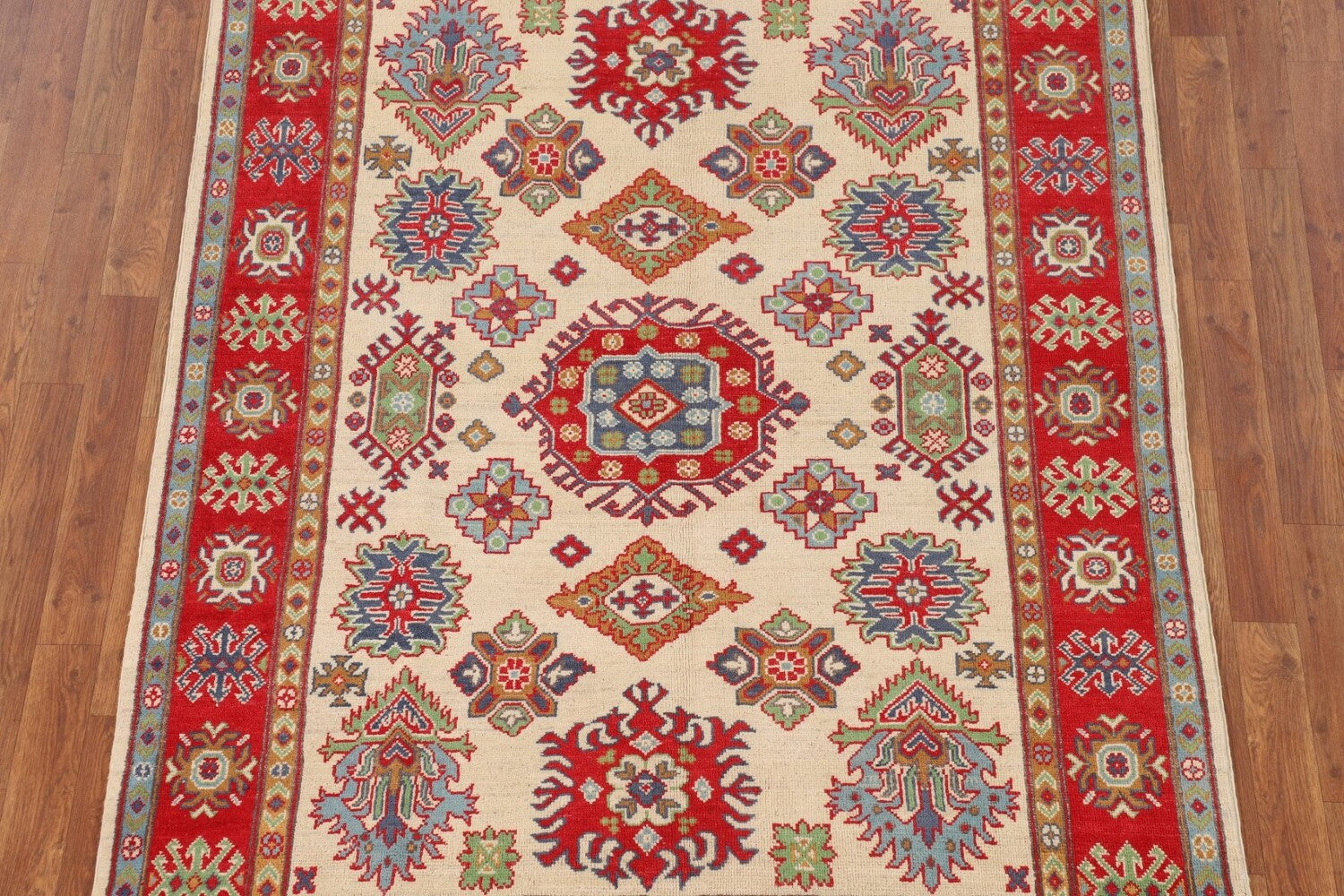 A Beautiful Genuine Pakistan Kazak rug is Hand Knotted by skillful weavers in Pakistan with 100% Wool Material. This rug is in New, First Quality condition. dimensions are 6' 10'' X 4' 9'' in foot and 208 X 145 in centimeter. the primary color is Beige & Ivories.