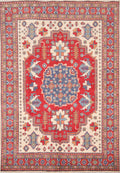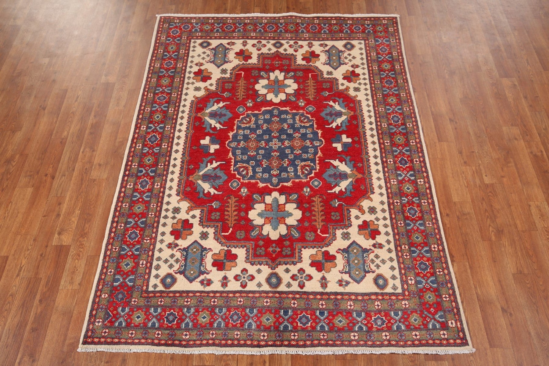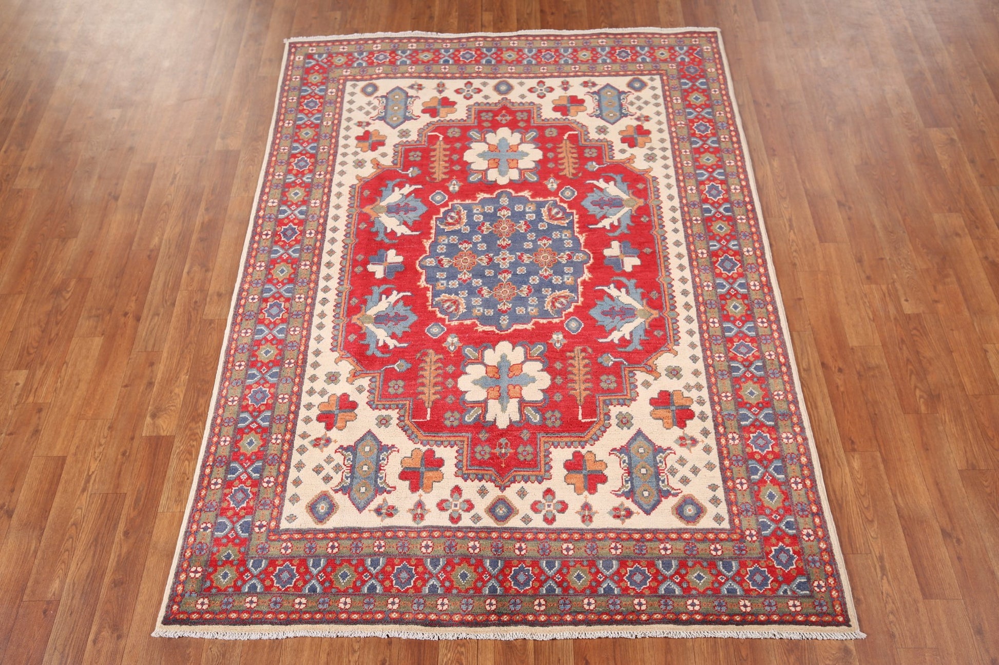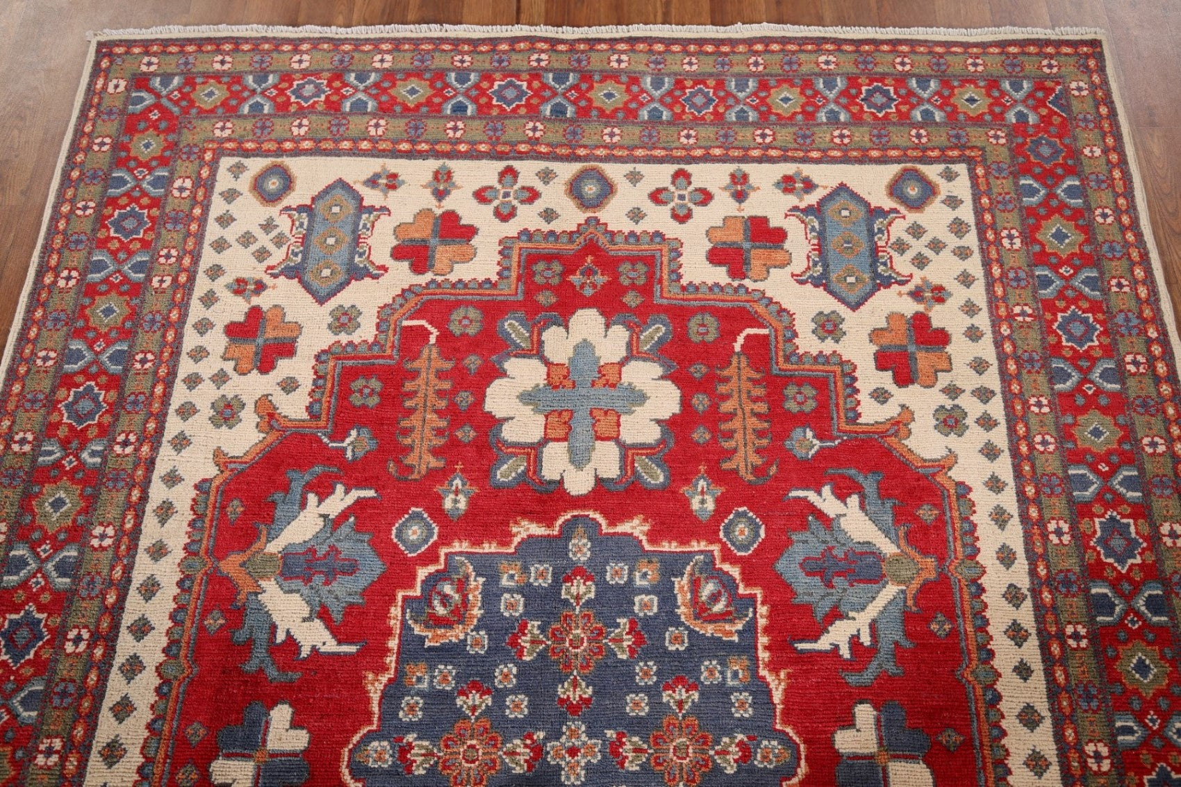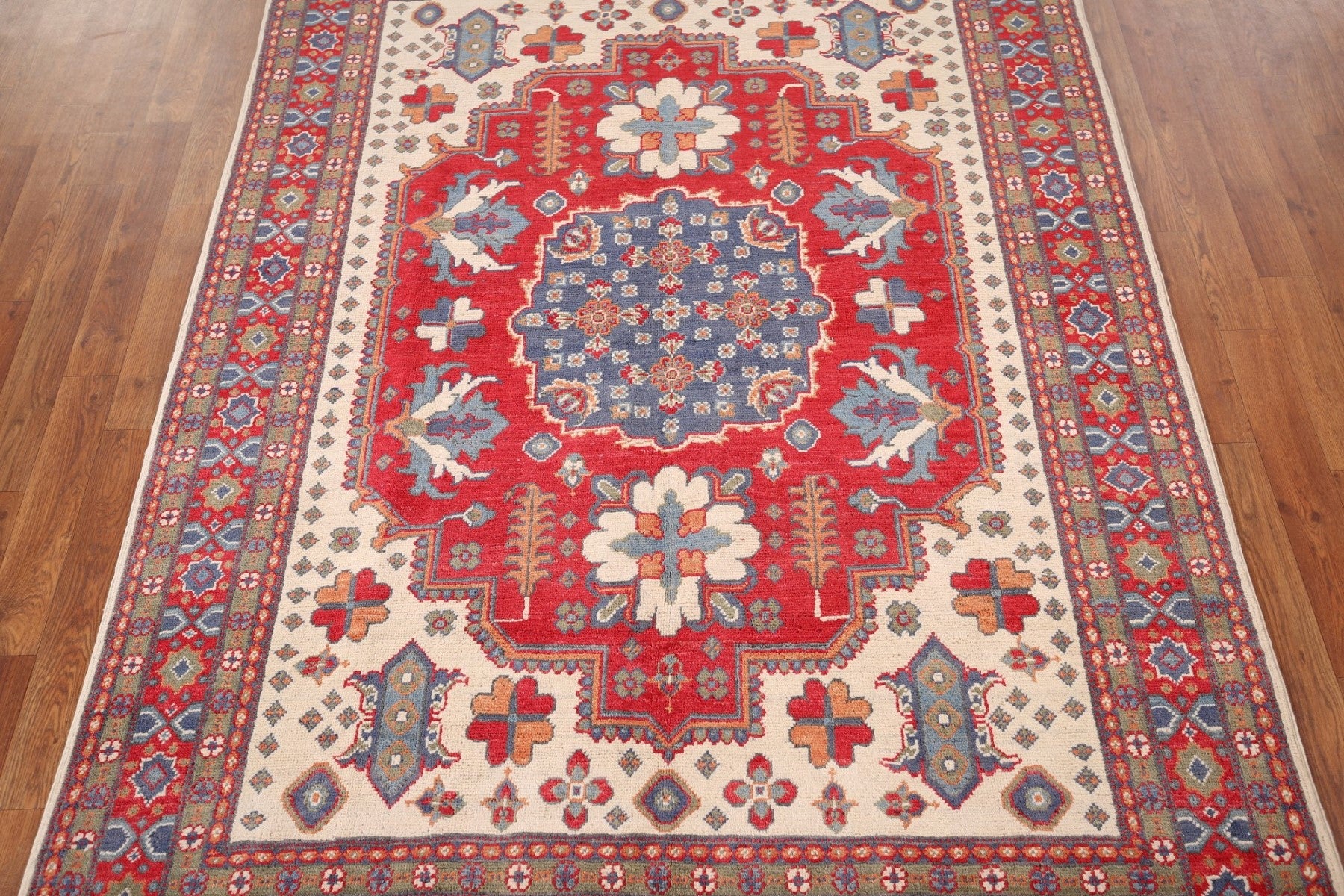 A Beautiful Genuine Pakistan Kazak rug is Hand Knotted by skillful weavers in Pakistan with 100% Wool Material. This rug is in New, First Quality condition. dimensions are 6' 8'' X 4' 11'' in foot and  203 X 150 in centimeter. the primary color is Red.