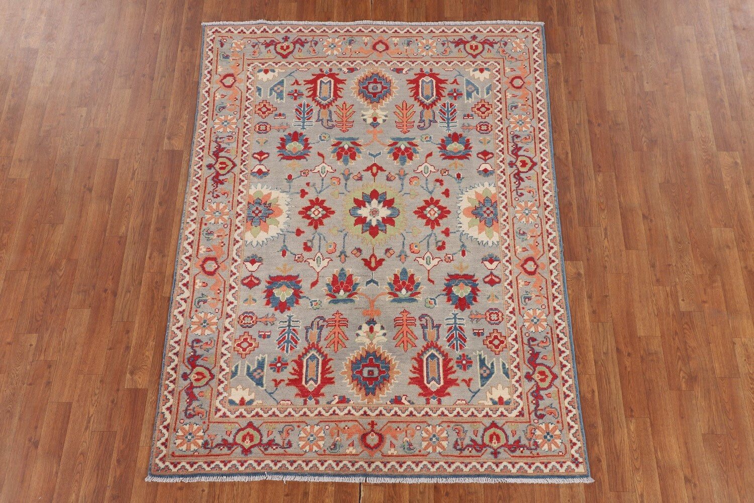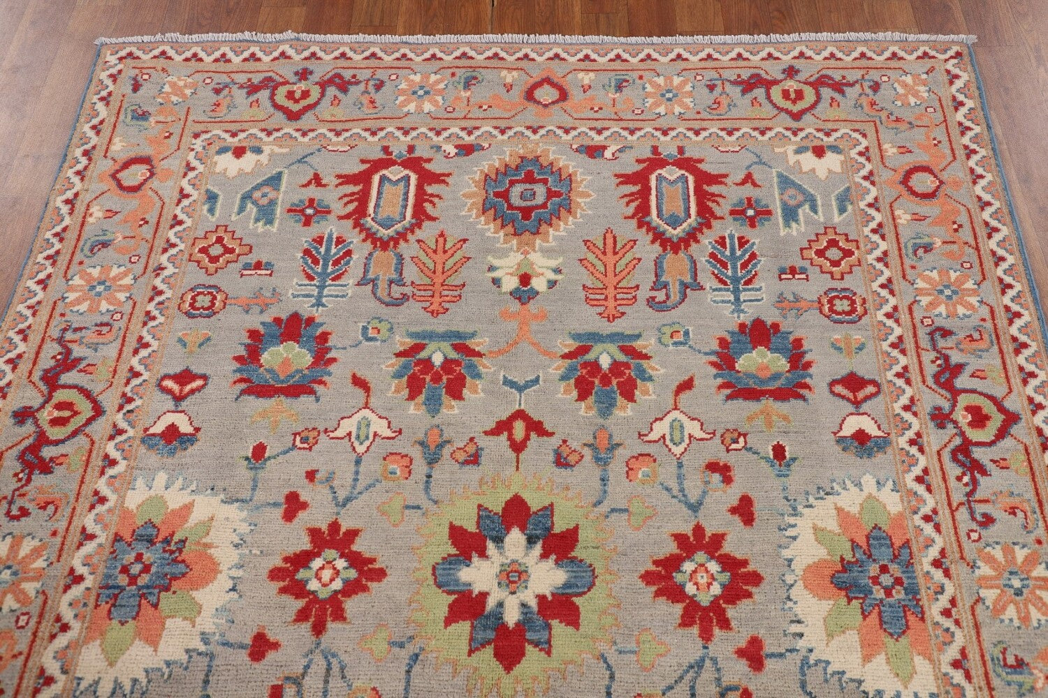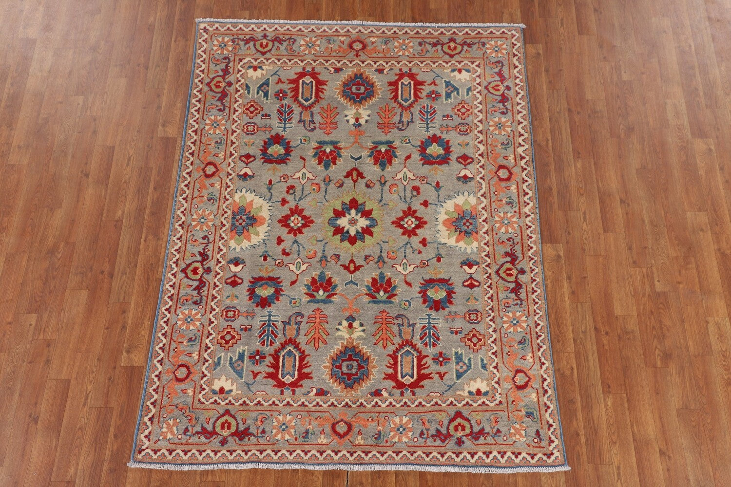 A Beautiful Genuine Pakistan Kazak rug is Hand Knotted by skillful weavers in Pakistan with 100% Wool Material. This rug is in New, First Quality condition. dimensions are 6' 6'' X 4' 10'' in foot and 198 X 147 in centimeter. the primary color is Greys & Charcoal.