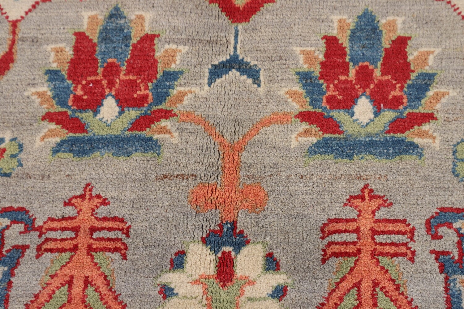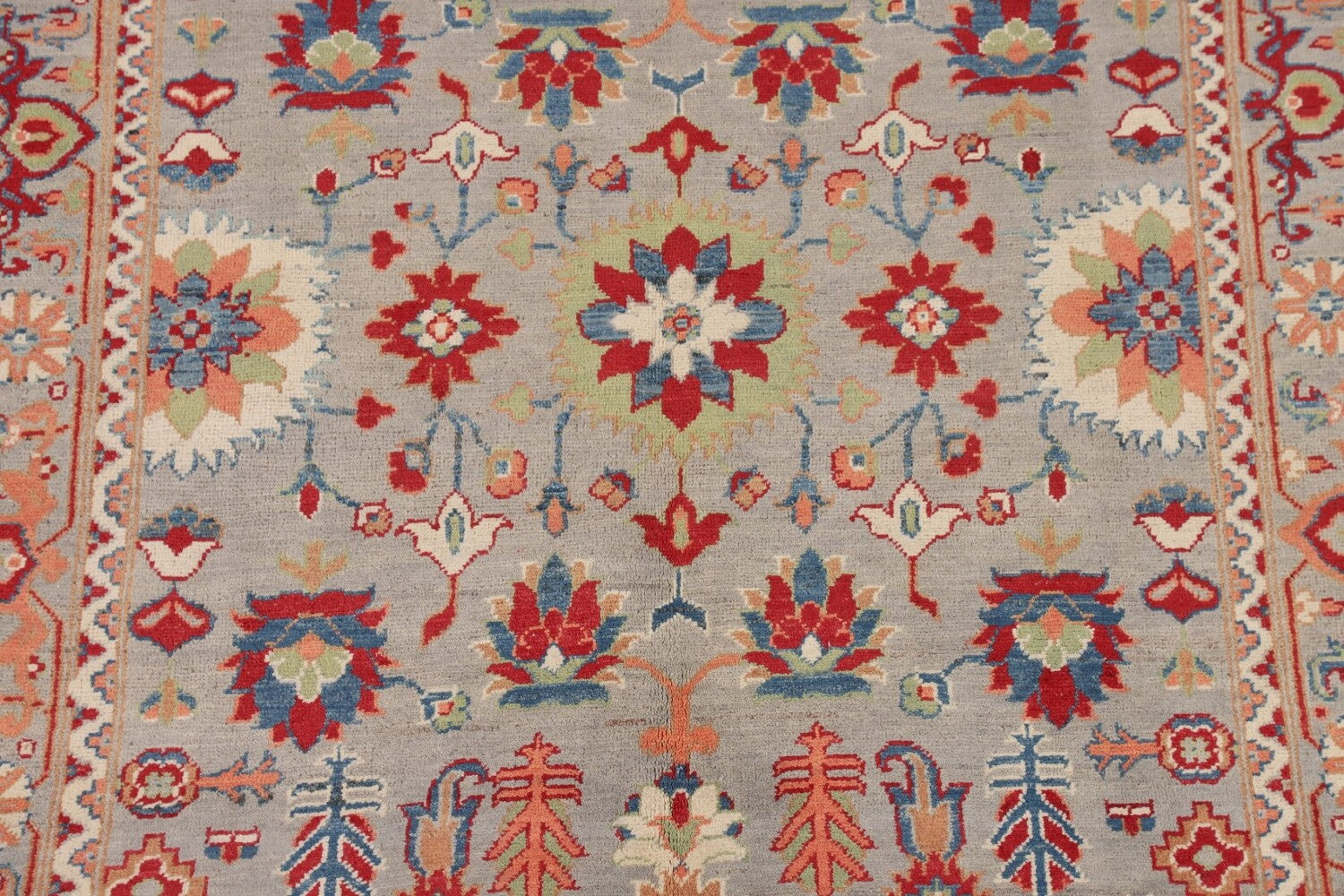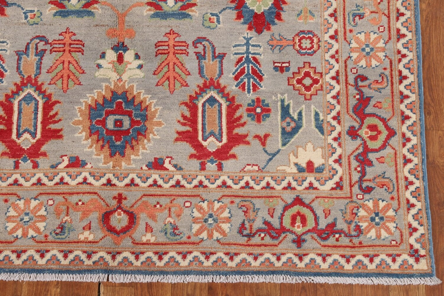 A Beautiful Genuine Pakistan Kazak rug is Hand Knotted by skillful weavers in Pakistan with 100% Wool Material. This rug is in New, First Quality condition. dimensions are 6' 6'' X 4' 10'' in foot and 198 X 147 in centimeter. the primary color is Greys & Charcoal.