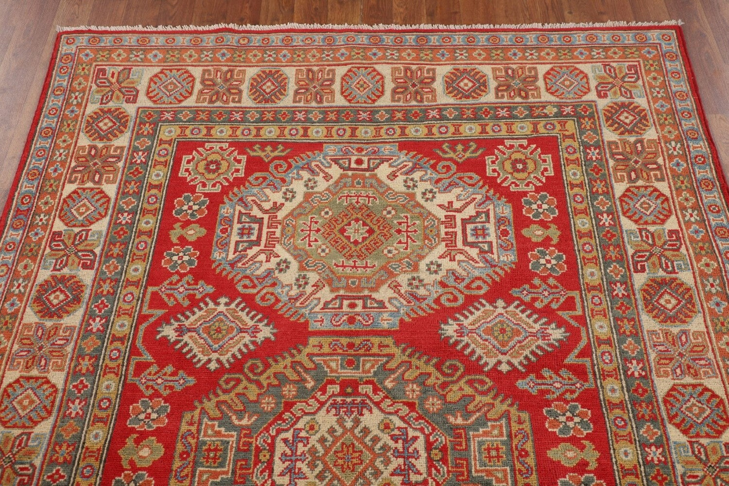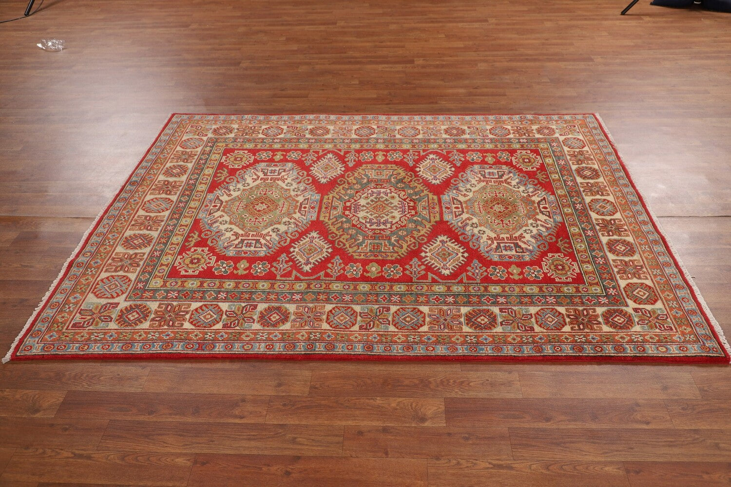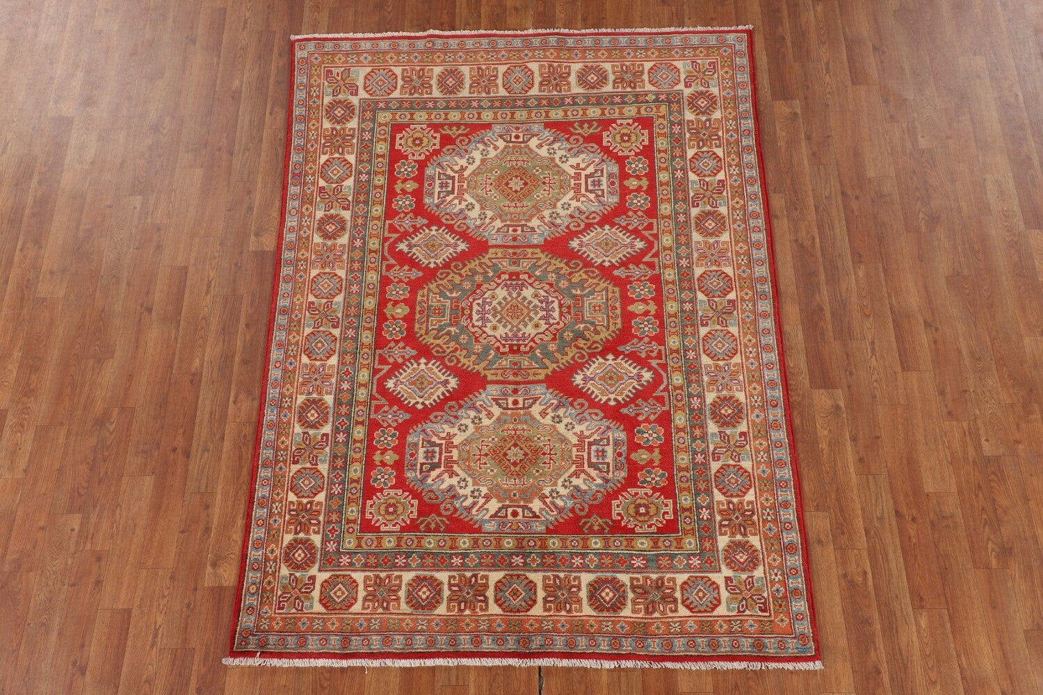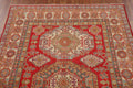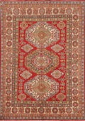 A Beautiful Genuine Pakistan Kazak rug is Hand Knotted by skillful weavers in Pakistan with 100% Wool Material. This rug is in New, First Quality condition. dimensions are 6' 7'' X 4' 9'' in foot and 201 X 145 in centimeter. the primary color is Red.