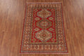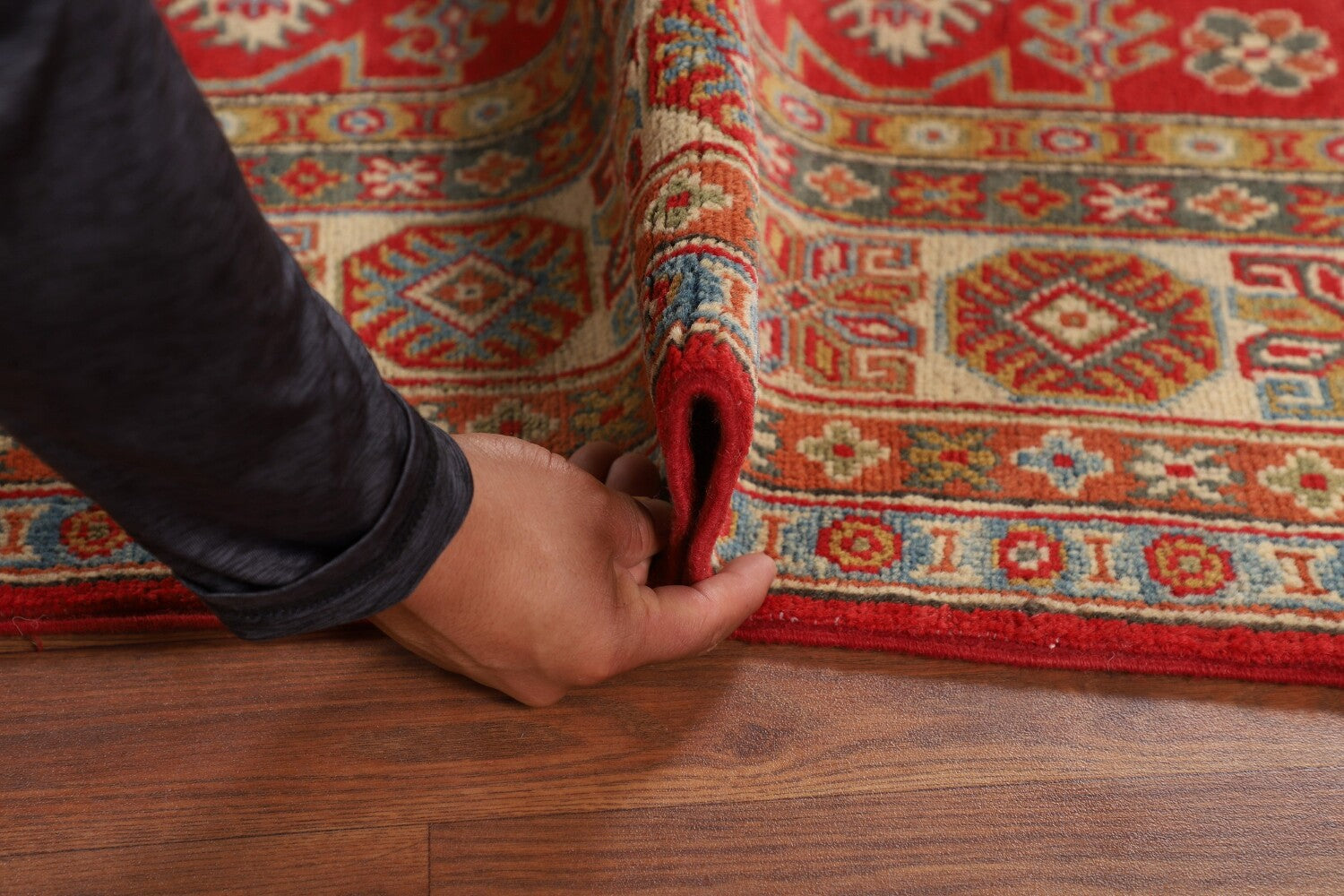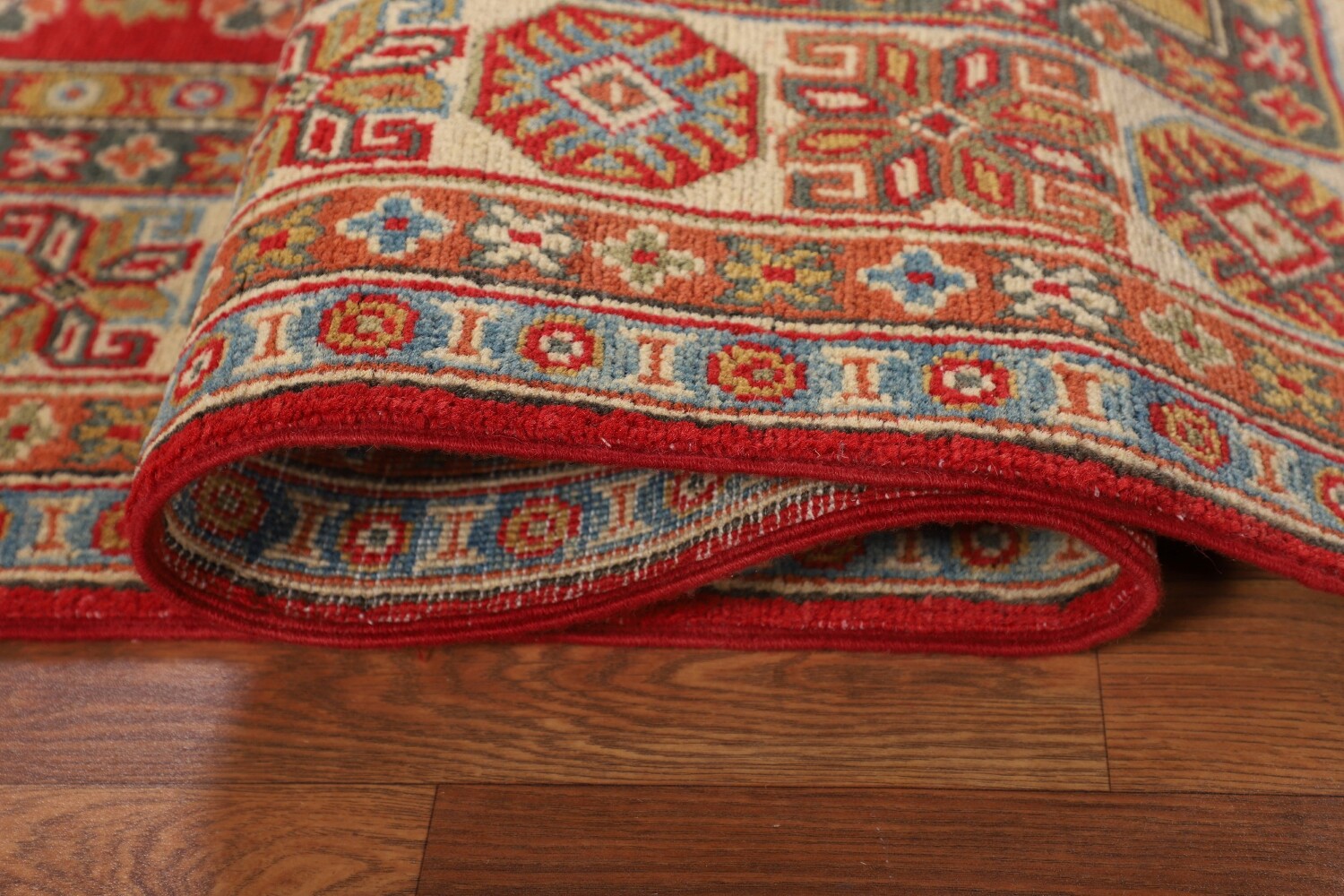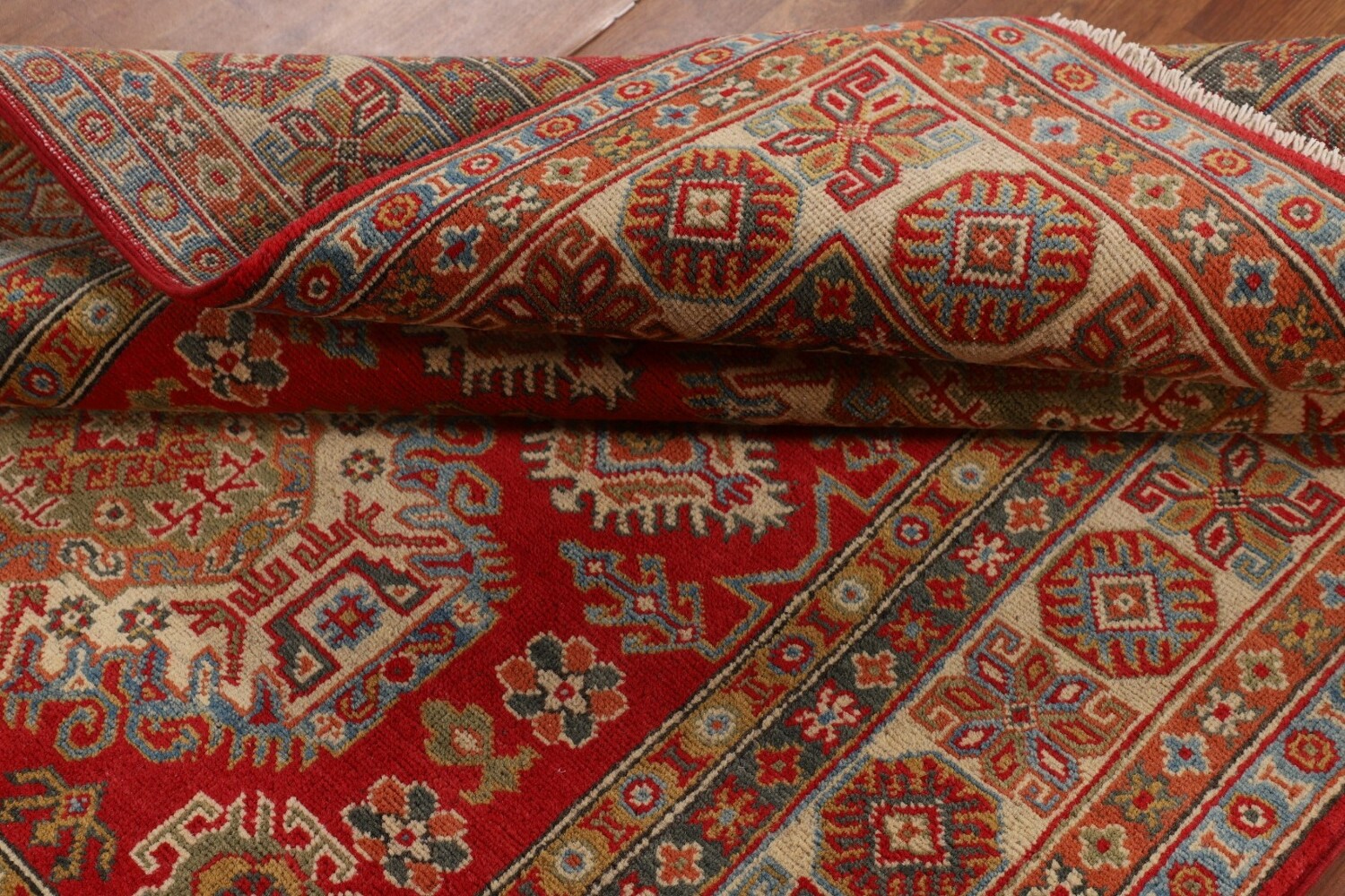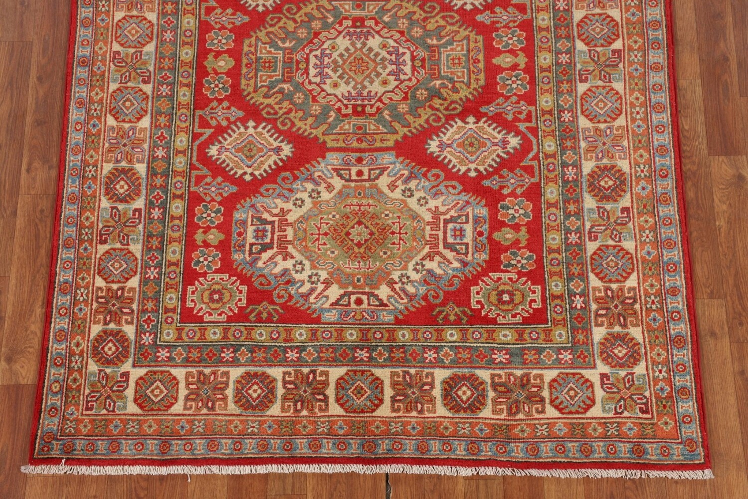 A Beautiful Genuine Pakistan Kazak rug is Hand Knotted by skillful weavers in Pakistan with 100% Wool Material. This rug is in New, First Quality condition. dimensions are 6' 7'' X 4' 9'' in foot and 201 X 145 in centimeter. the primary color is Red.