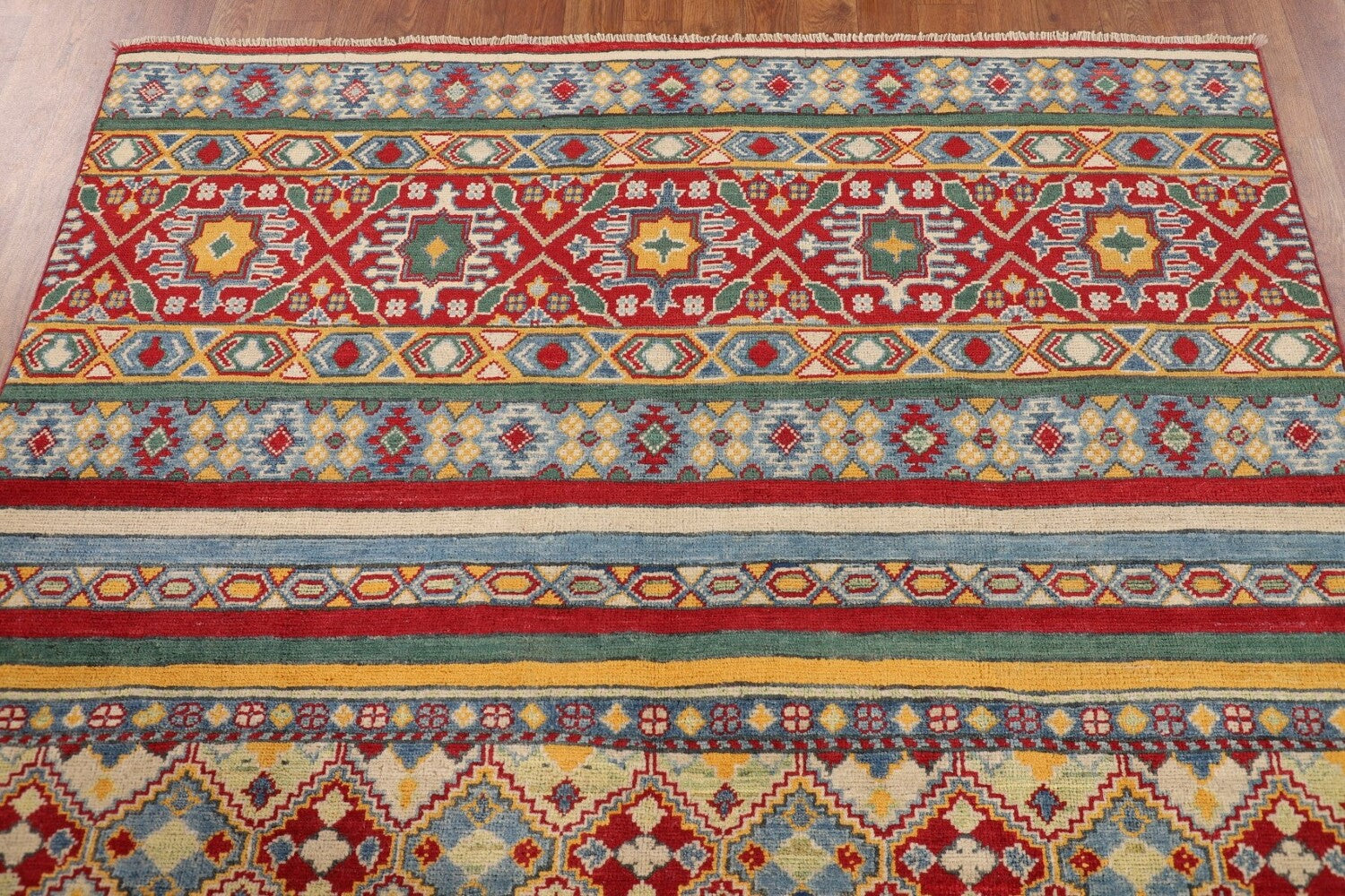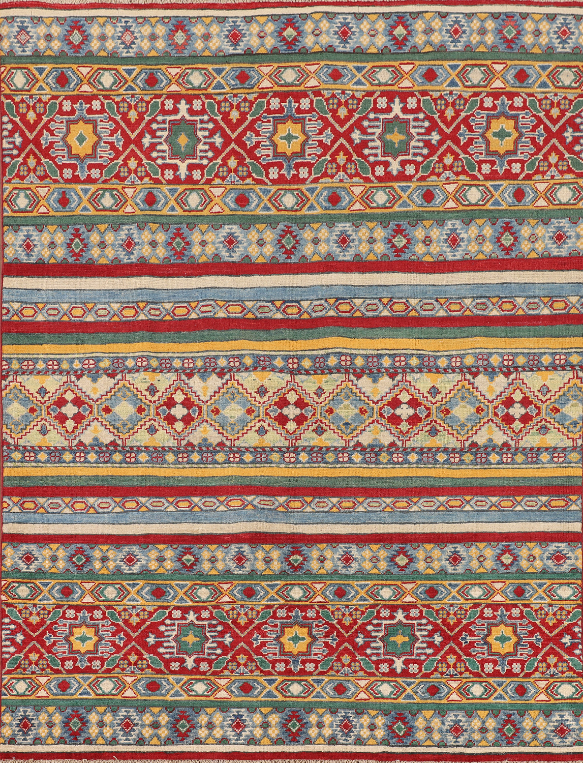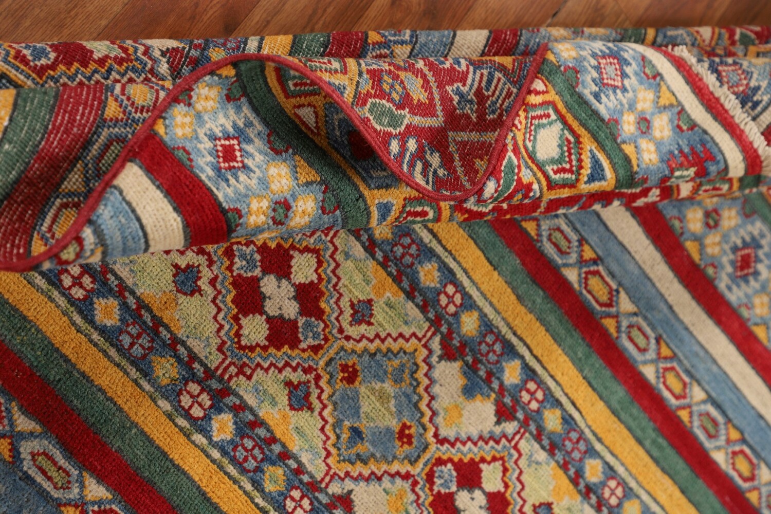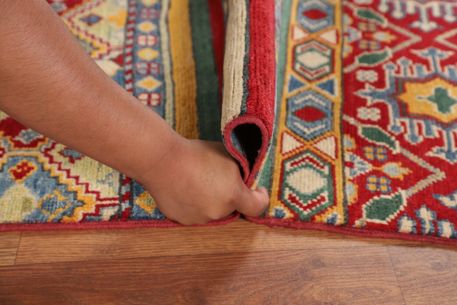 A Beautiful Genuine Pakistan Kazak rug is Hand Knotted by skillful weavers in Pakistan with 100% Wool Material. This rug is in New, First Quality condition. dimensions are 6' 6'' X 5' 1'' in foot and 198 X 155 in centimeter. the primary color is Multi-Colored.