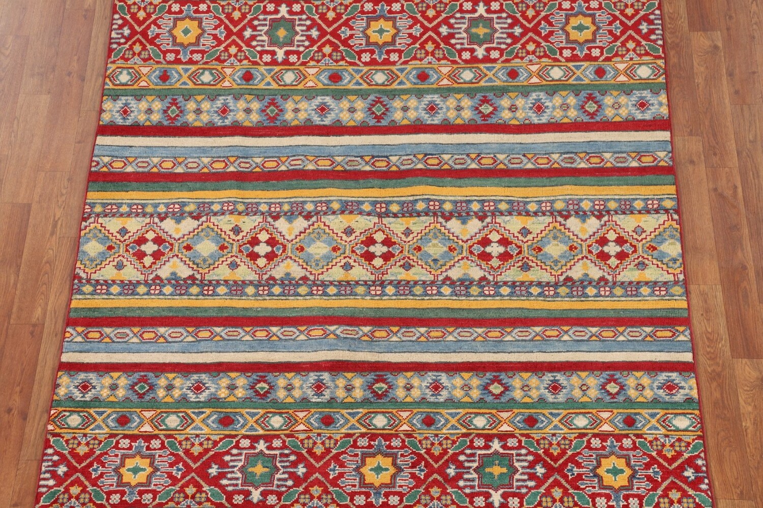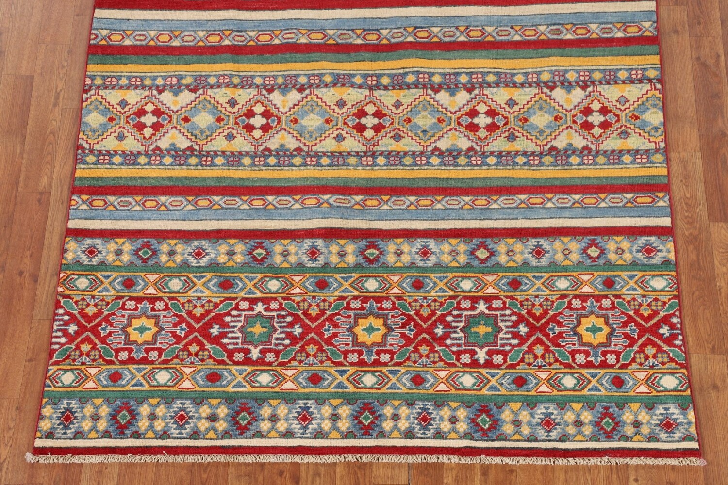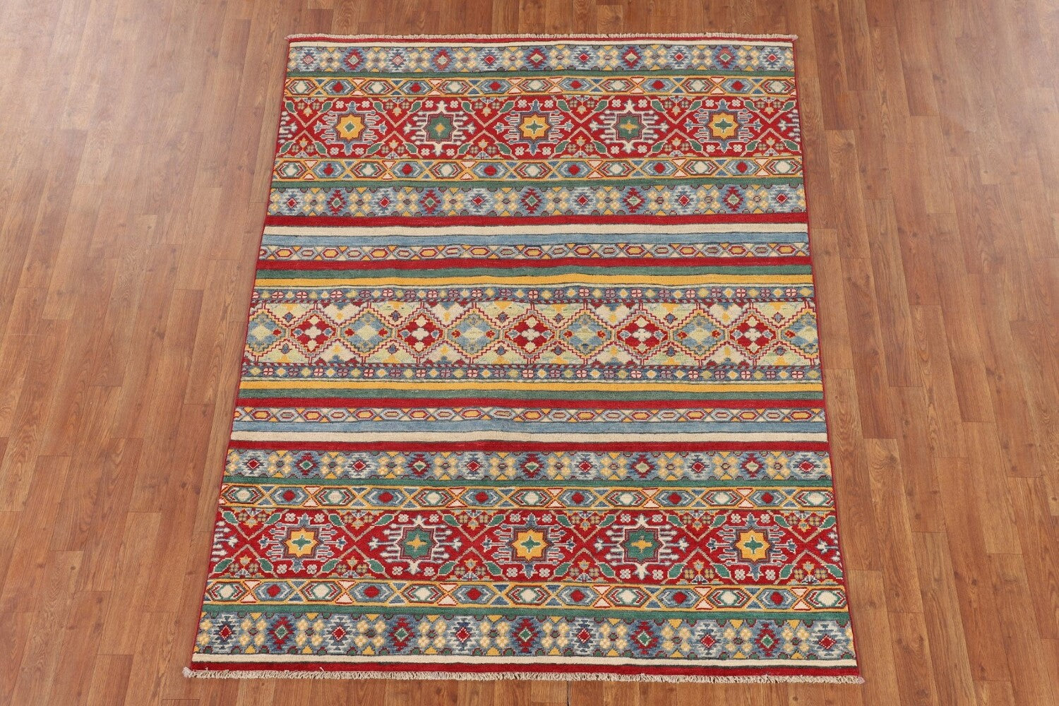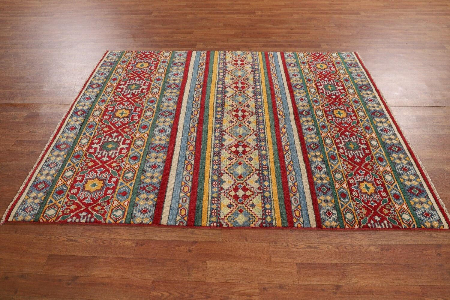 A Beautiful Genuine Pakistan Kazak rug is Hand Knotted by skillful weavers in Pakistan with 100% Wool Material. This rug is in New, First Quality condition. dimensions are 6' 6'' X 5' 1'' in foot and 198 X 155 in centimeter. the primary color is Multi-Colored.