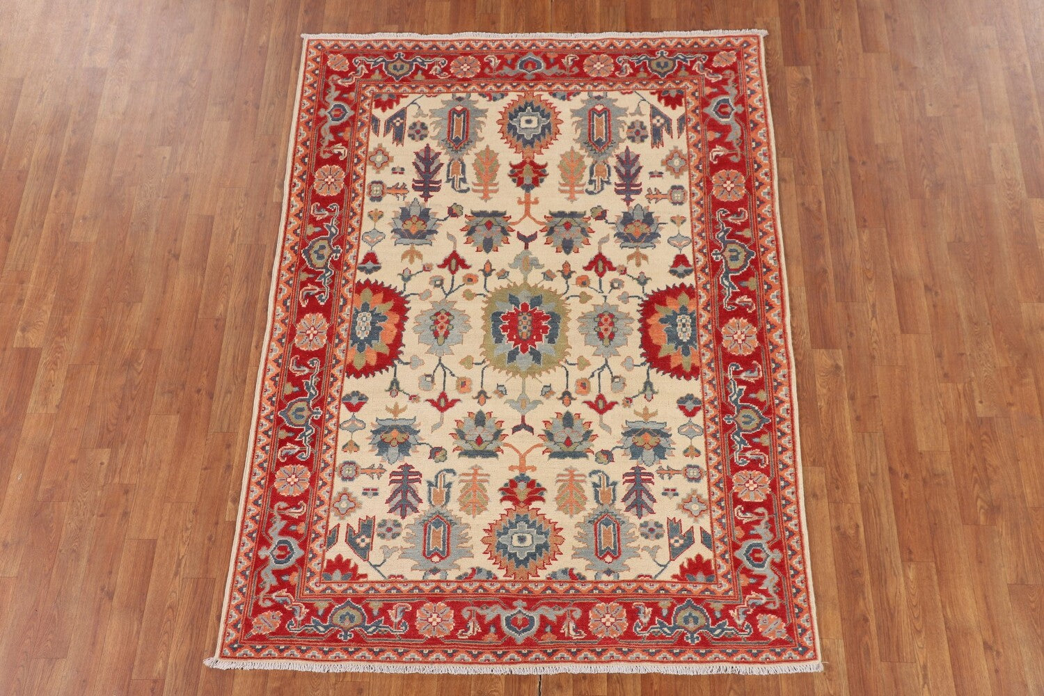A Beautiful Genuine Pakistan Kazak rug is Hand Knotted by skillful weavers in Pakistan with 100% Wool Material. This rug is in New, First Quality condition. dimensions are 6' 7'' X 4' 11'' in foot and 201 X 150 in centimeter. the primary color is Beige & Ivories.