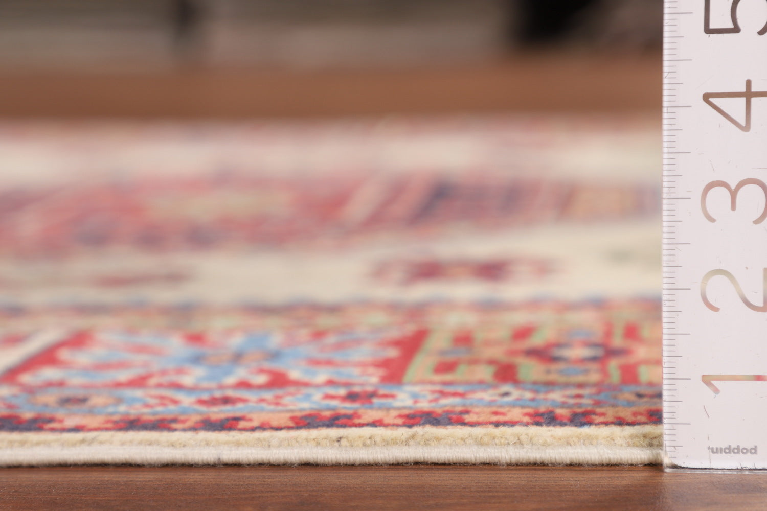 A Beautiful Genuine Pakistan Kazak rug is Hand Knotted by skillful weavers in Pakistan with 100% Wool Material. This rug is in New, First Quality condition. dimensions are 6' 7'' X 4' 11'' in foot and 201 X 150 in centimeter. the primary color is Beige & Ivories.