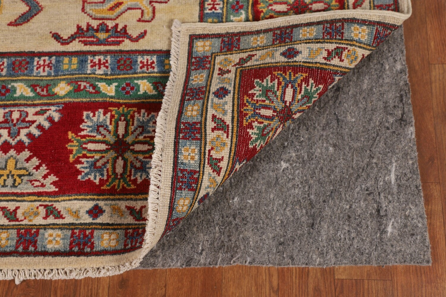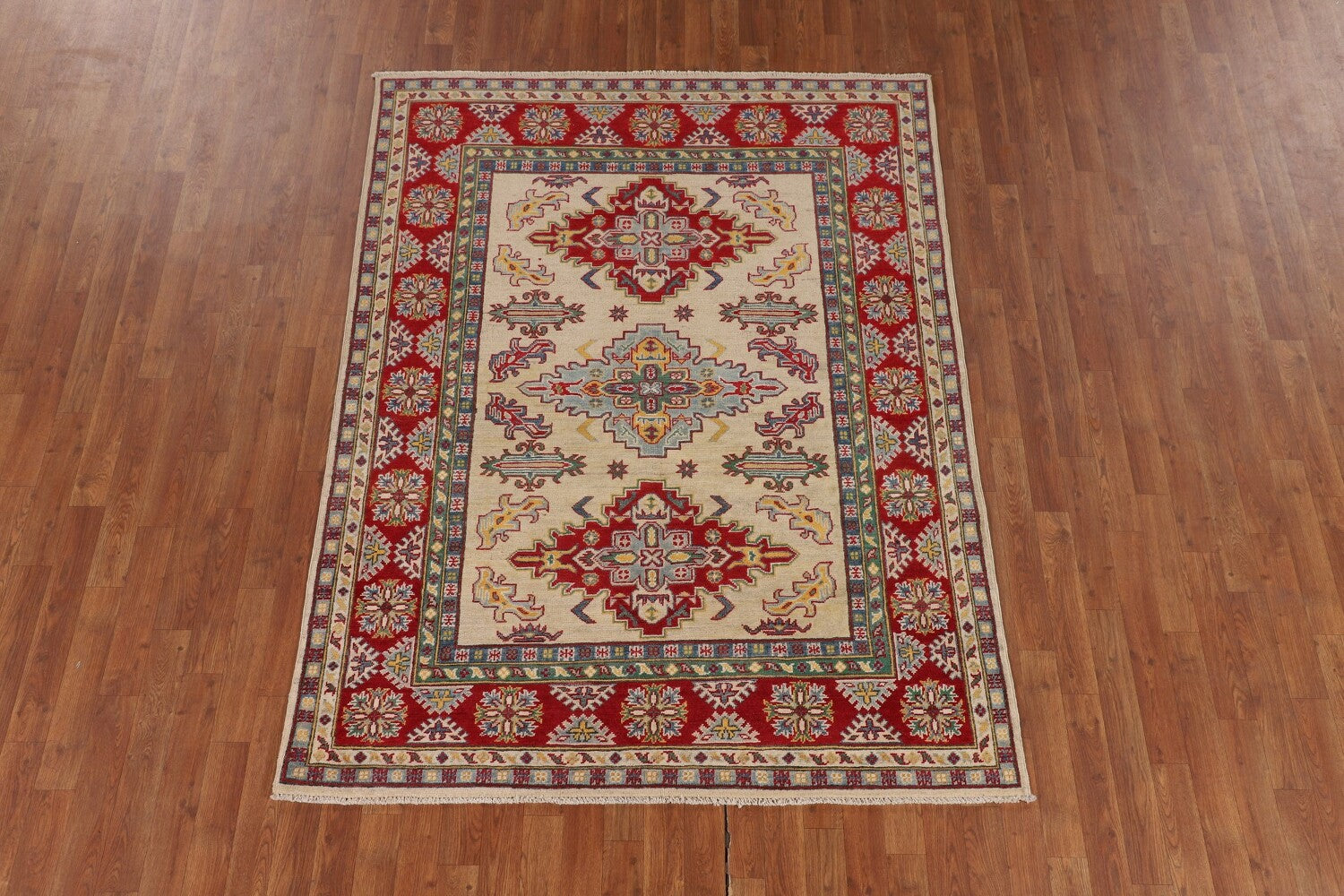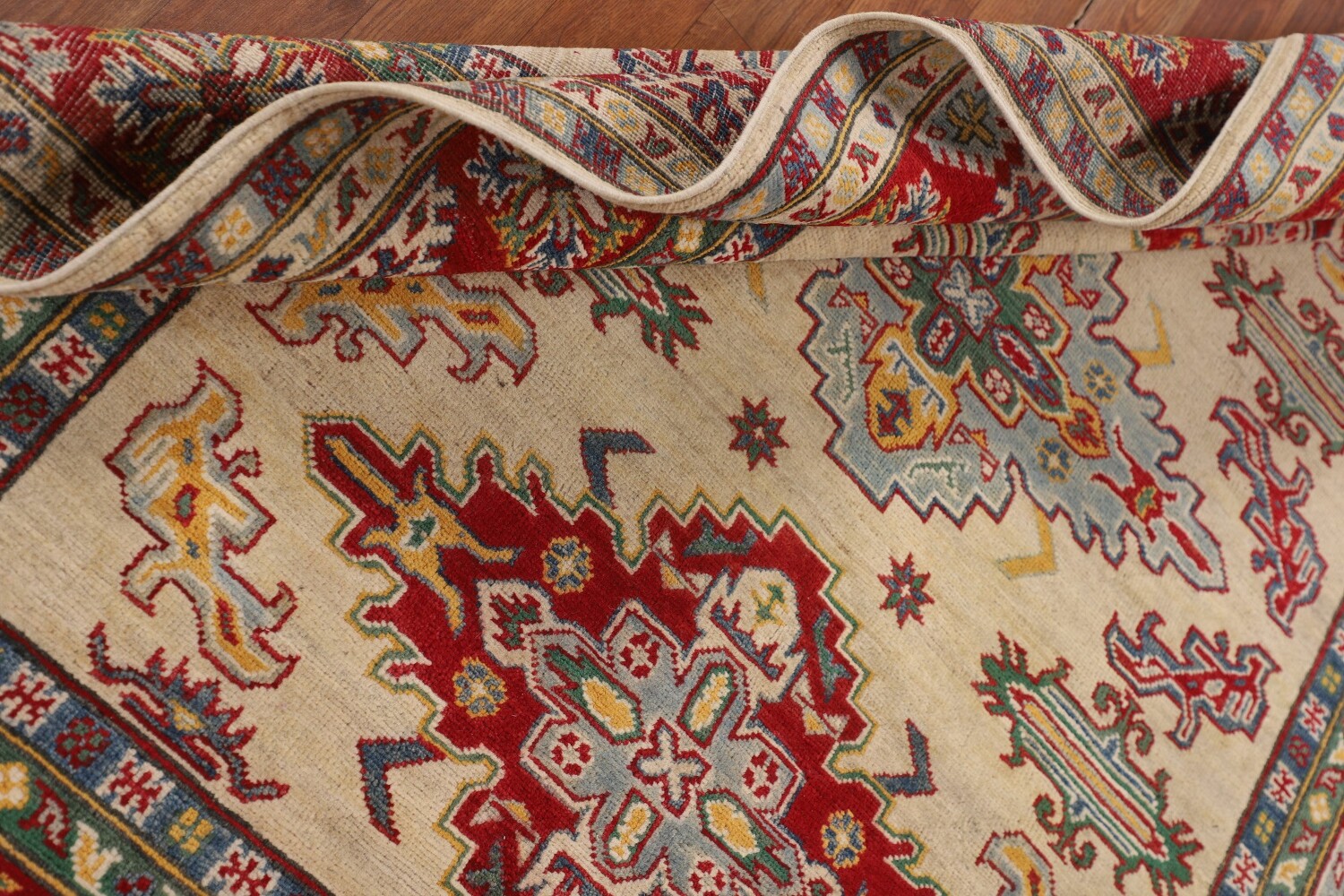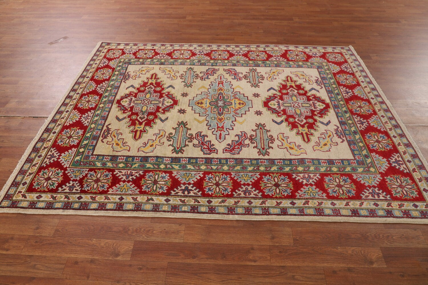 A Beautiful Genuine Pakistan Kazak rug is Hand Knotted by skillful weavers in Pakistan with 100% Wool Material. This rug is in New, First Quality condition. dimensions are 6' 10'' X 5' 2'' in foot and 208 X 157 in centimeter. the primary color is Beige & Ivories.