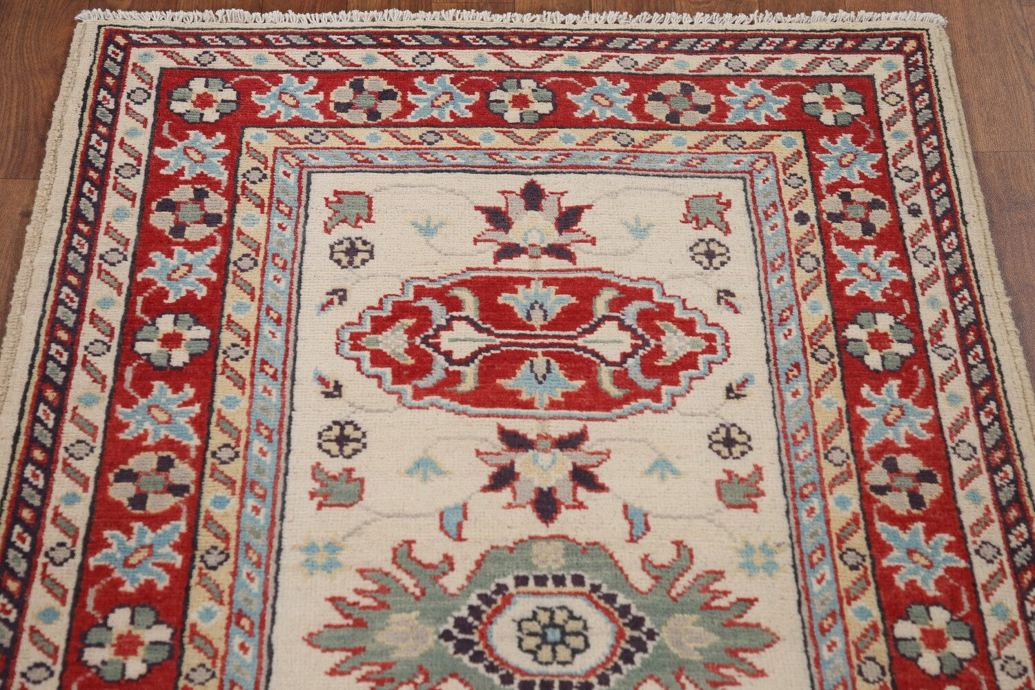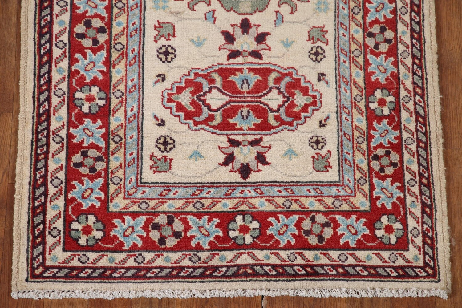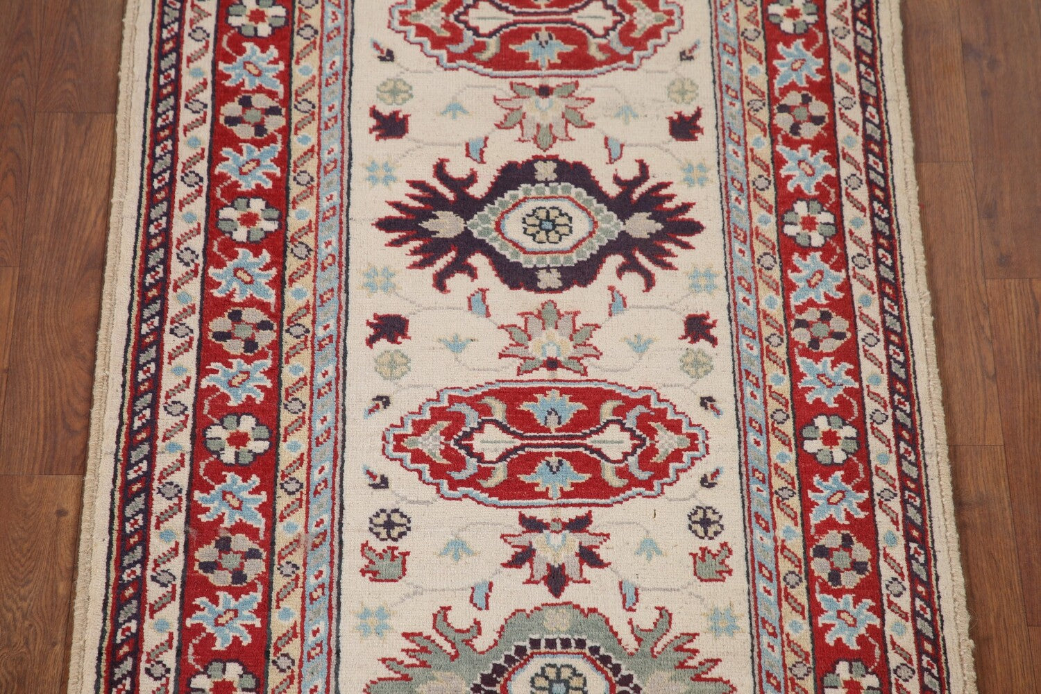 A Beautiful Genuine Pakistan Kazak rug is Hand Knotted by skillful weavers in Pakistan with 100% Wool Material. This rug is in New, First Quality condition. dimensions are 9' 10'' X 2' 9'' in foot and 300 X 84 in centimeter. the primary color is Beige & Ivories.