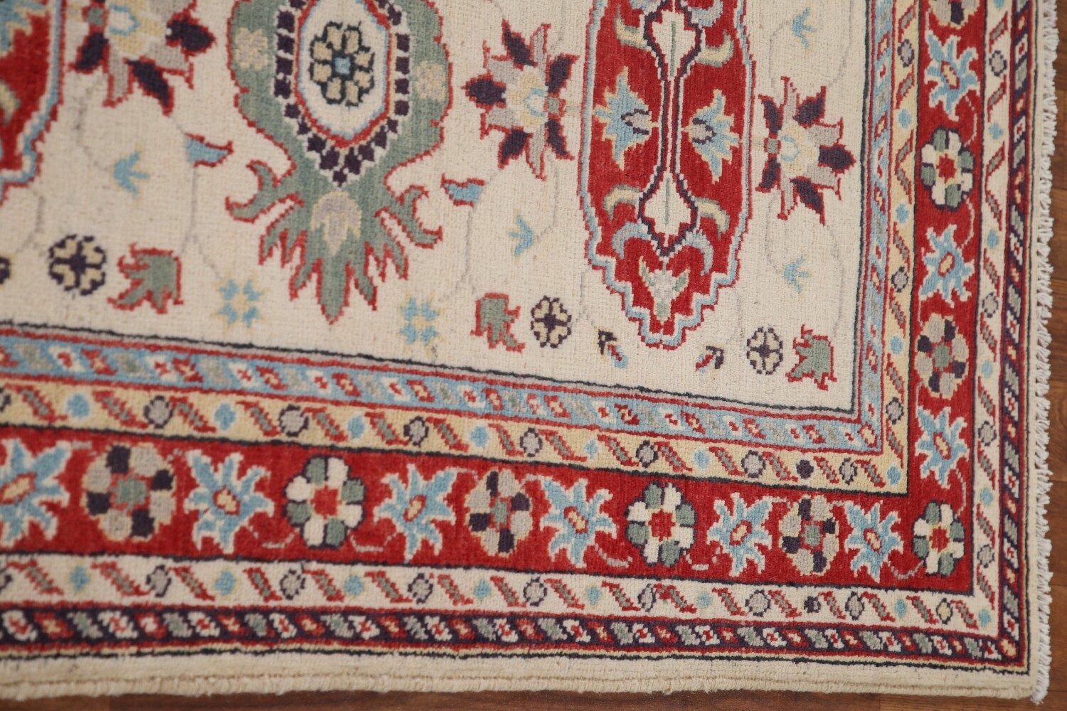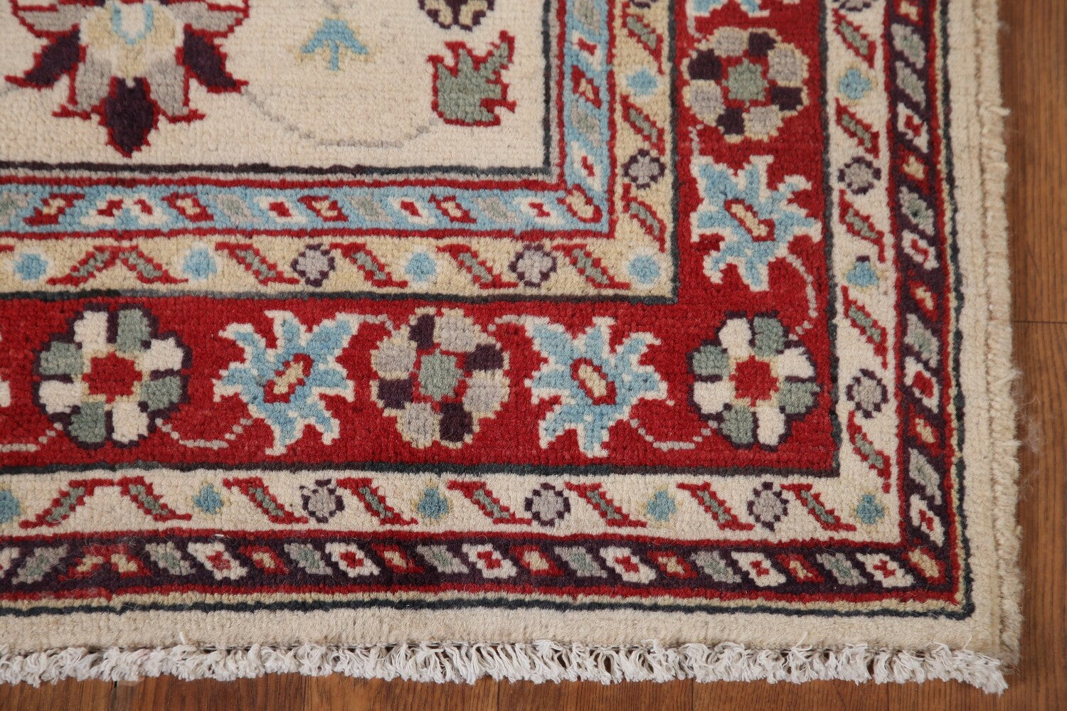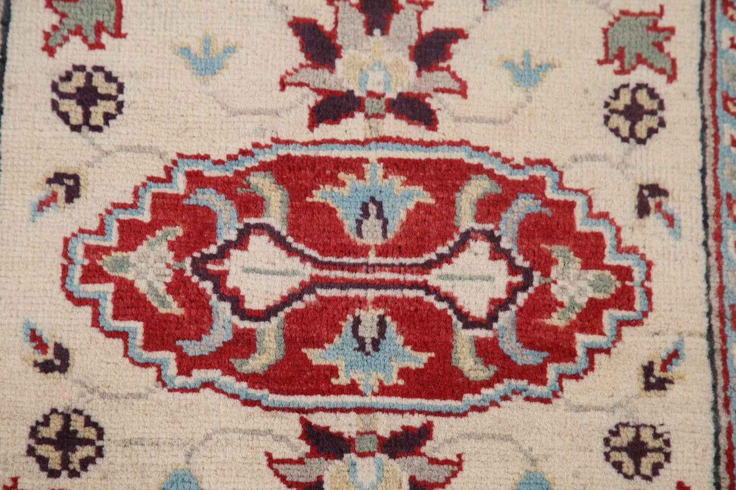 A Beautiful Genuine Pakistan Kazak rug is Hand Knotted by skillful weavers in Pakistan with 100% Wool Material. This rug is in New, First Quality condition. dimensions are 9' 10'' X 2' 9'' in foot and 300 X 84 in centimeter. the primary color is Beige & Ivories.