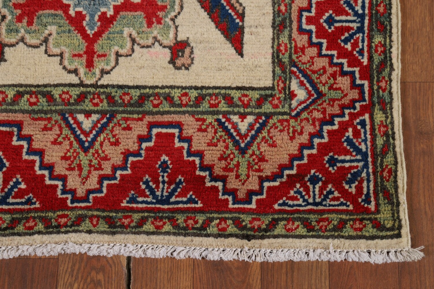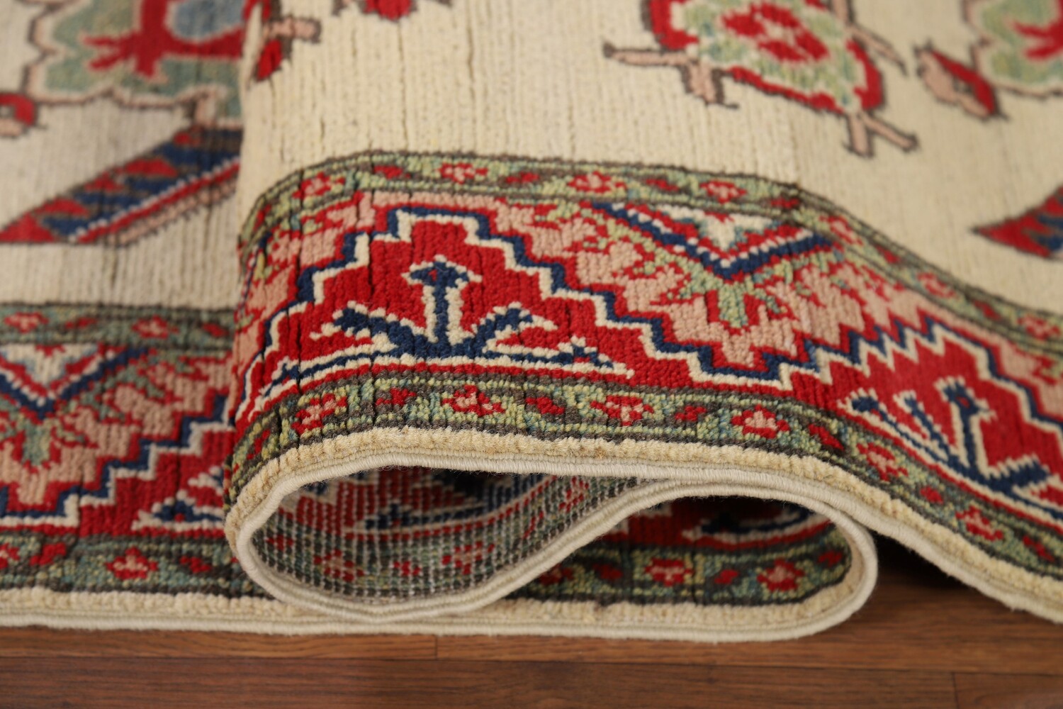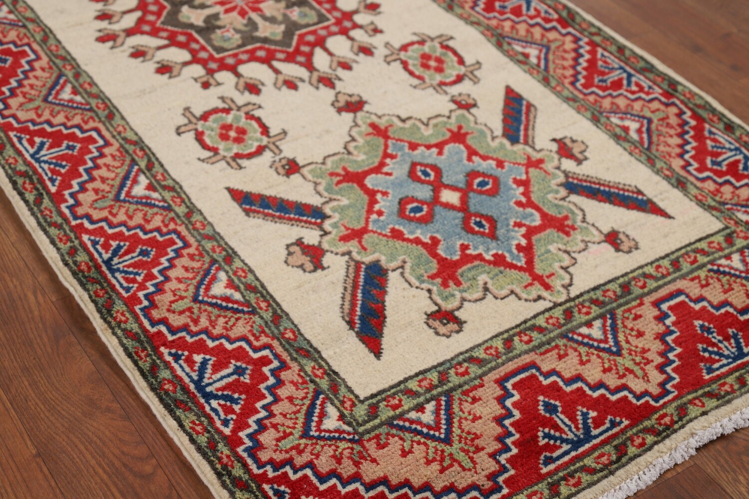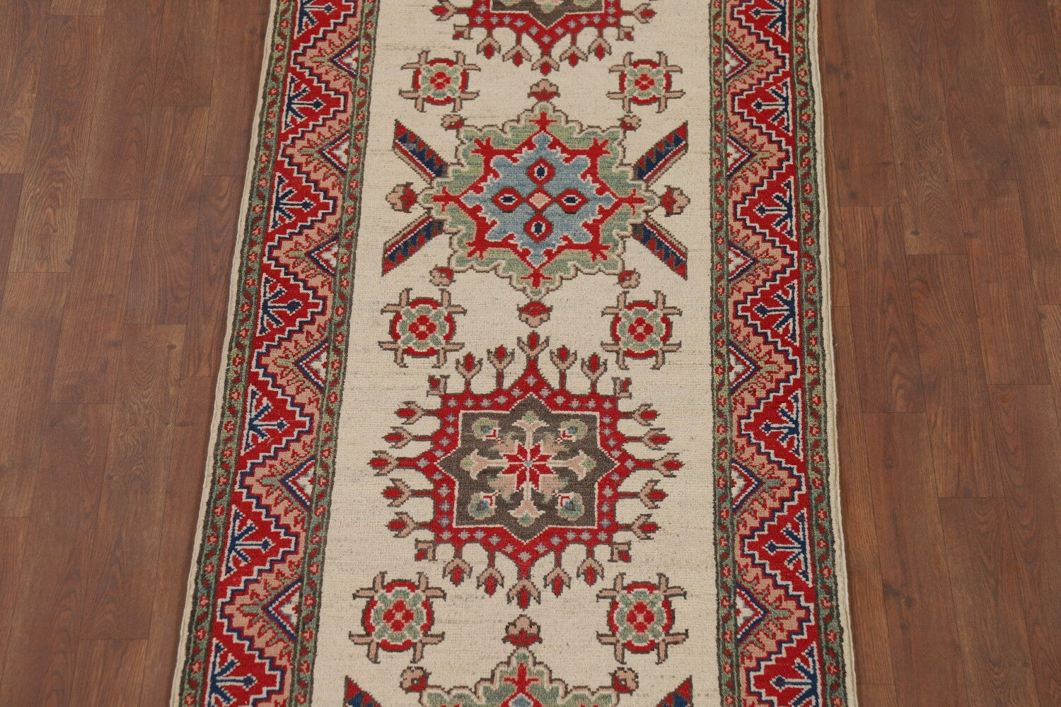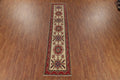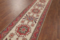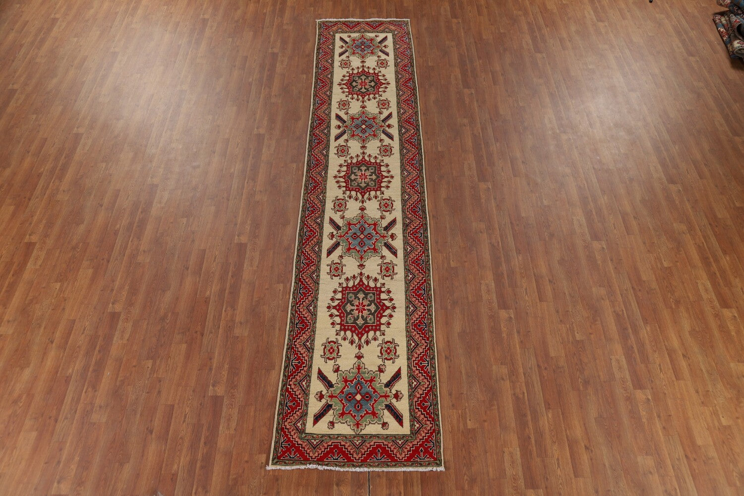 A Beautiful Genuine Pakistan Kazak rug is Hand Knotted by skillful weavers in Pakistan with 100% Wool Material. This rug is in New, First Quality condition. dimensions are 12' 8'' X 2' 9'' in foot and 386 X 84 in centimeter. the primary color is Beige & Ivories.