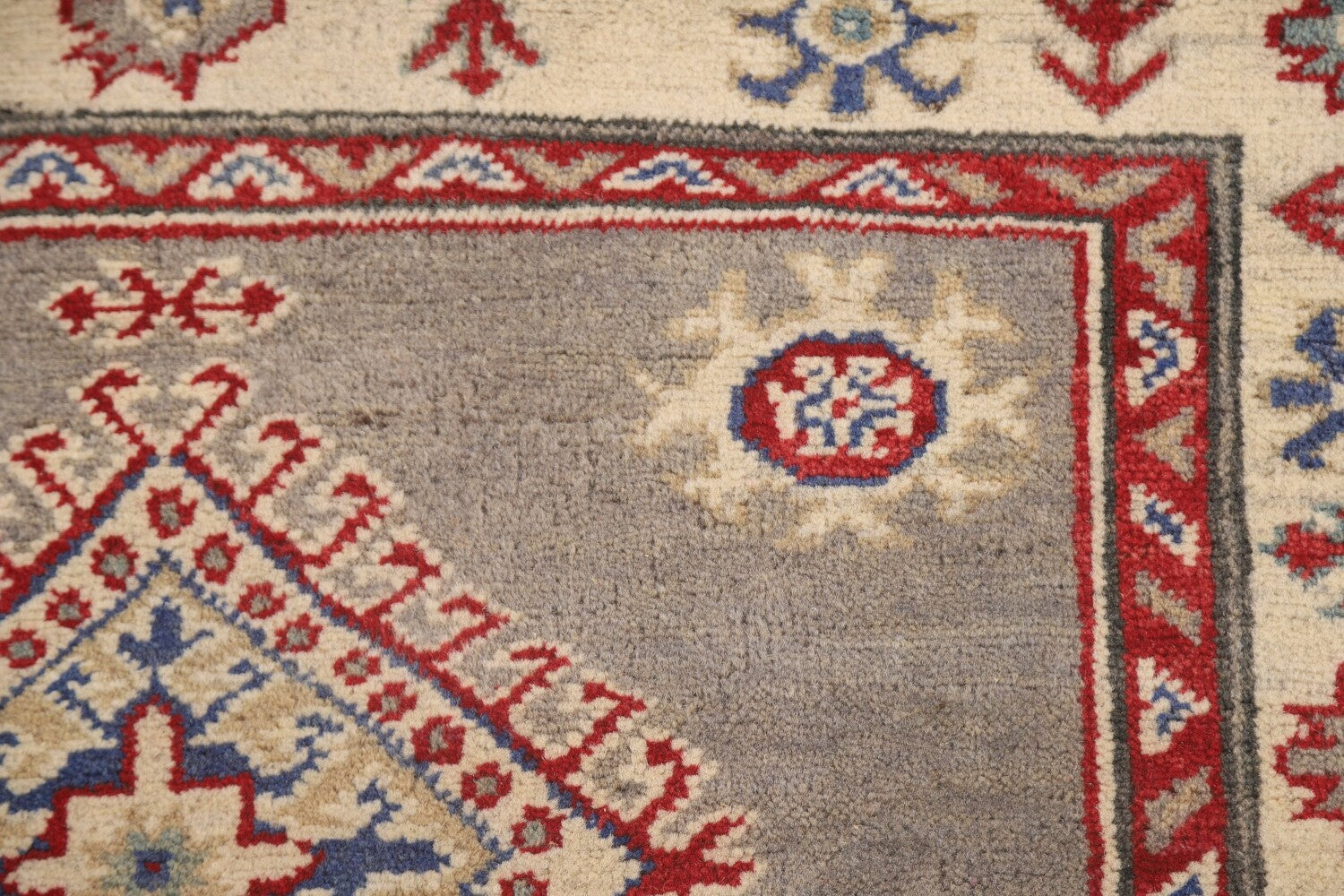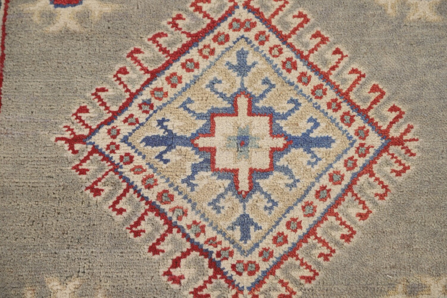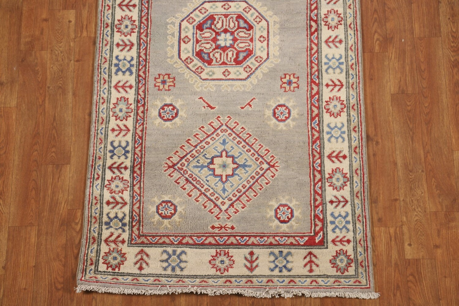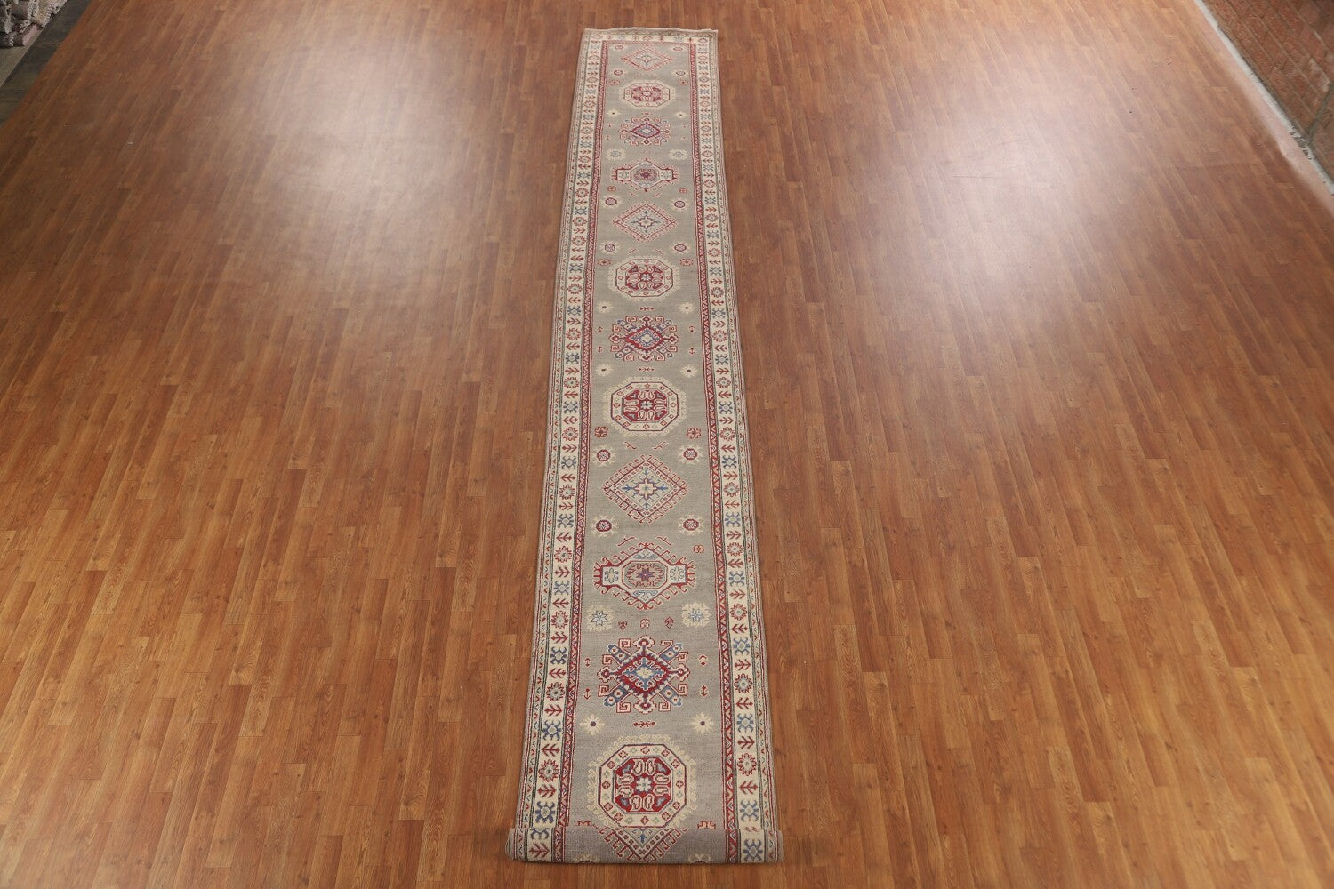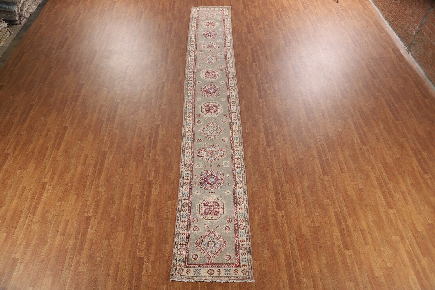A Beautiful Genuine Pakistan Kazak rug is Hand Knotted by skillful weavers in Pakistan with 100% Wool Material. This rug is in New, First Quality condition. dimensions are 19' 3'' X 2' 9'' in foot and 587 X 84 in centimeter. the primary color is Greys & Charcoal.