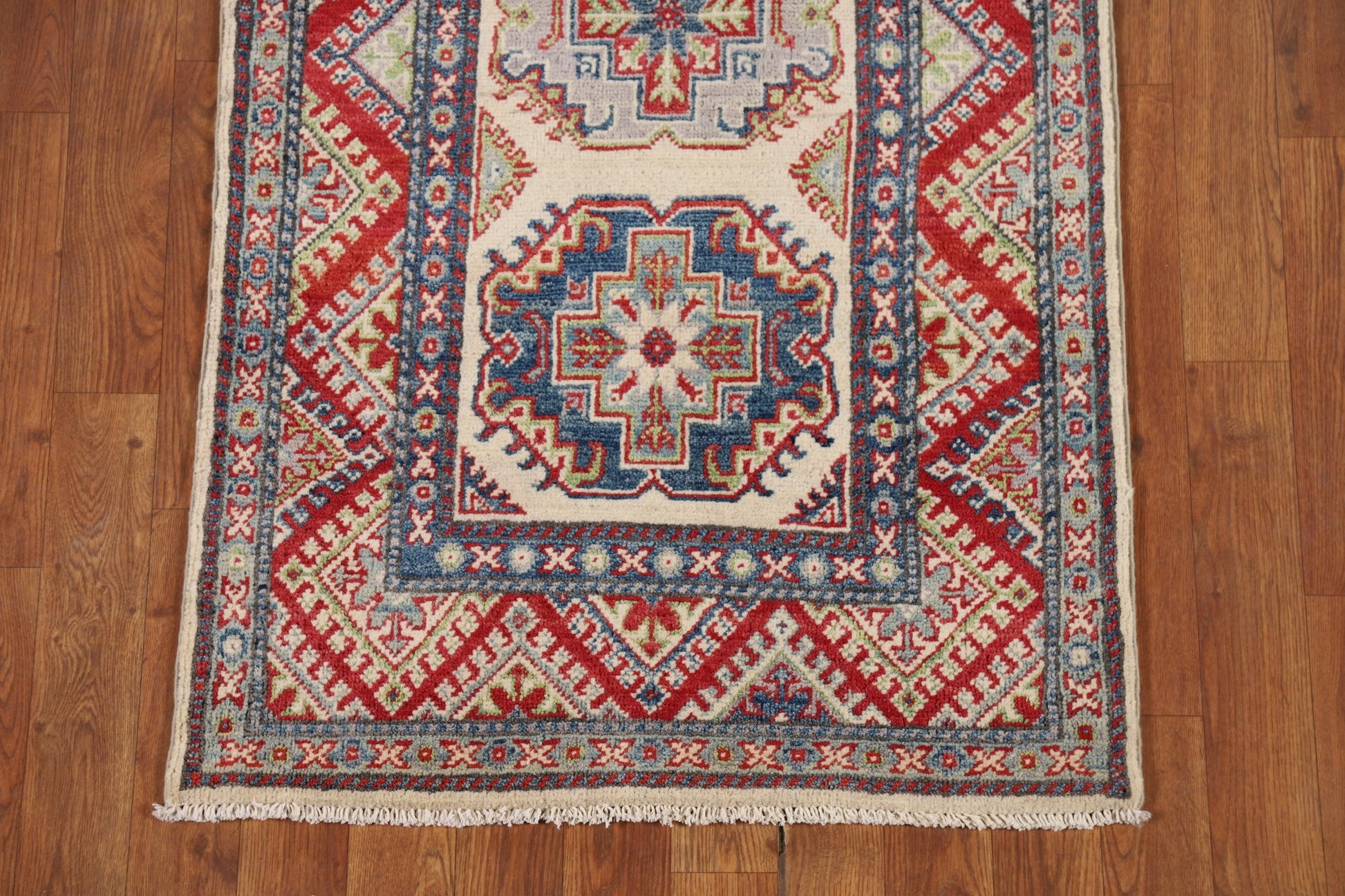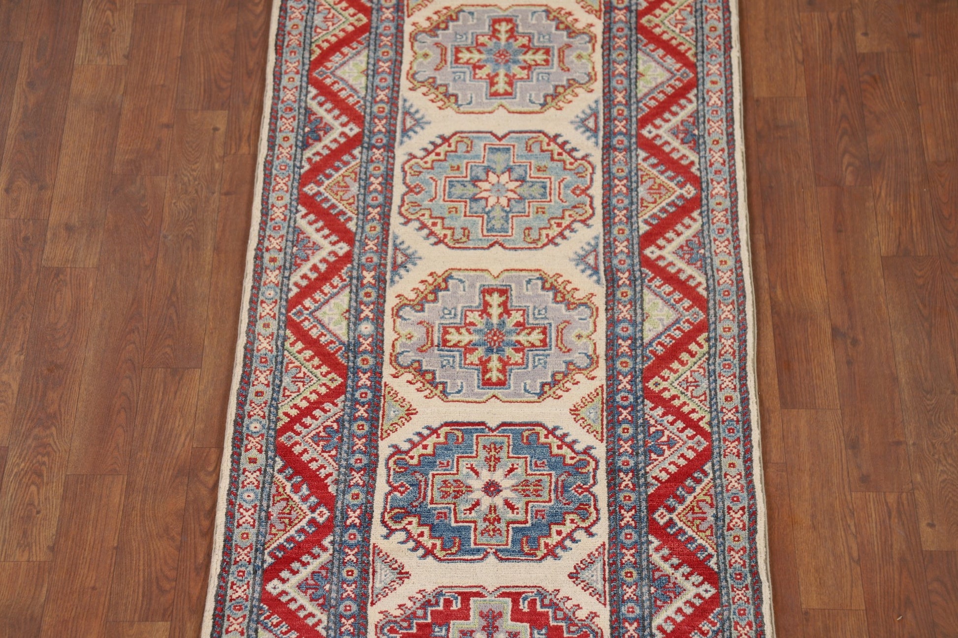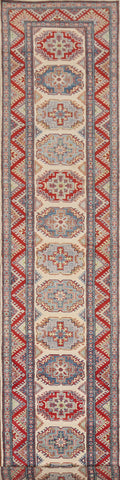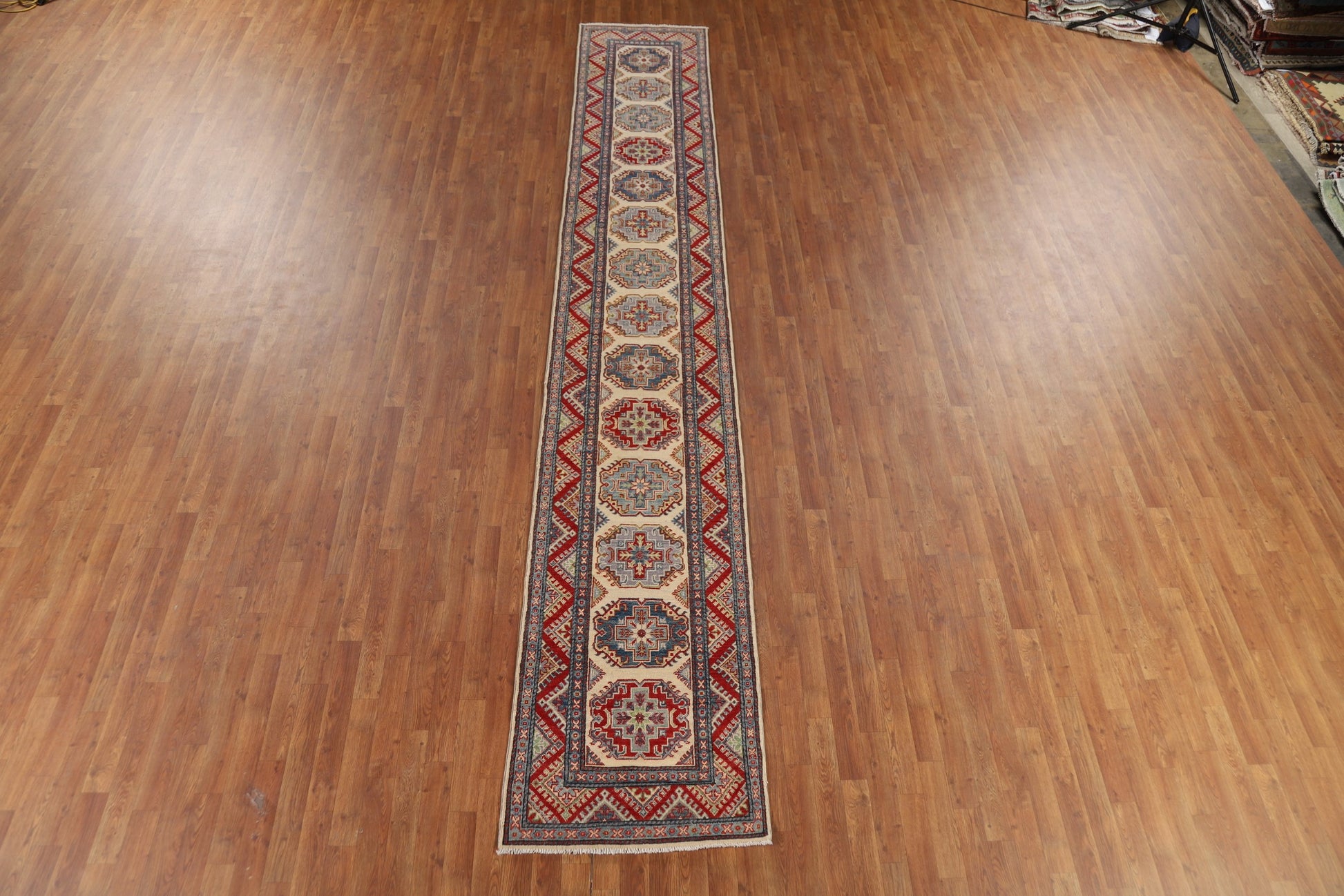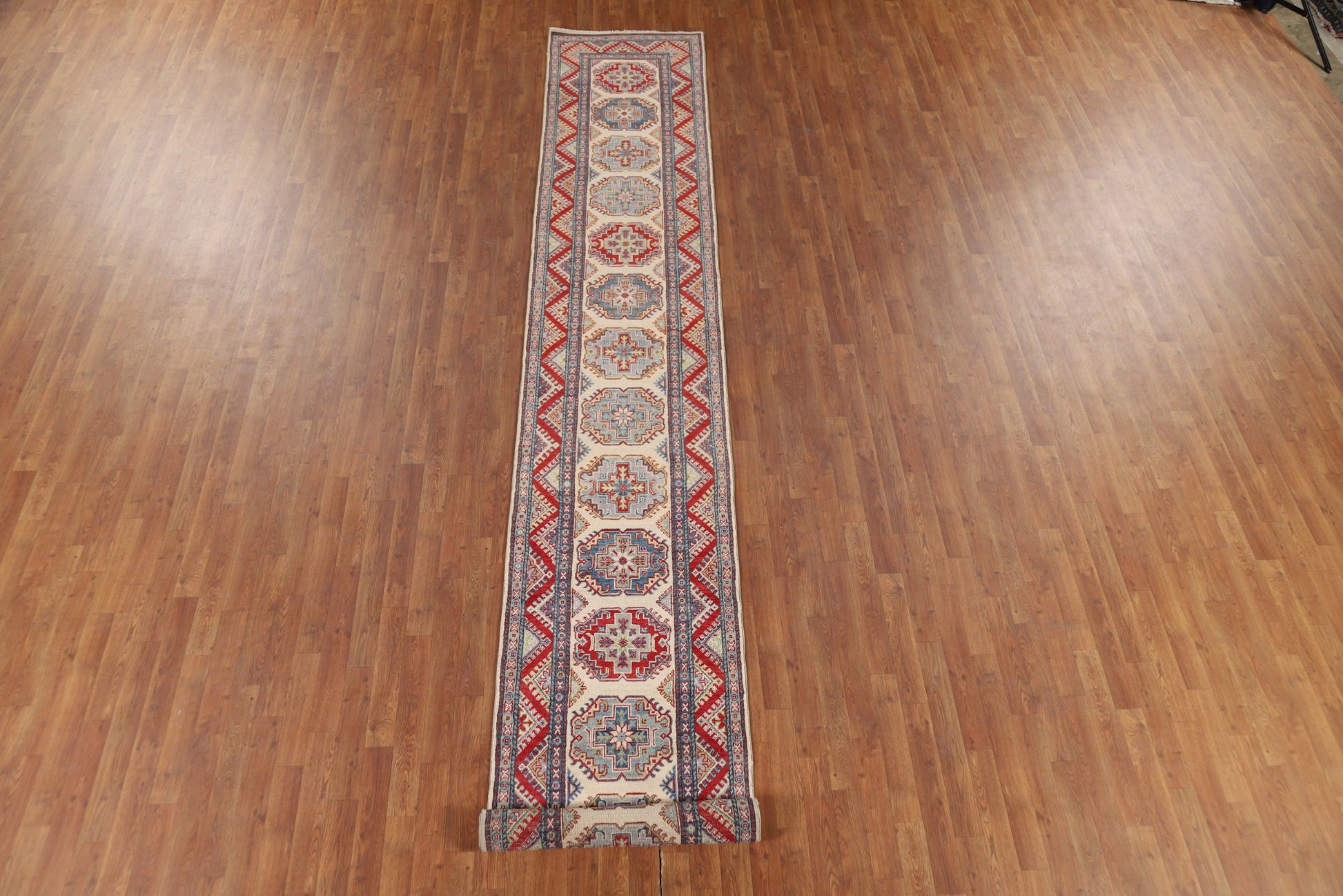 A Beautiful Genuine Pakistan Kazak rug is Hand Knotted by skillful weavers in Pakistan with 100% Wool Material. This rug is in New, First Quality condition. dimensions are 15' 2'' X 2' 5'' in foot and 462 X 74 in centimeter. the primary color is Beige & Ivories.