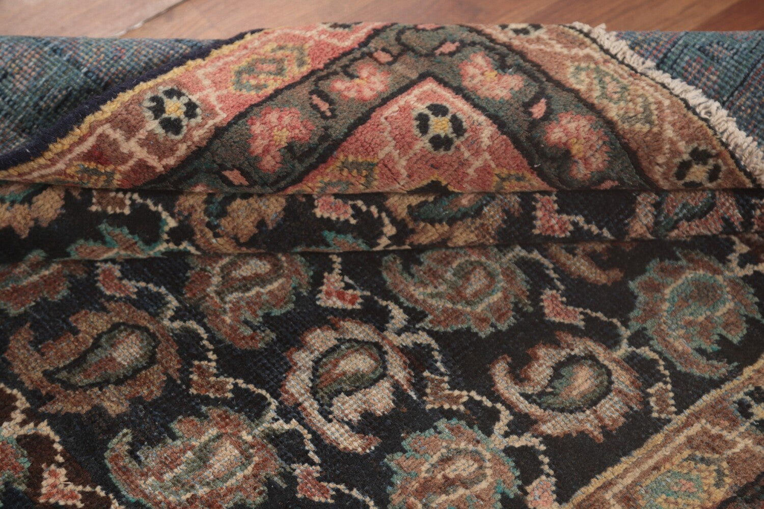 A Beautiful Genuine Persia ( Persia ) Mahal rug is Hand Knotted by skillful weavers in Persia ( Persia ) with 100% Wool Material. This rug is in Very Good (Evenly Low Pile) condition. dimensions are 10' 4'' X 3' 7'' in foot and 315 X 109 in centimeter. the primary color is Navy Blue & Blues.
