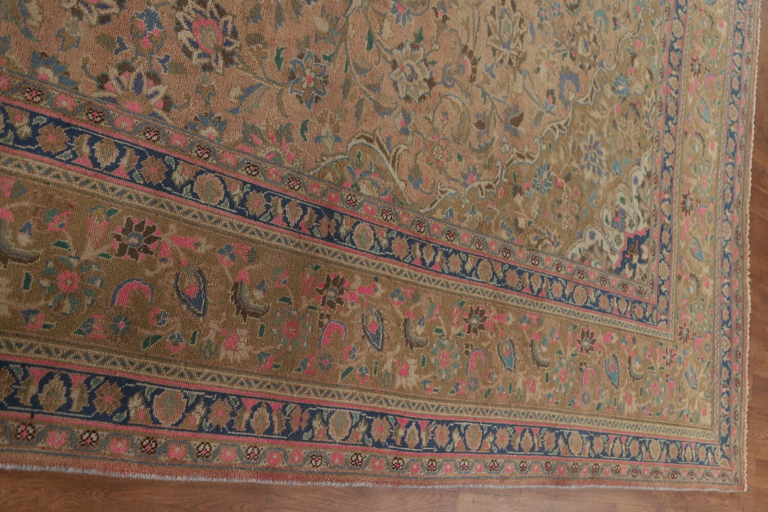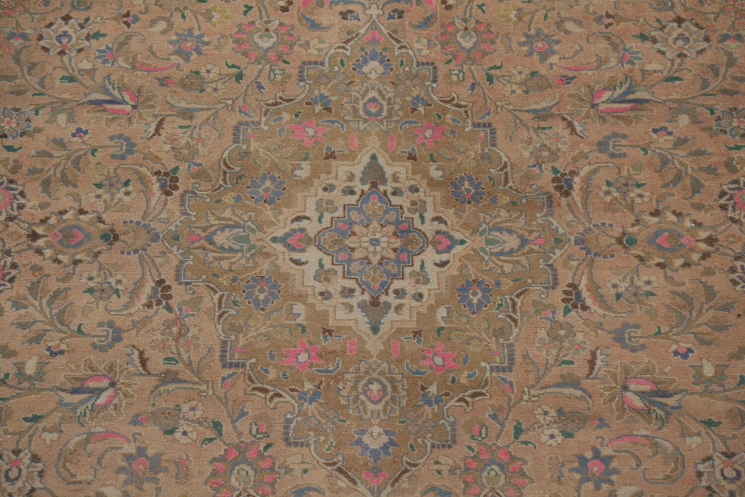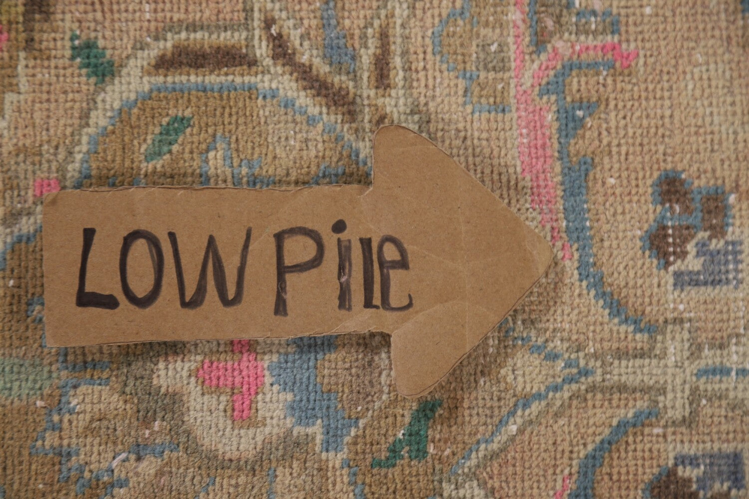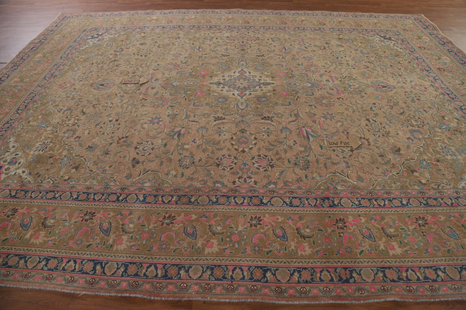 A Beautiful Genuine Persia ( Persia ) Mashad rug is Hand Knotted by skillful weavers in Persia ( Persia ) with 100% Wool Material. This rug is in Very Good (Low Pile) condition. dimensions are 12' 6'' X 9' 8'' in foot and 381 X 295 in centimeter. the primary color is Beige & Ivories.