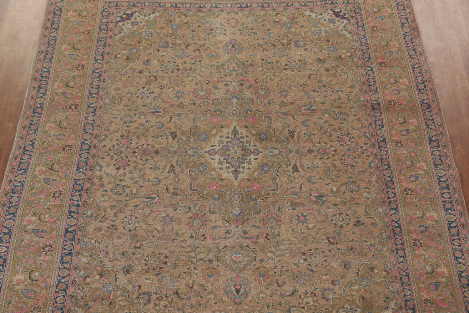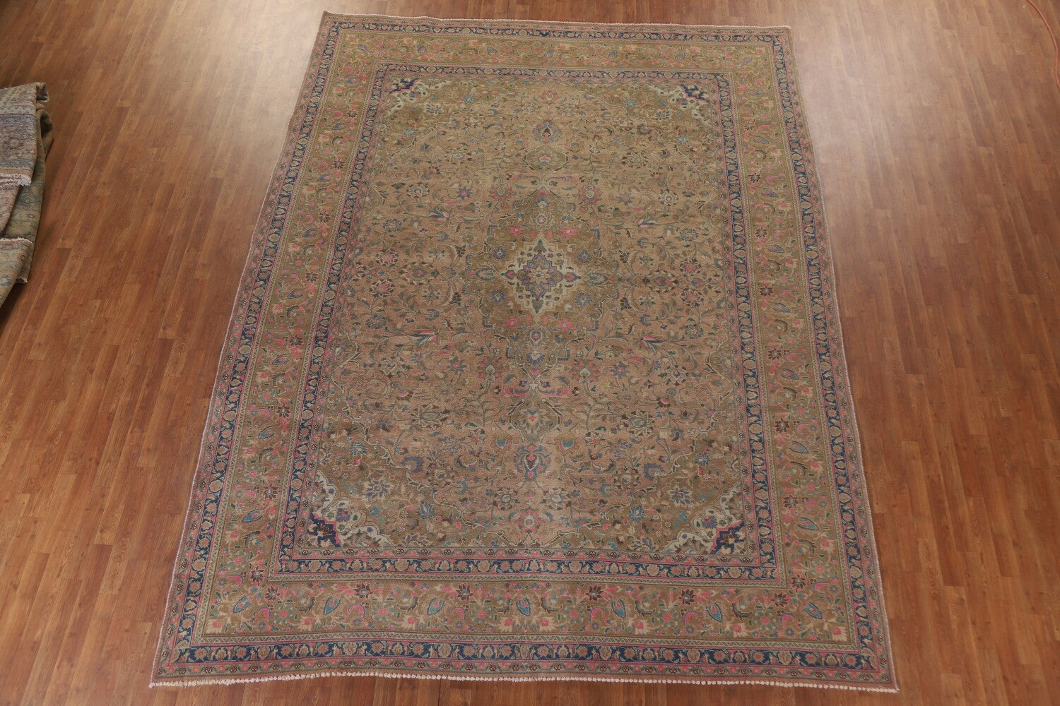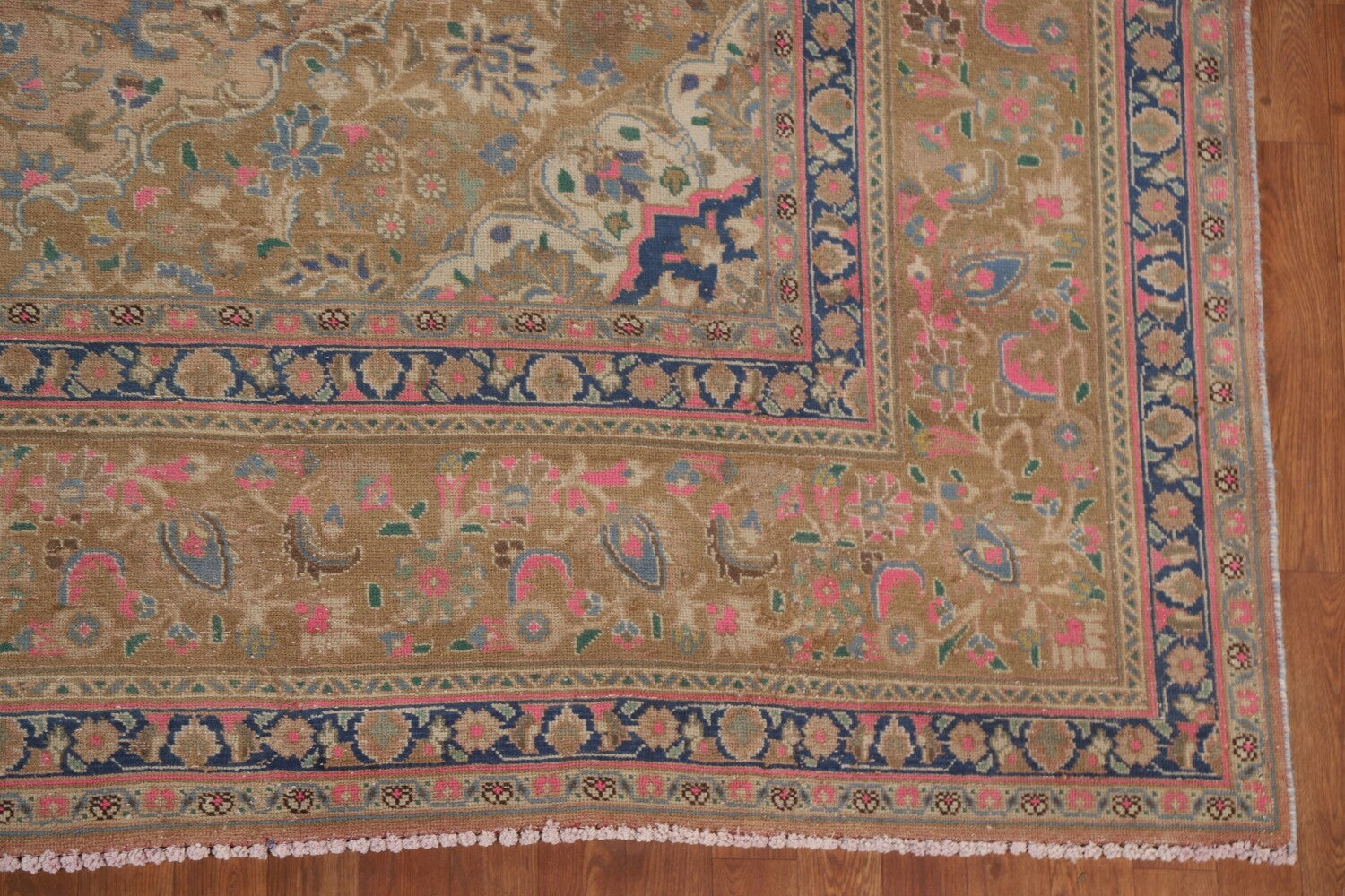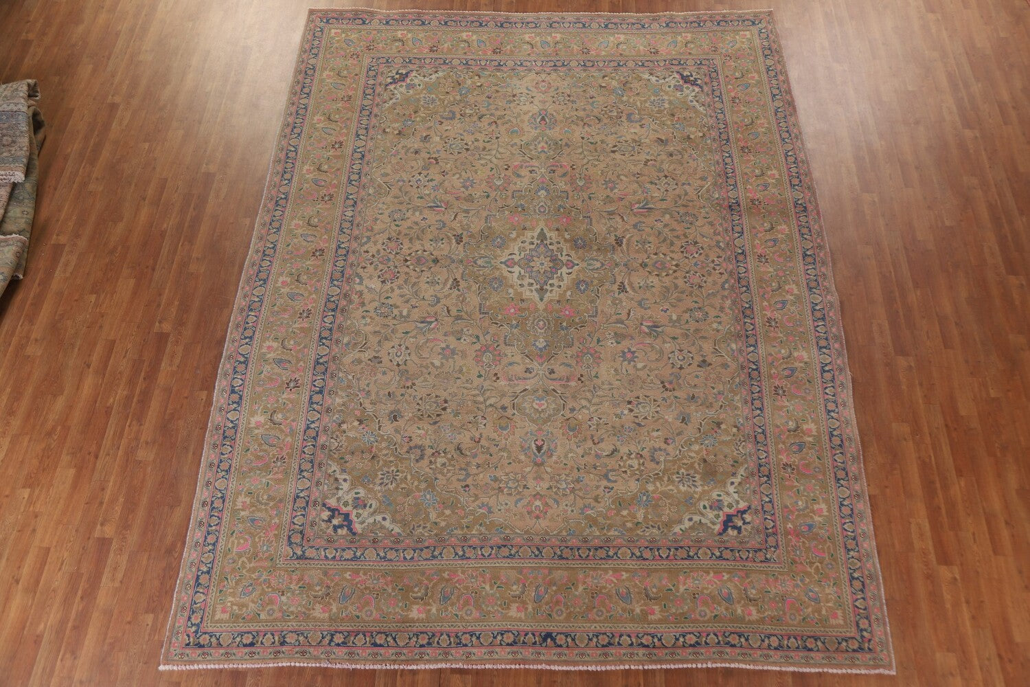 A Beautiful Genuine Persia ( Persia ) Mashad rug is Hand Knotted by skillful weavers in Persia ( Persia ) with 100% Wool Material. This rug is in Very Good (Low Pile) condition. dimensions are 12' 6'' X 9' 8'' in foot and 381 X 295 in centimeter. the primary color is Beige & Ivories.