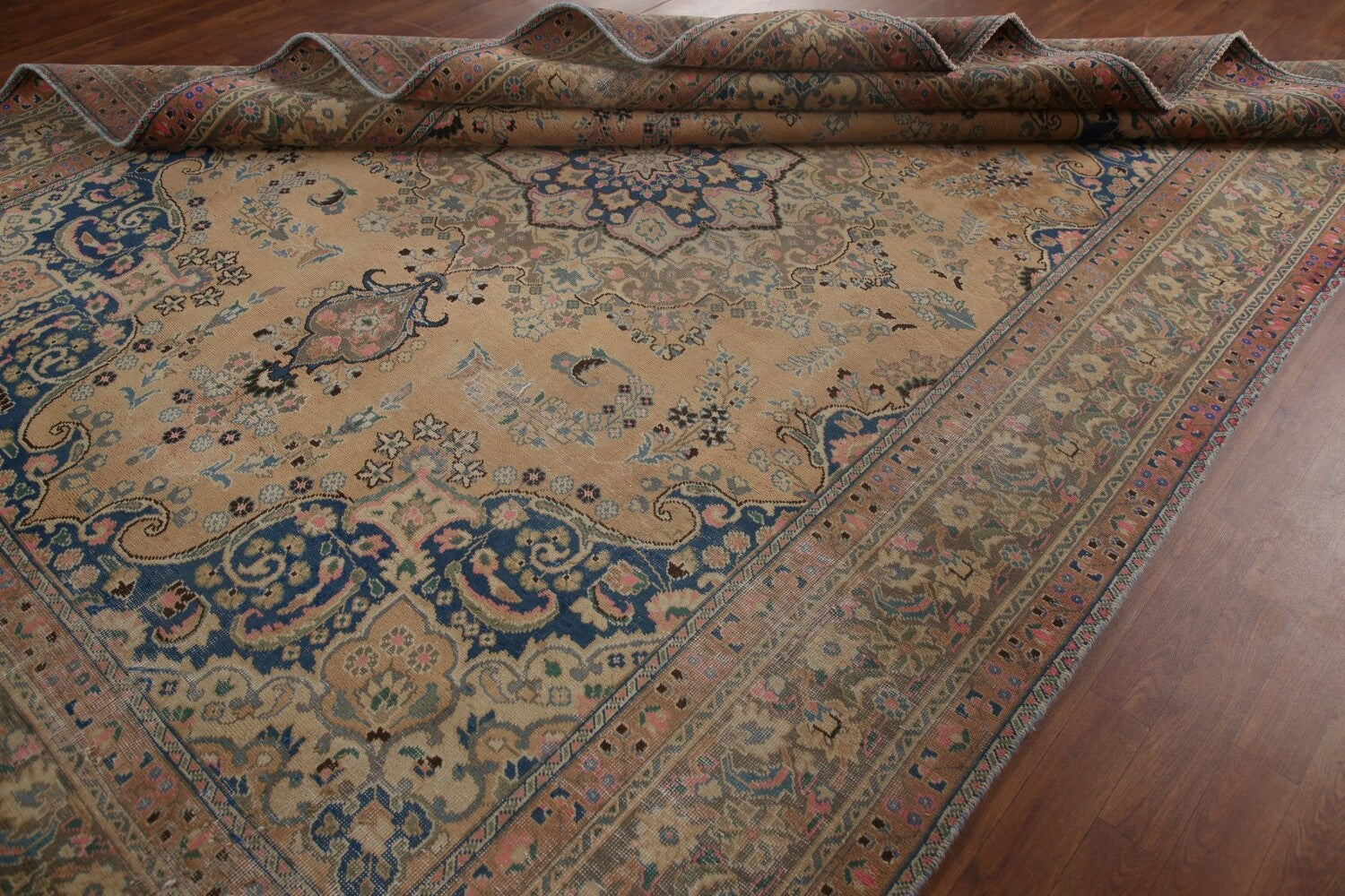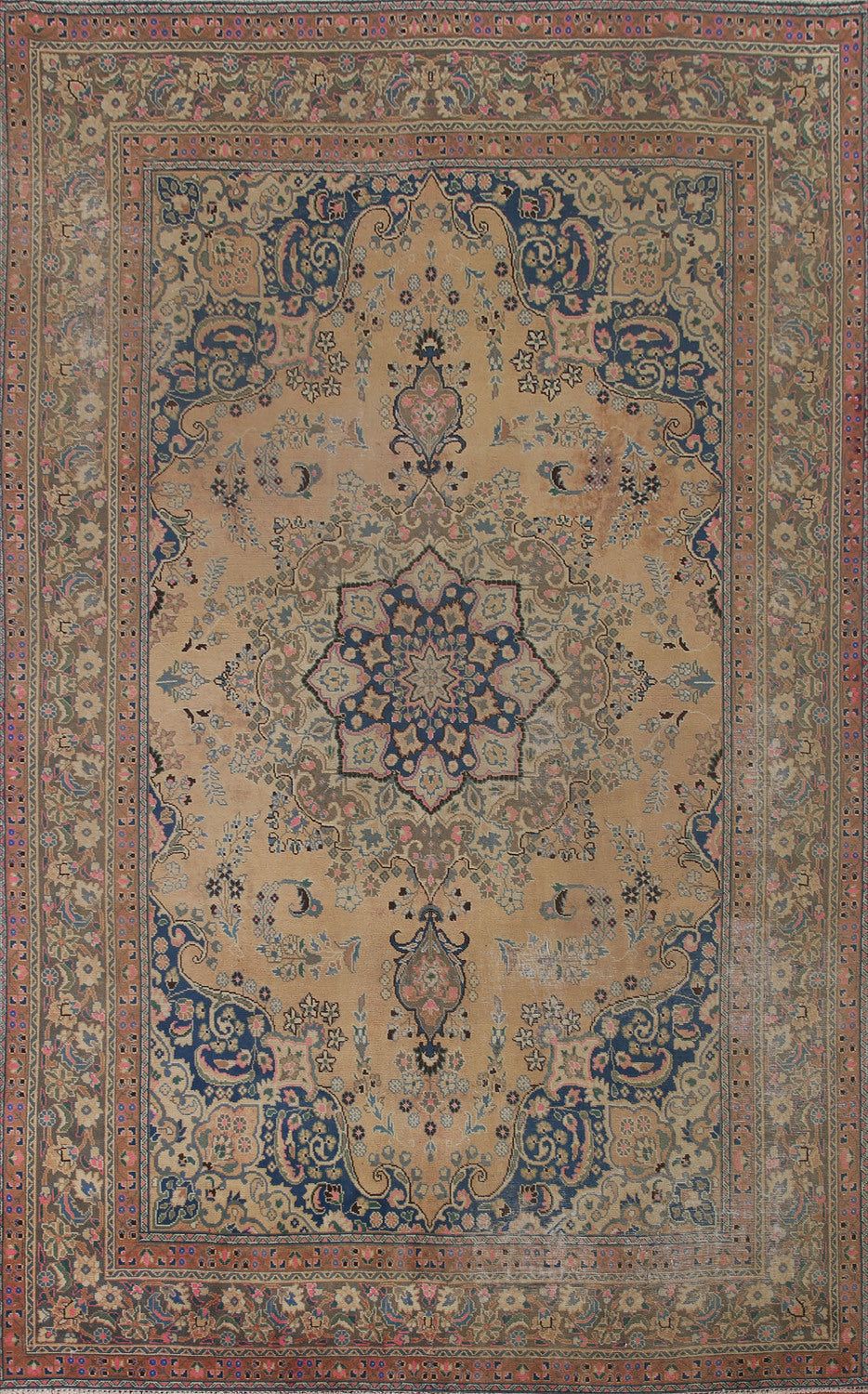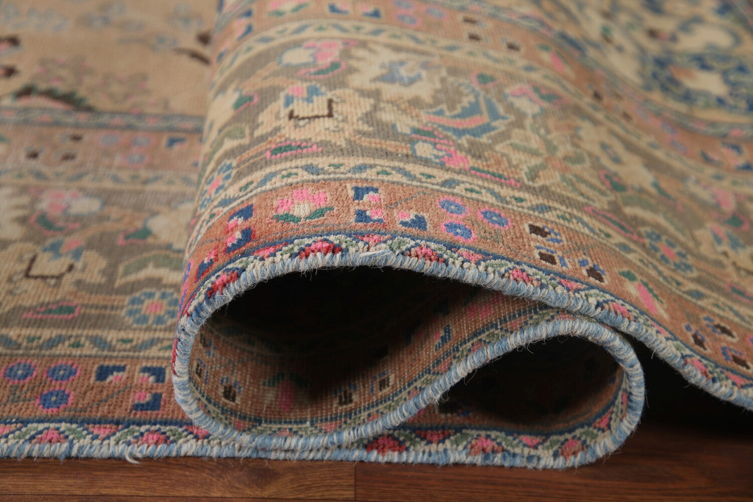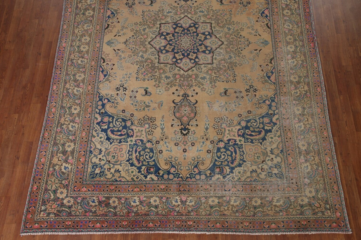 A Beautiful Genuine Persia ( Persia ) Mashad rug is Hand Knotted by skillful weavers in Persia ( Persia ) with 100% Wool Material. This rug is in Very Good (Evenly Low Pile) condition. dimensions are 11' 1'' X 7' 11'' in foot and 338 X 241 in centimeter. the primary color is Peach.