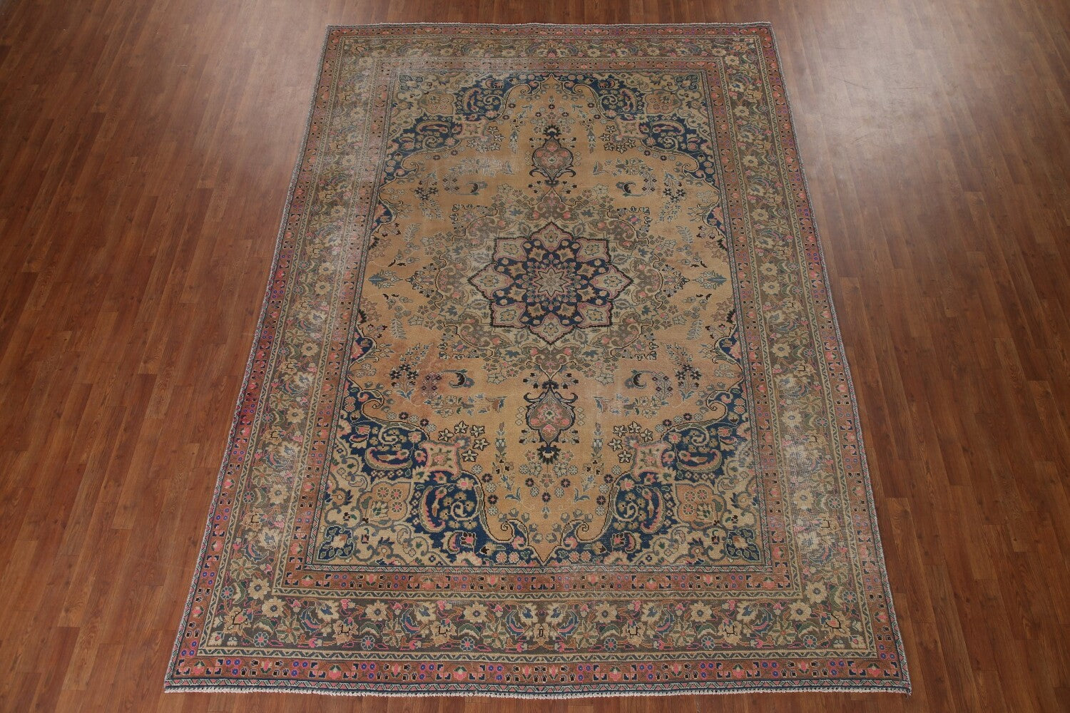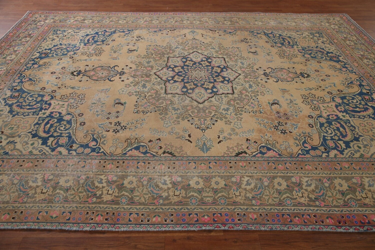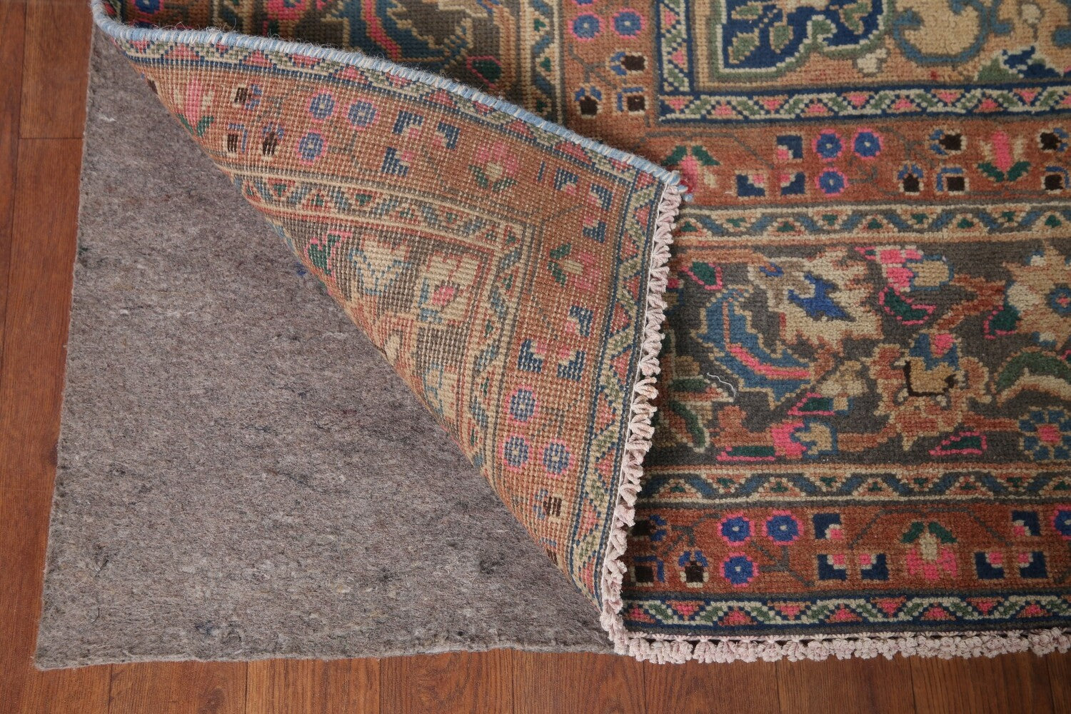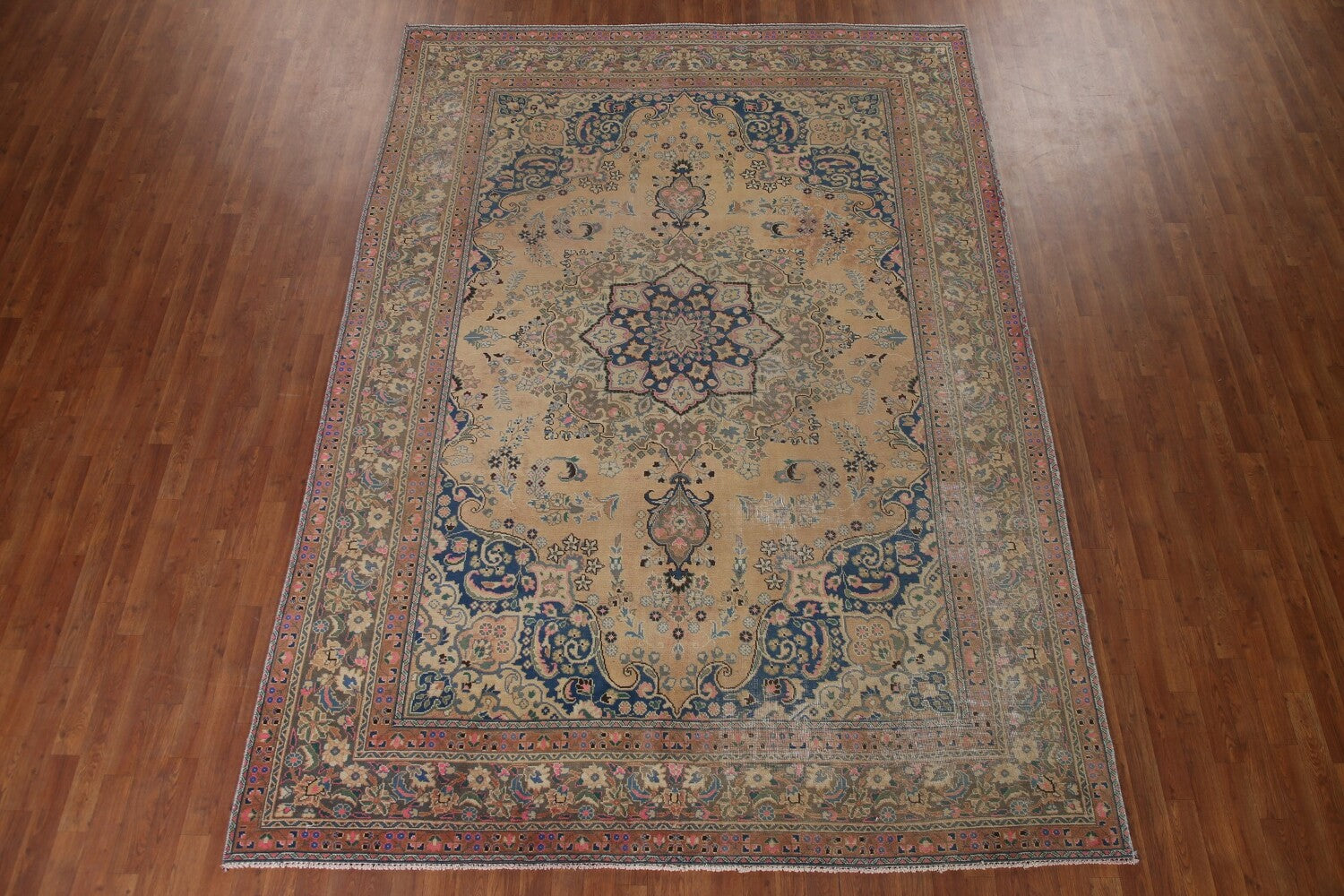 A Beautiful Genuine Persia ( Persia ) Mashad rug is Hand Knotted by skillful weavers in Persia ( Persia ) with 100% Wool Material. This rug is in Very Good (Evenly Low Pile) condition. dimensions are 11' 1'' X 7' 11'' in foot and 338 X 241 in centimeter. the primary color is Peach.