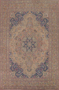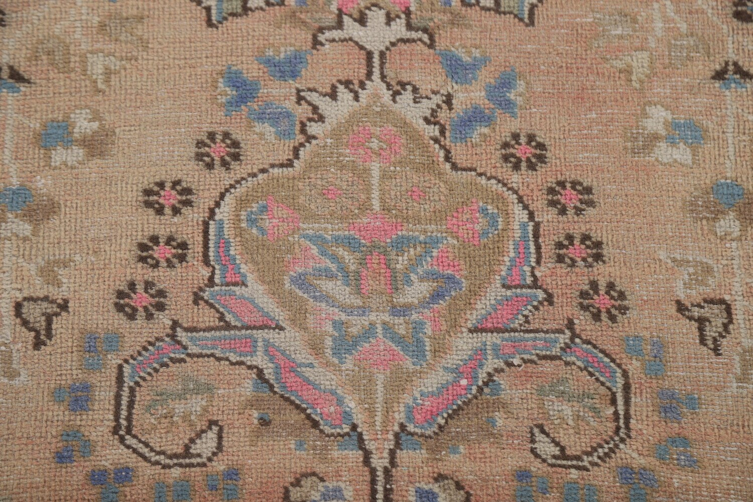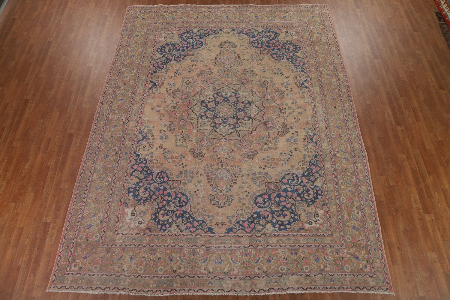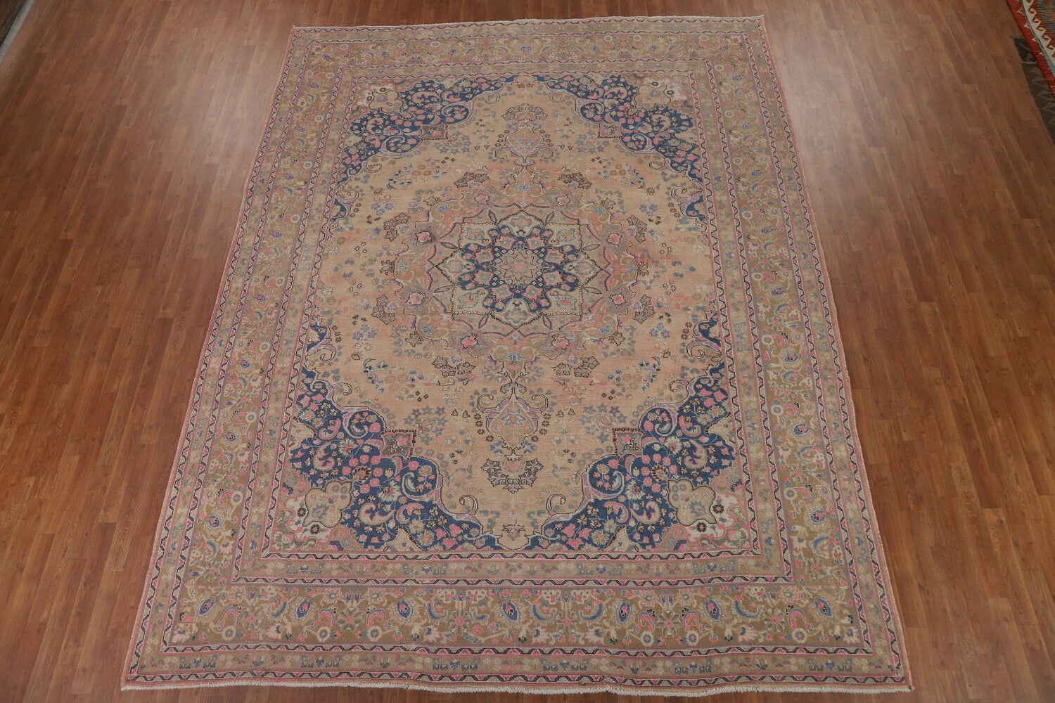 A Beautiful Genuine Persia ( Persia ) Mashad rug is Hand Knotted by skillful weavers in Persia ( Persia ) with 100% Wool Material. This rug is in Very Good (Low Pile) condition. dimensions are 12' 4'' X 9' 5'' in foot and 376 X 287 in centimeter. the primary color is Peach.