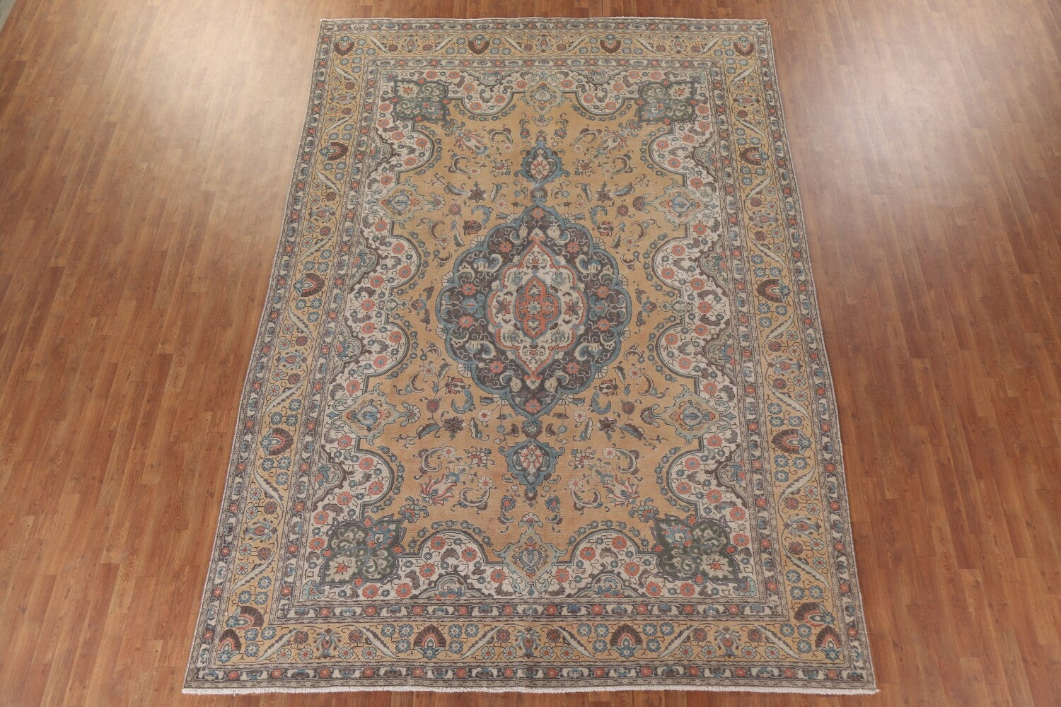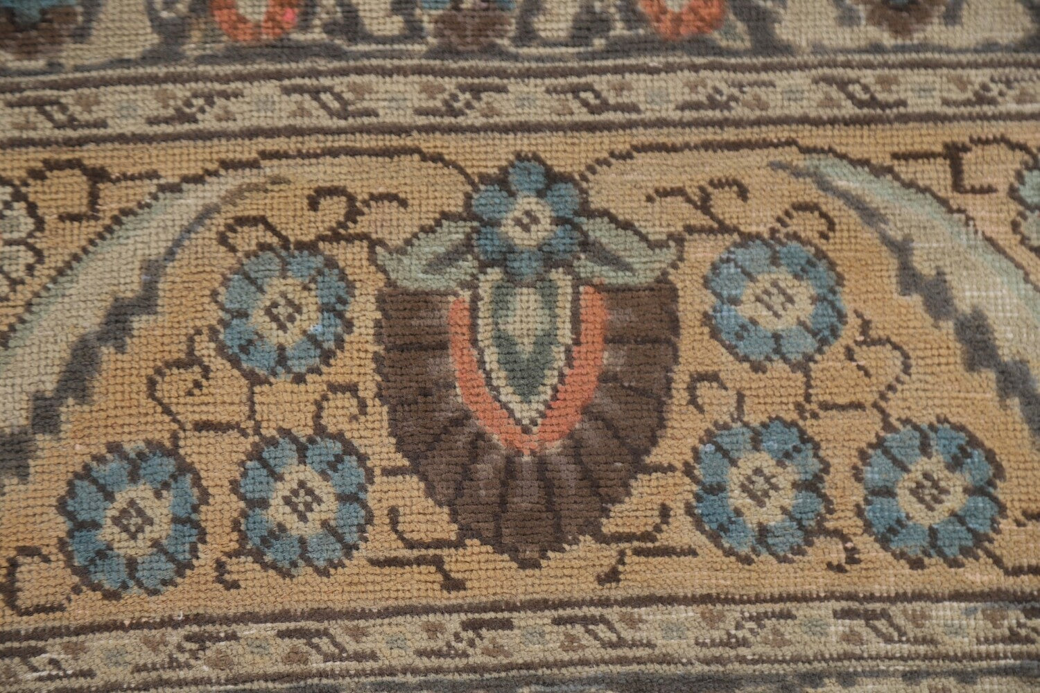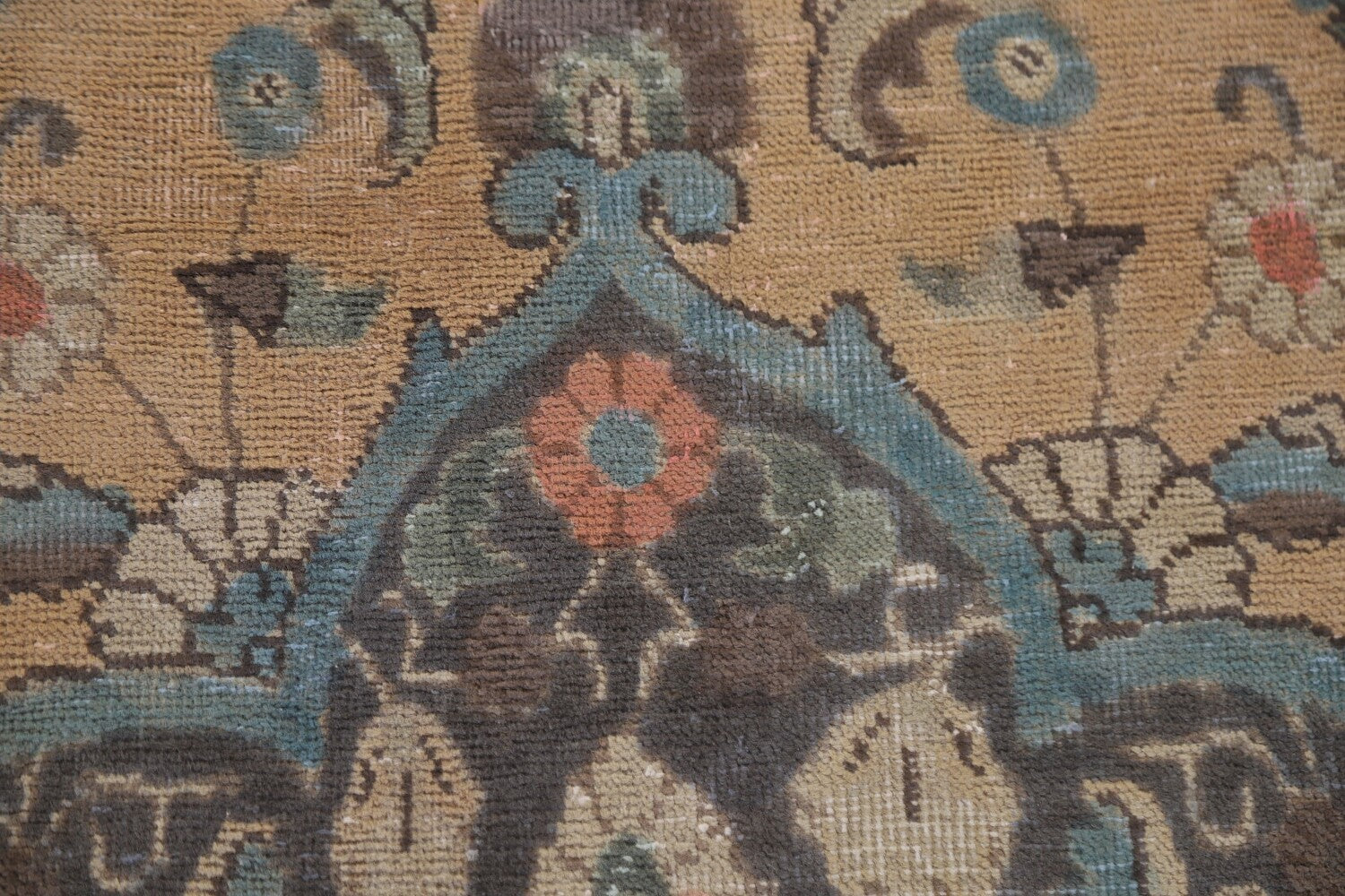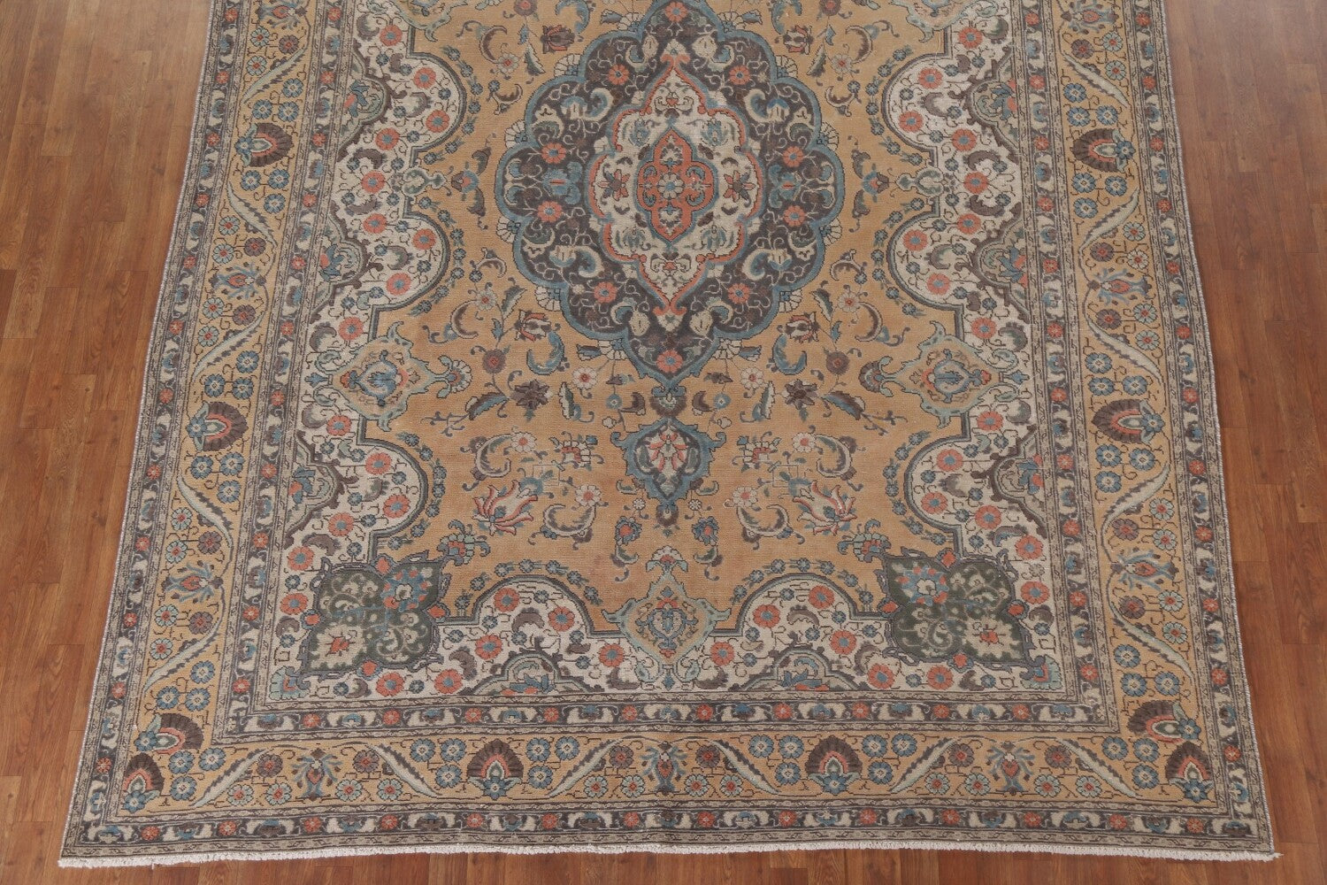 A Beautiful Genuine Persia ( Persia ) Mashad rug is Hand Knotted by skillful weavers in Persia ( Persia ) with 100% Wool Material. This rug is in Very Good (Evenly Low Pile-Repair) condition. dimensions are 12' 7'' X 8' 10'' in foot and 384 X 269 in centimeter. the primary color is Peach.