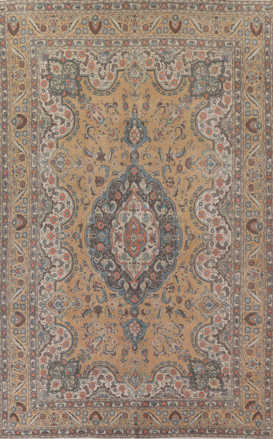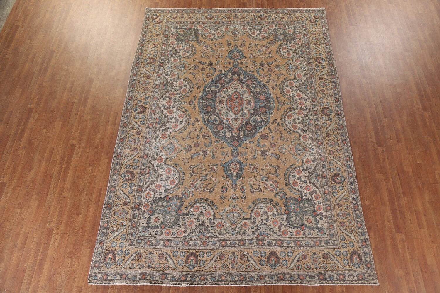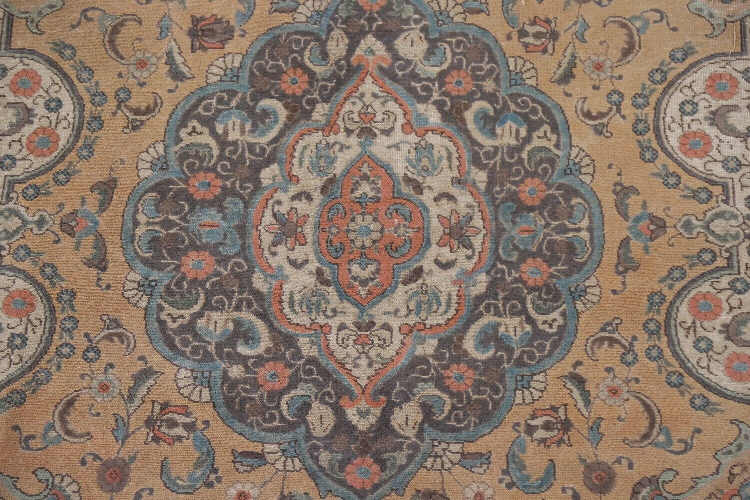 A Beautiful Genuine Persia ( Persia ) Mashad rug is Hand Knotted by skillful weavers in Persia ( Persia ) with 100% Wool Material. This rug is in Very Good (Evenly Low Pile-Repair) condition. dimensions are 12' 7'' X 8' 10'' in foot and 384 X 269 in centimeter. the primary color is Peach.