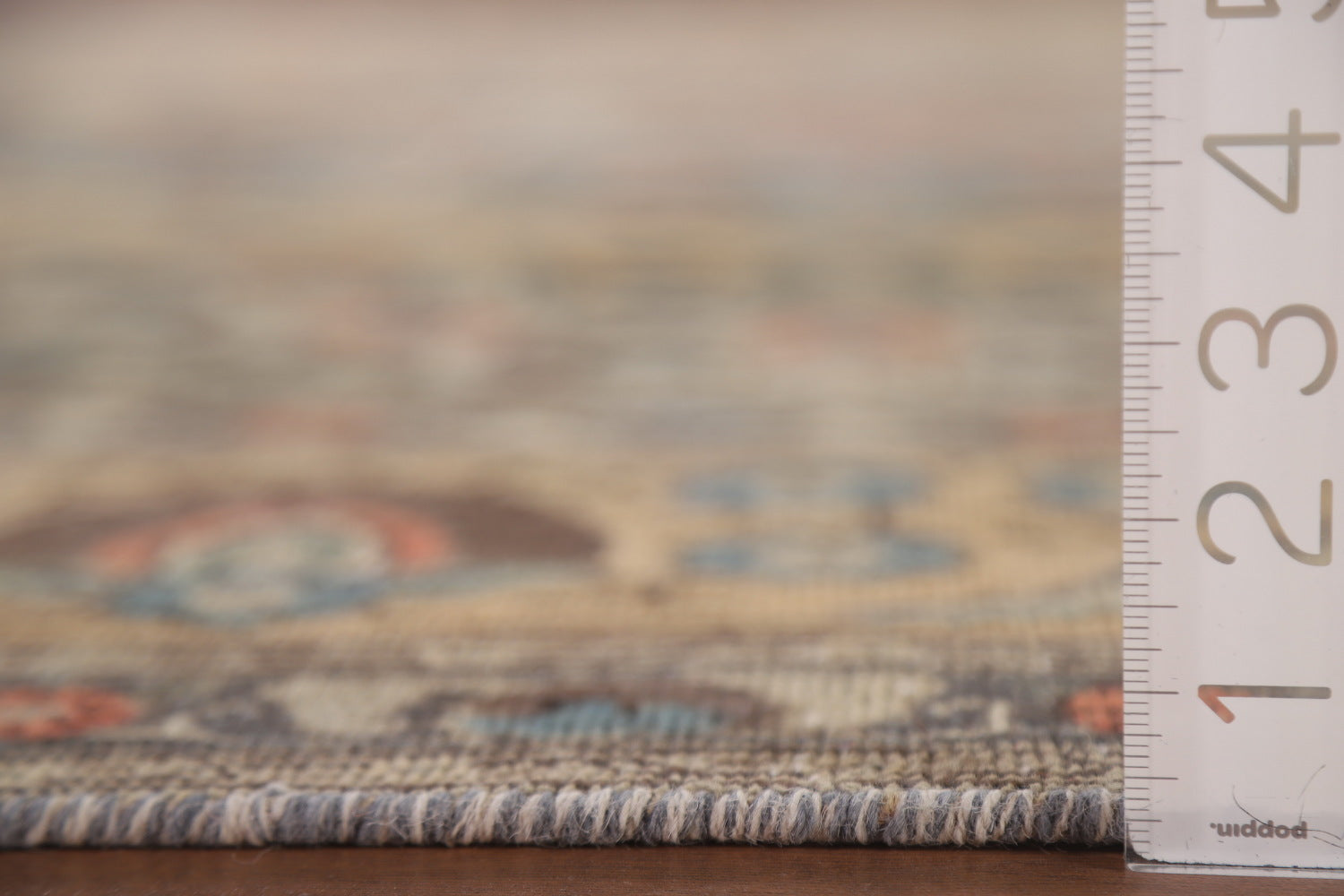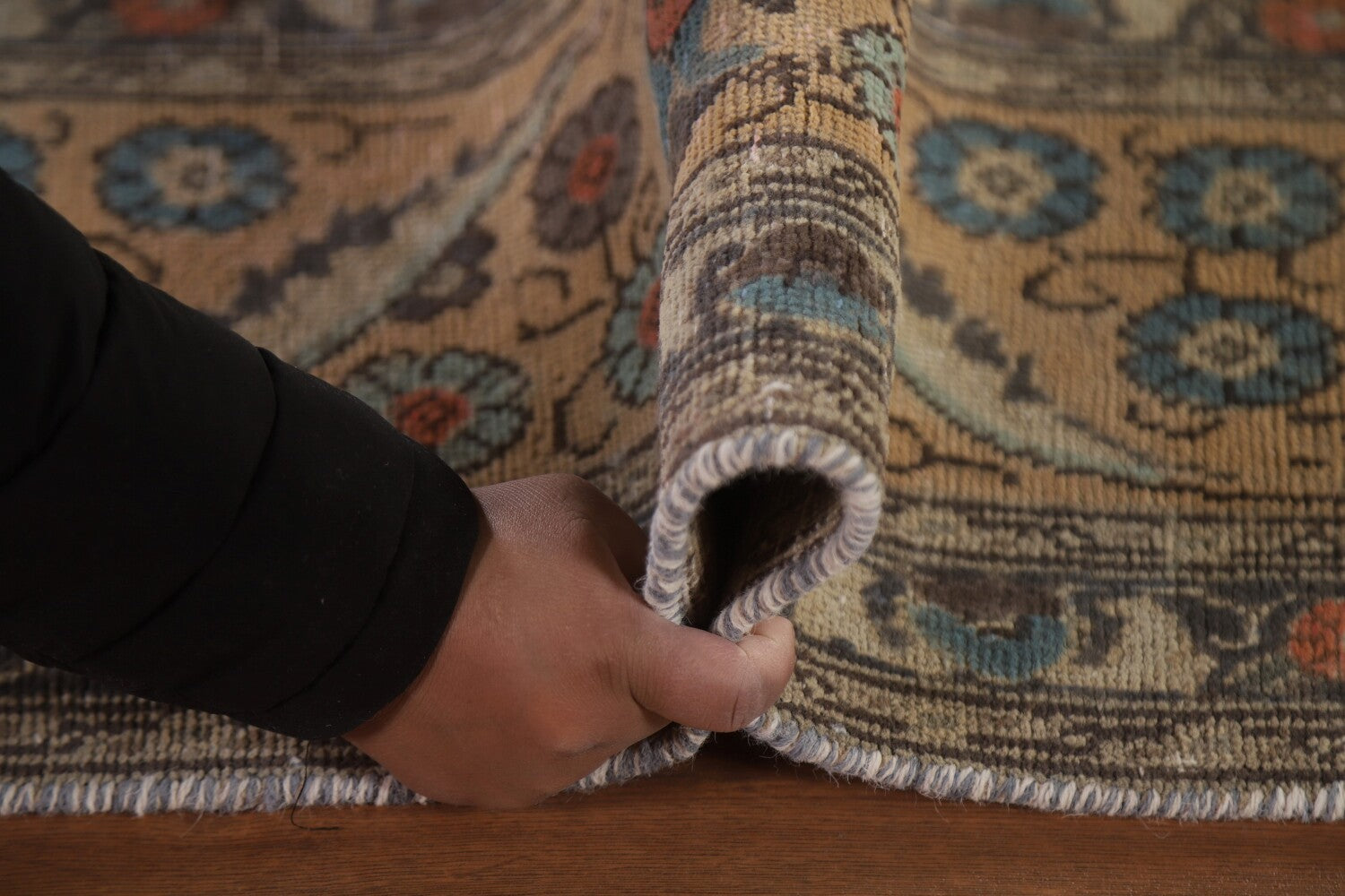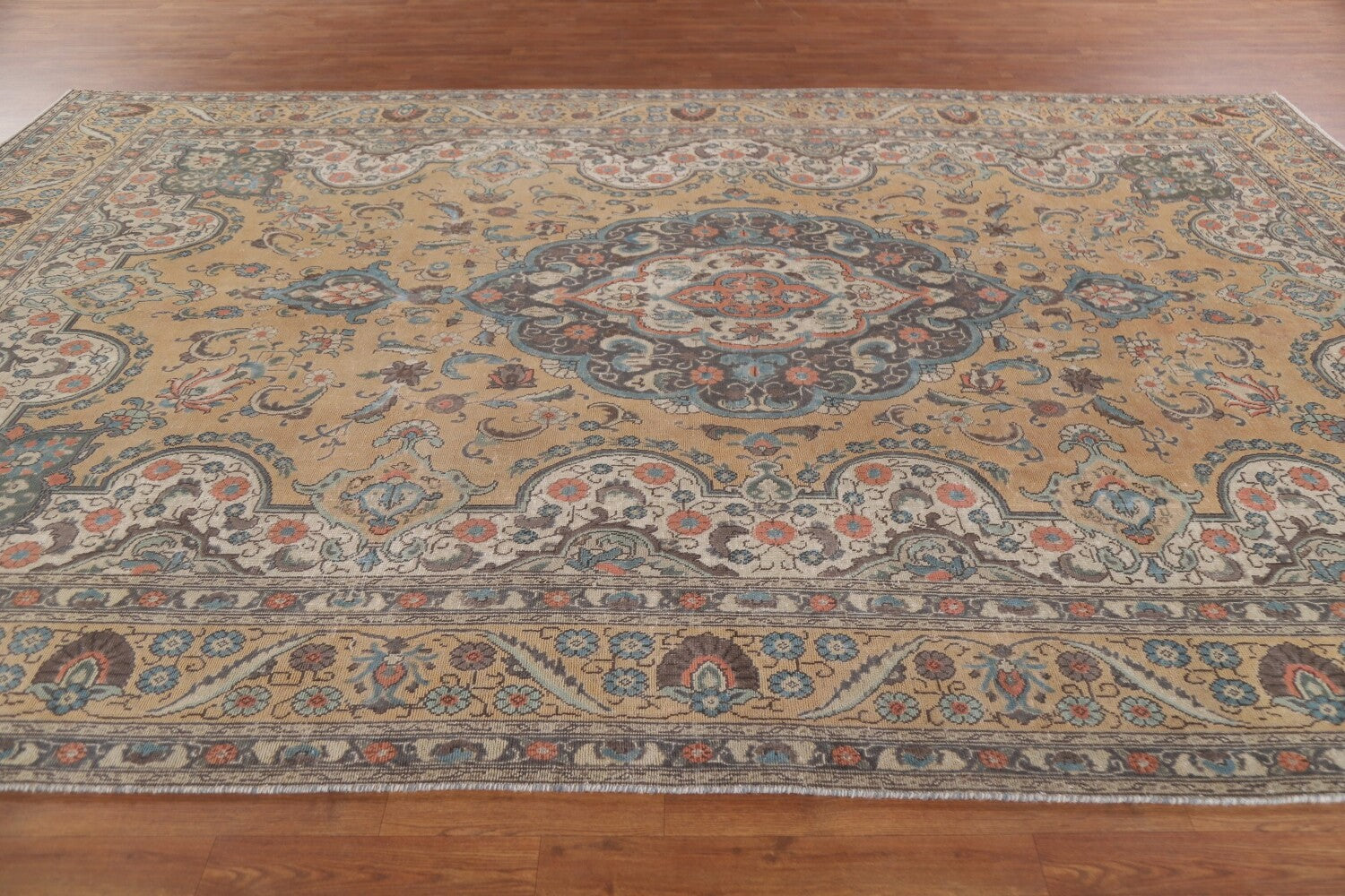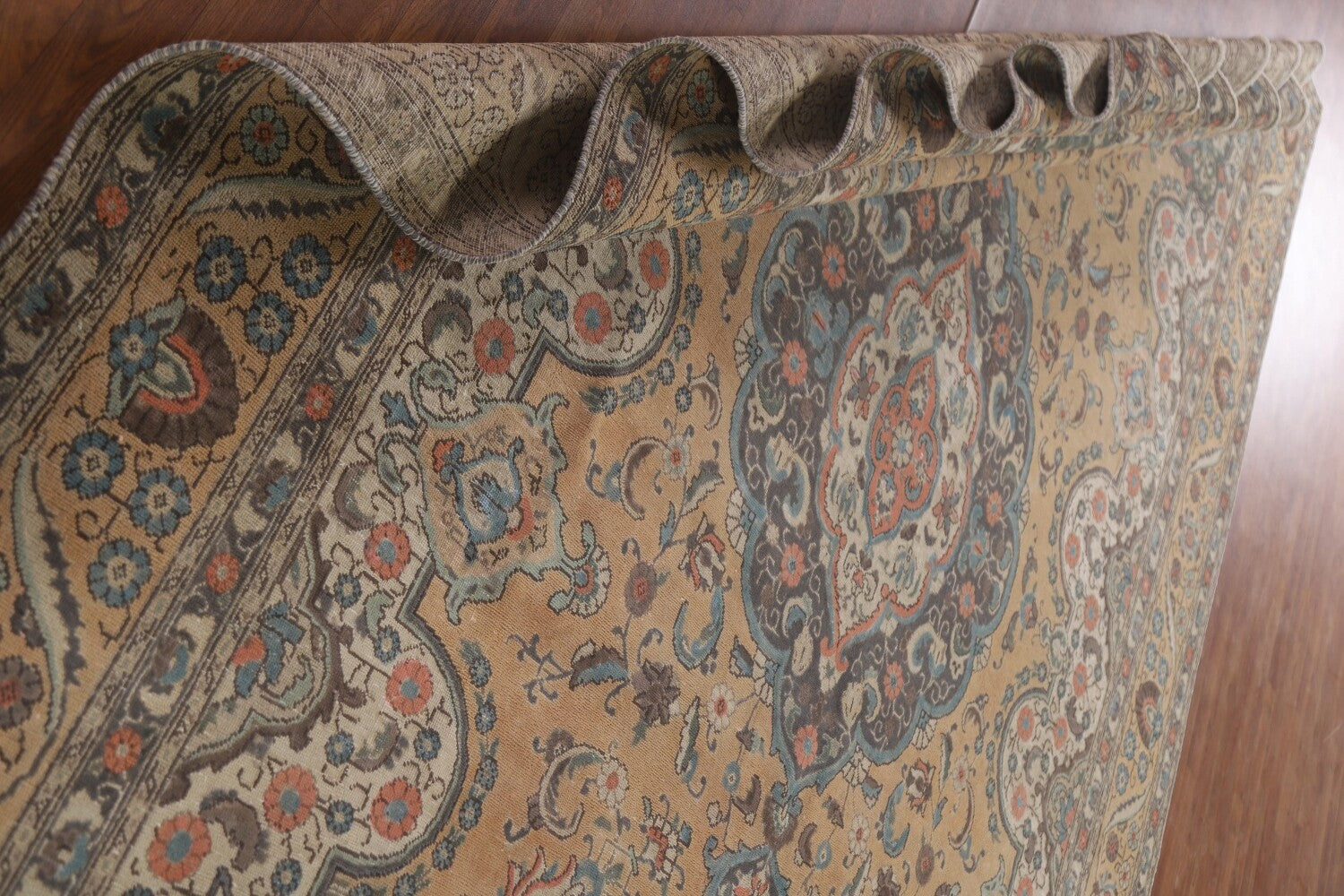 A Beautiful Genuine Persia ( Persia ) Mashad rug is Hand Knotted by skillful weavers in Persia ( Persia ) with 100% Wool Material. This rug is in Very Good (Evenly Low Pile-Repair) condition. dimensions are 12' 7'' X 8' 10'' in foot and 384 X 269 in centimeter. the primary color is Peach.