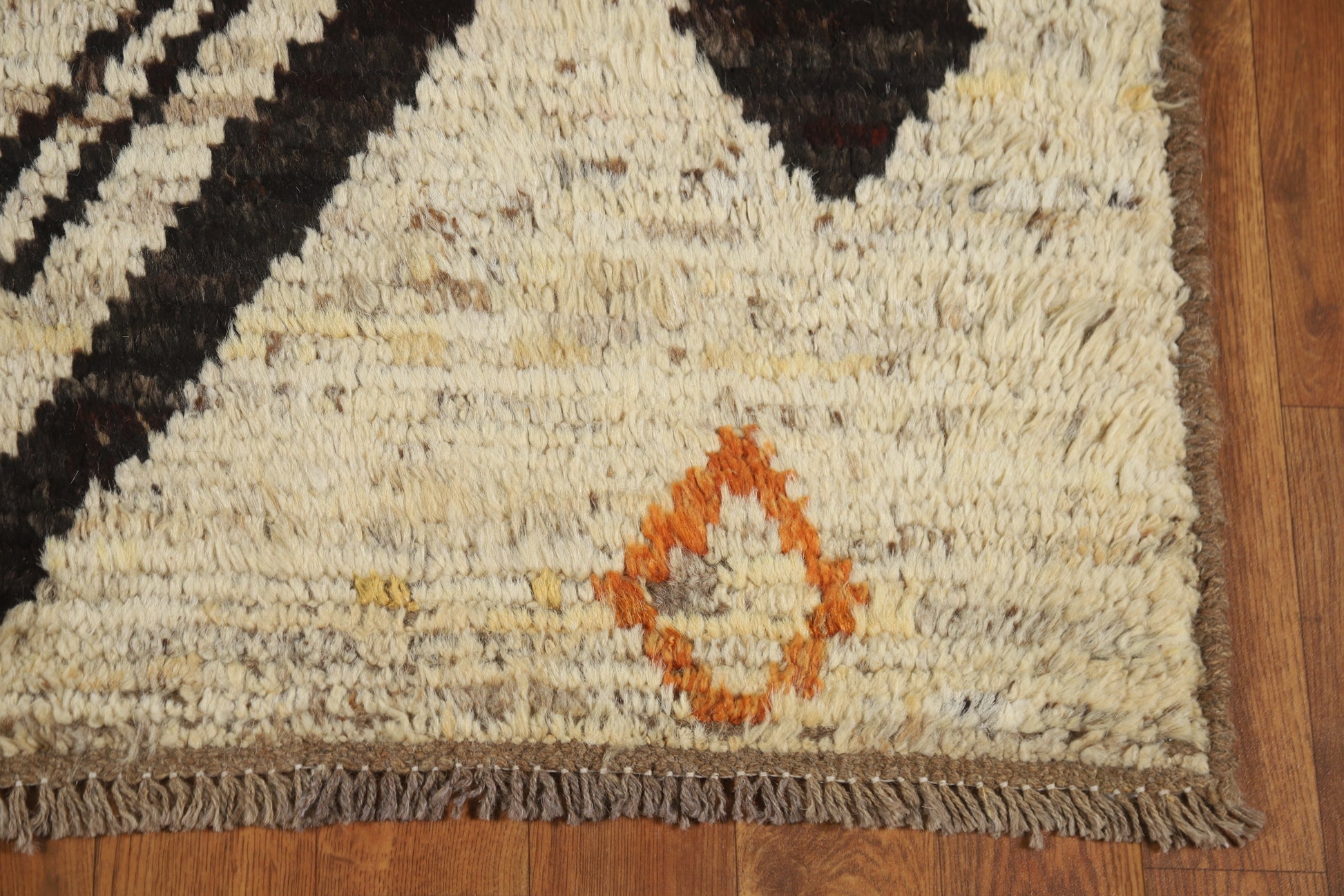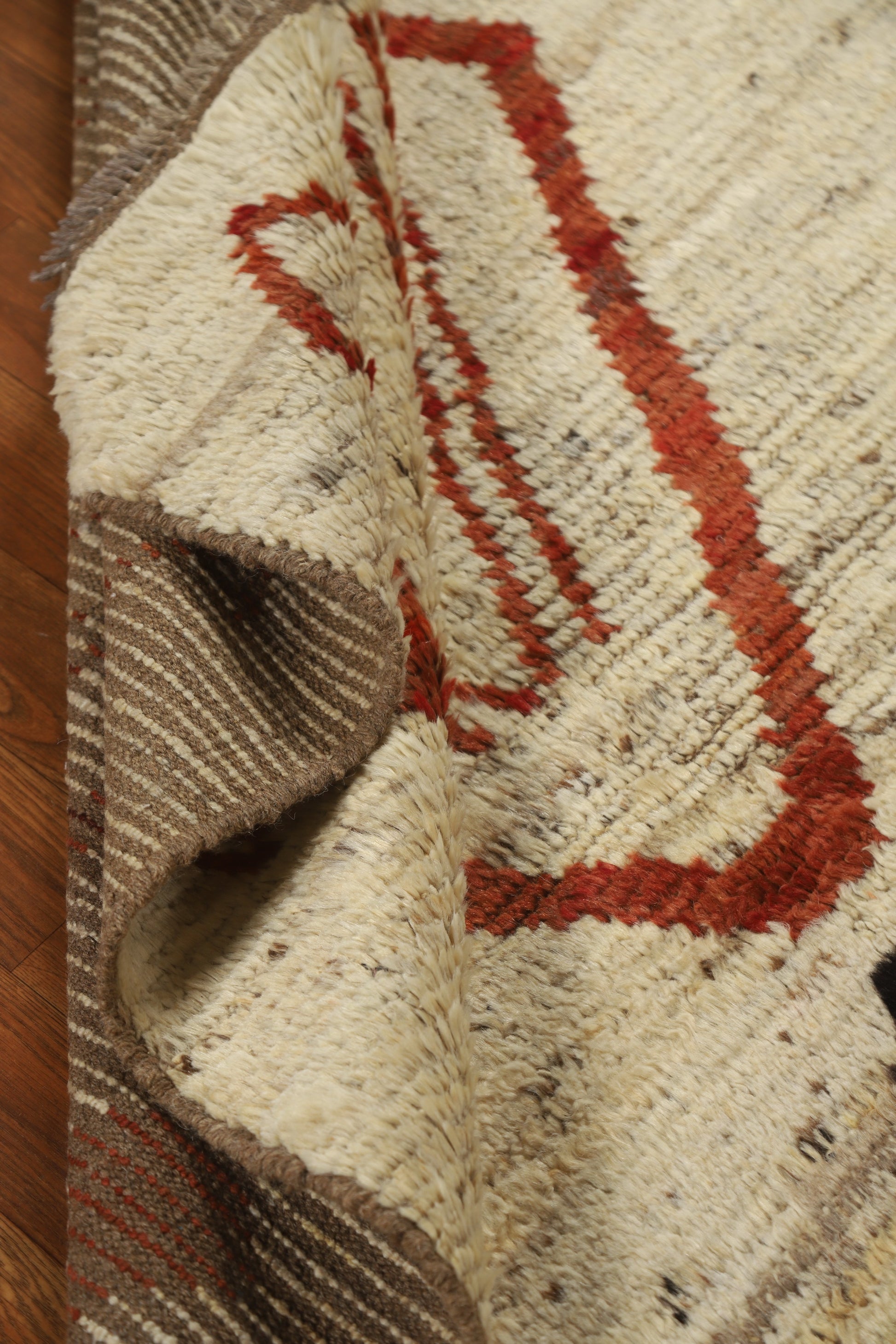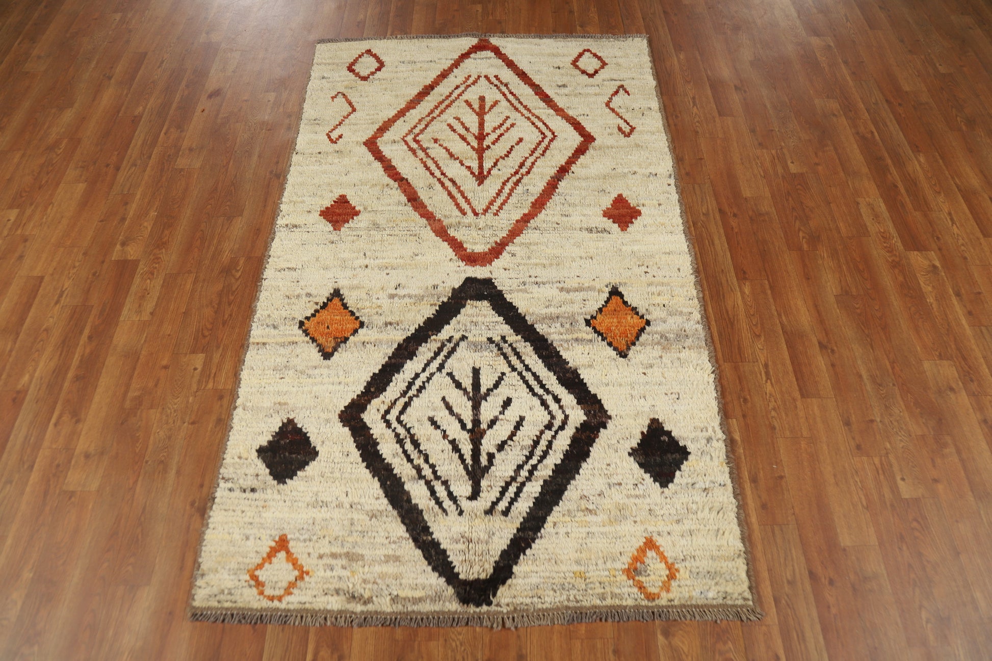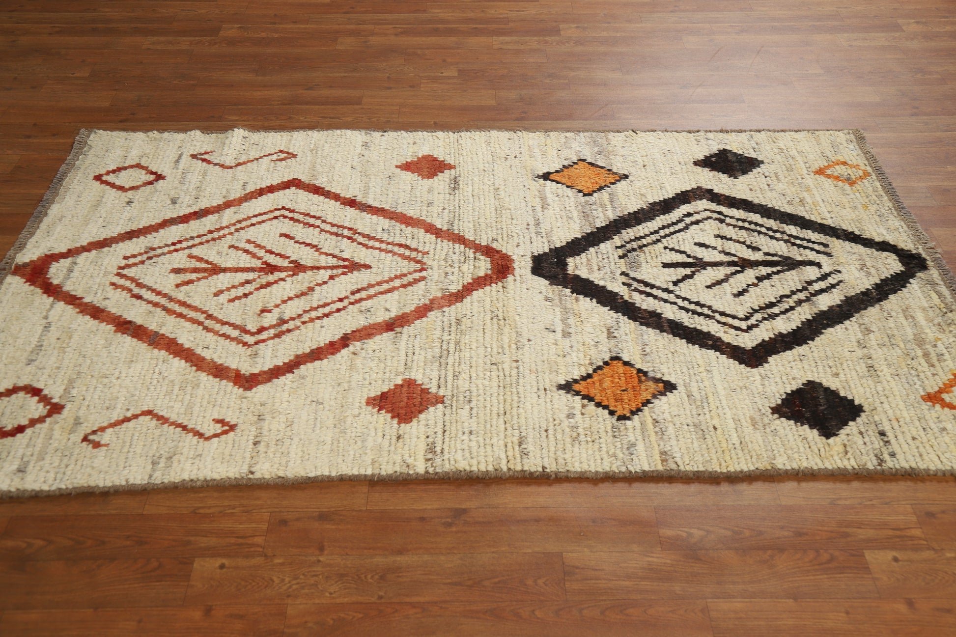 A Beautiful Genuine Pakistan Moroccan rug is Hand Knotted by skillful weavers in Pakistan with 100% Wool Material. This rug is in New, First Quality condition. dimensions are 6' 2'' X 3' 9'' in foot and 188 X 114 in centimeter. the primary color is Beige & Ivories.