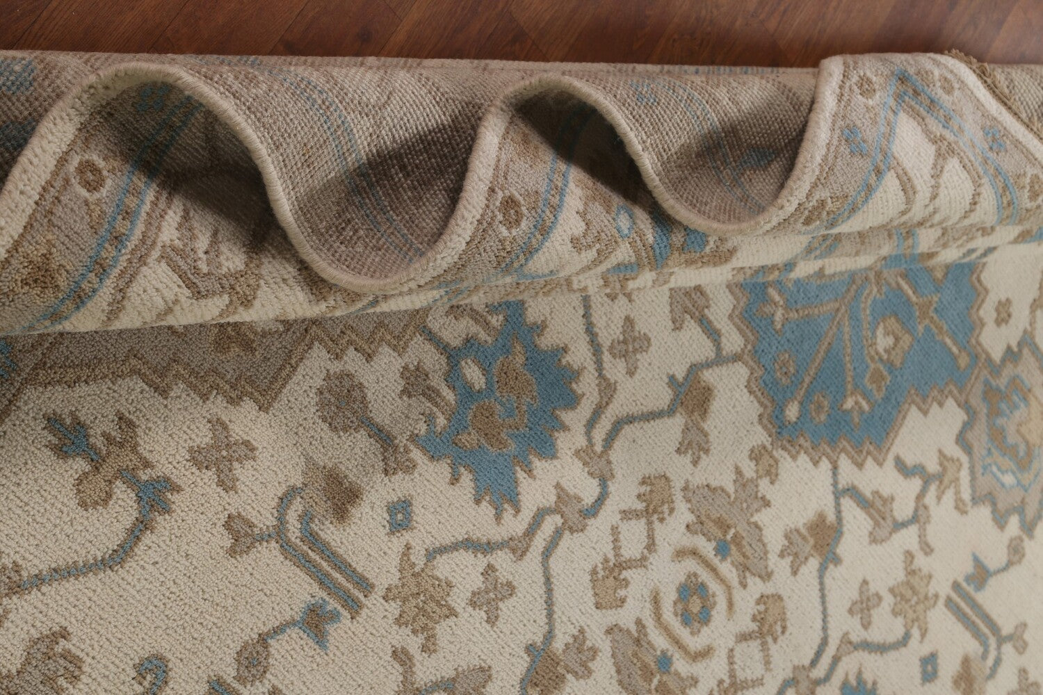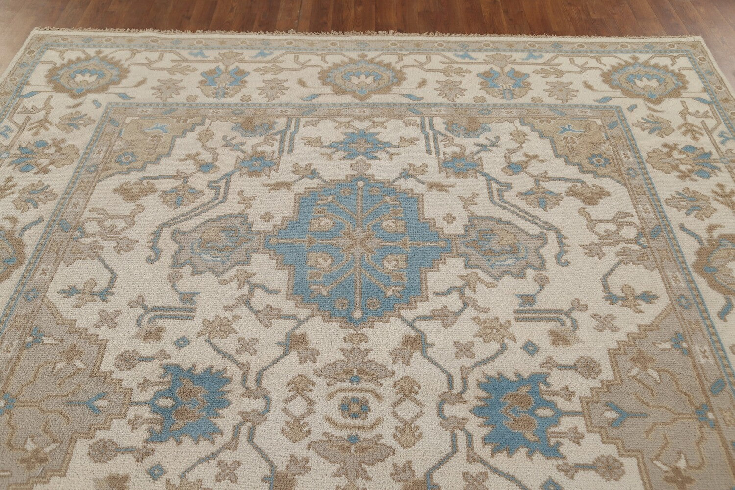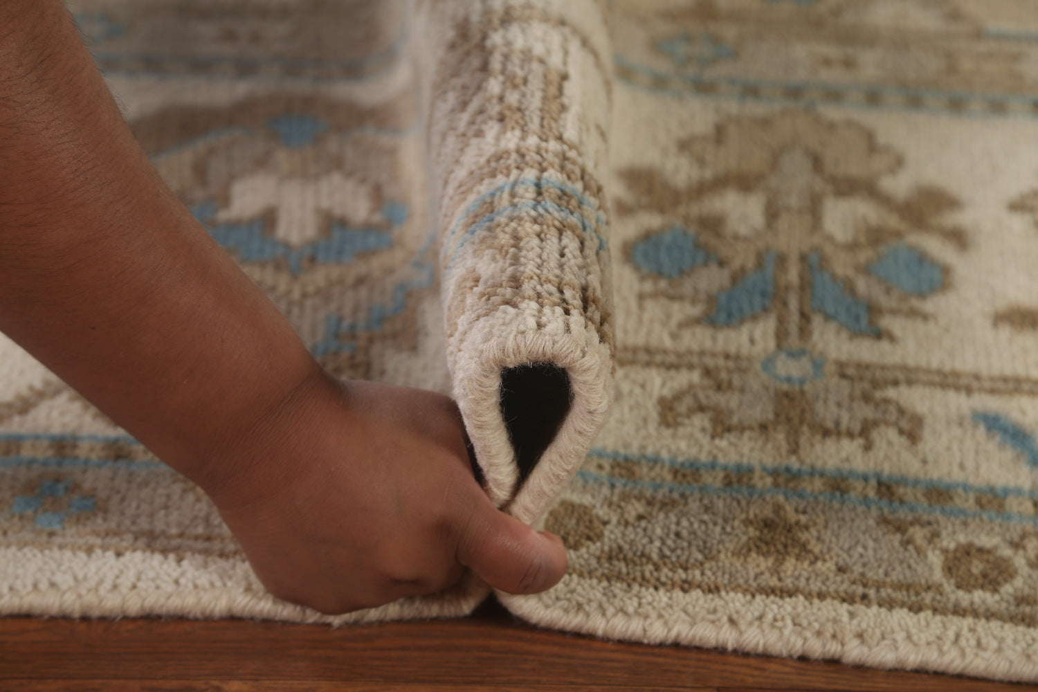 A Beautiful Genuine India Oushak rug is Hand Knotted by skillful weavers in India with 100% Wool Material. This rug is in condition. dimensions are 10' 2'' X 8' 0'' in foot and 310 X 244 in centimeter. the primary color is Beige & Ivories.