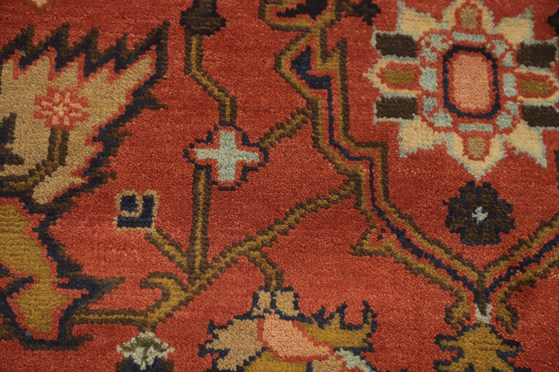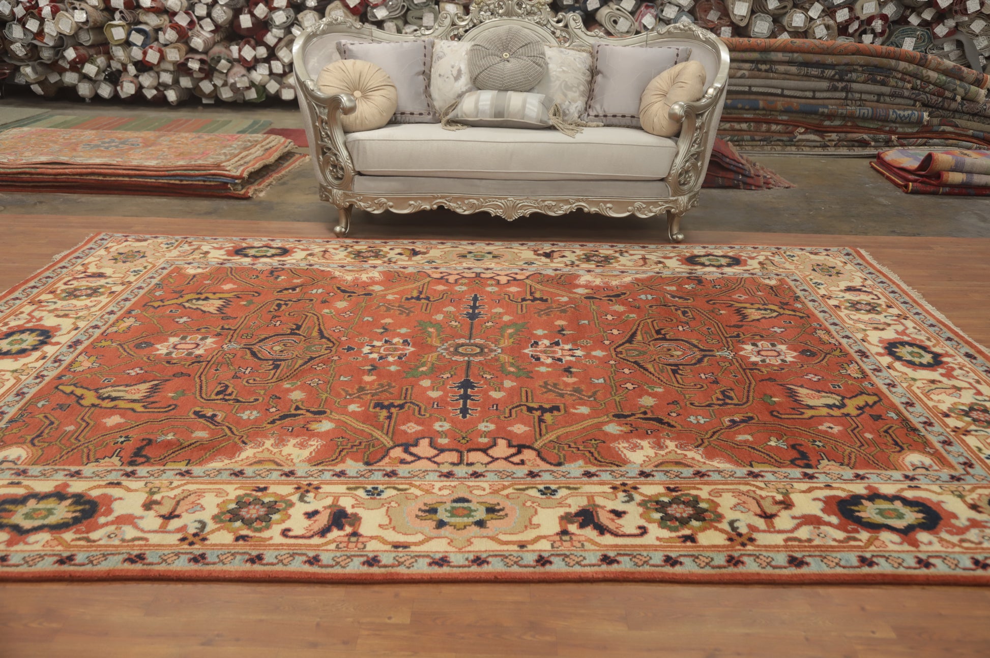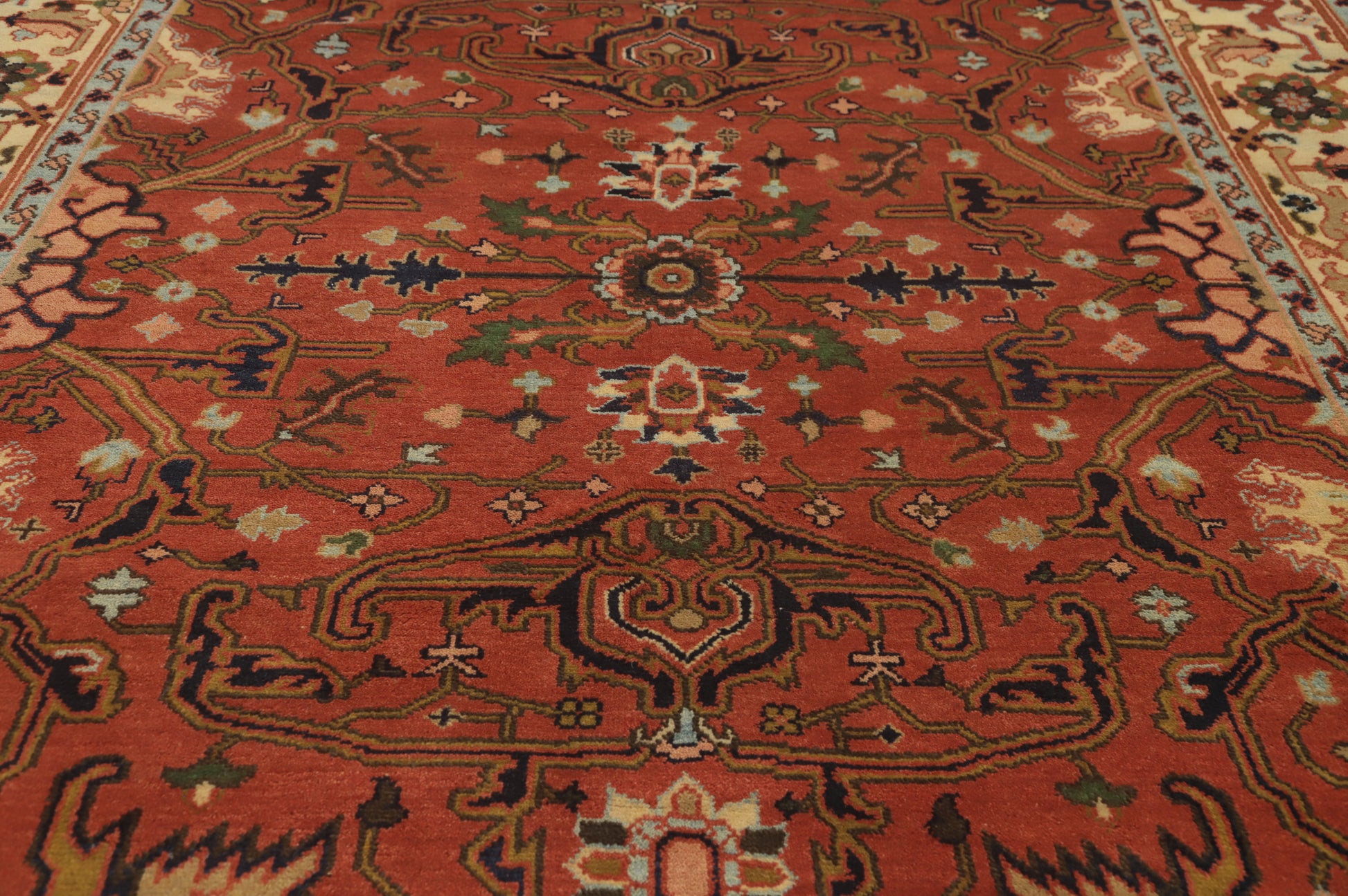 A Beautiful Genuine India Oushak rug is Hand Knotted by skillful weavers in India with 100% Wool Material. This rug is in New, First Quality condition. dimensions are 12' 1'' X 8' 11'' in foot and 368 X 272 in centimeter. the primary color is Oranges & Rust.